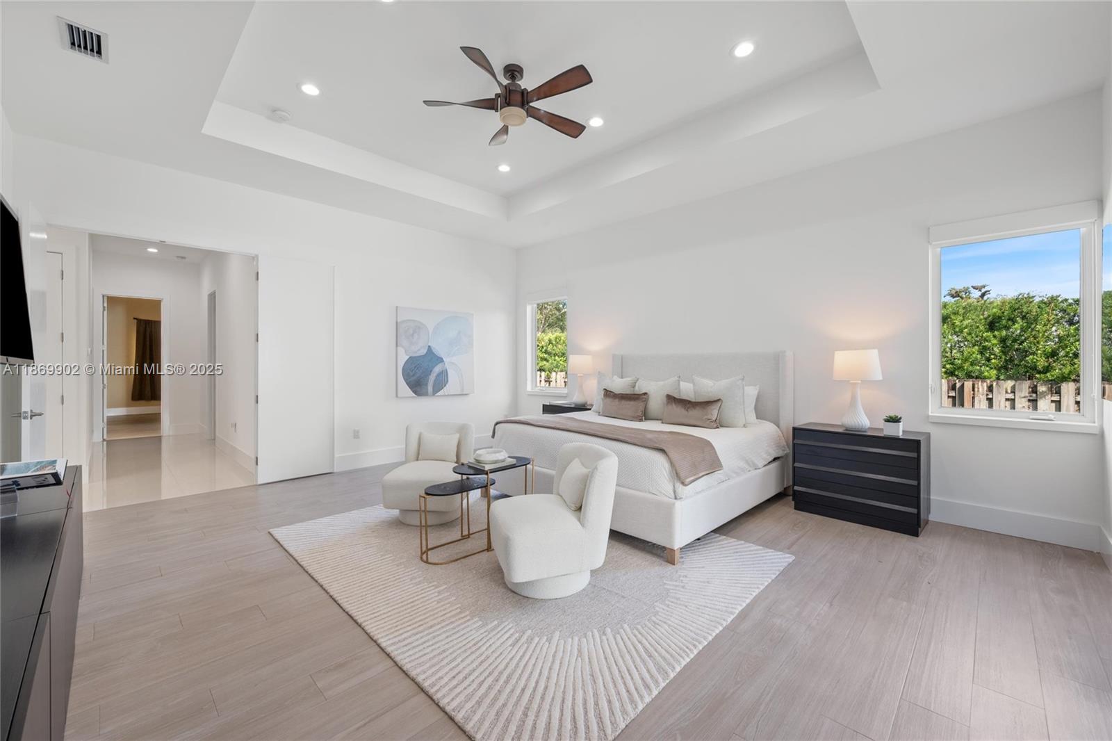 Built in 2019 by a contractor. This beautiful 4,500+ SQFT, 4-BD, 5-BA home sits on a sizable 18k+ SF lot. The residence showcases beautiful curb appeal on quiet block. Walk into 13 foot ceilings with custom oversize 8 ft doors. An eat-in kitchen offering marble & granite countertops, stainless-steel appliances, built-in island/table doubles as seating, & walk-in pantry for extra storage. The open layout seamlessly connects the kitchen, & family rooms with sliding doors to the patio, merging indoor and outdoor entertainment areas. Enjoy your backyard all year round, covered patio, & plenty of room to entertain guests. Additional features include an irrigation with well water, Generator, impact, 2-car garage, pre-wired for security cameras & surround sound.