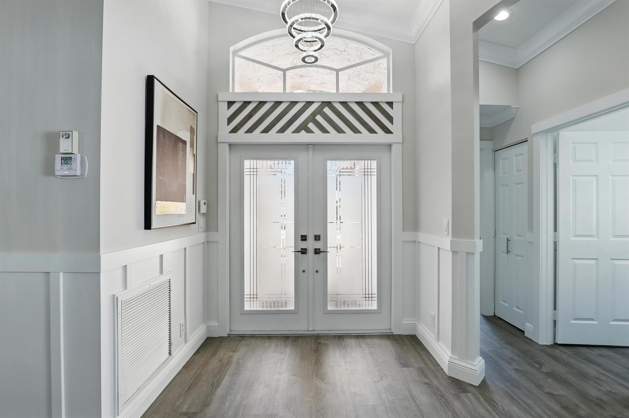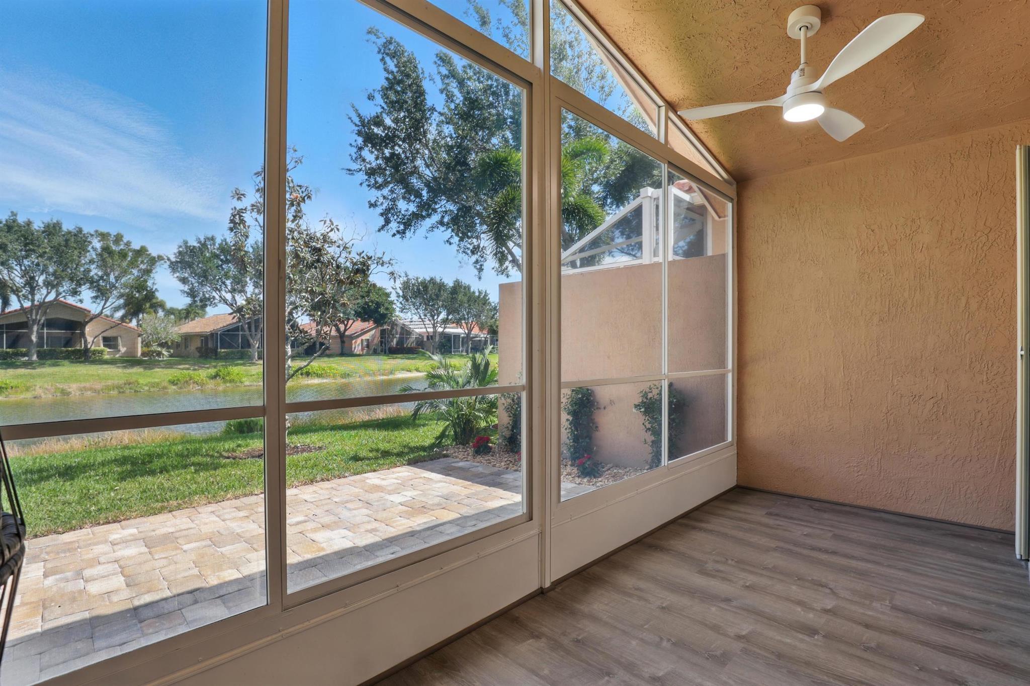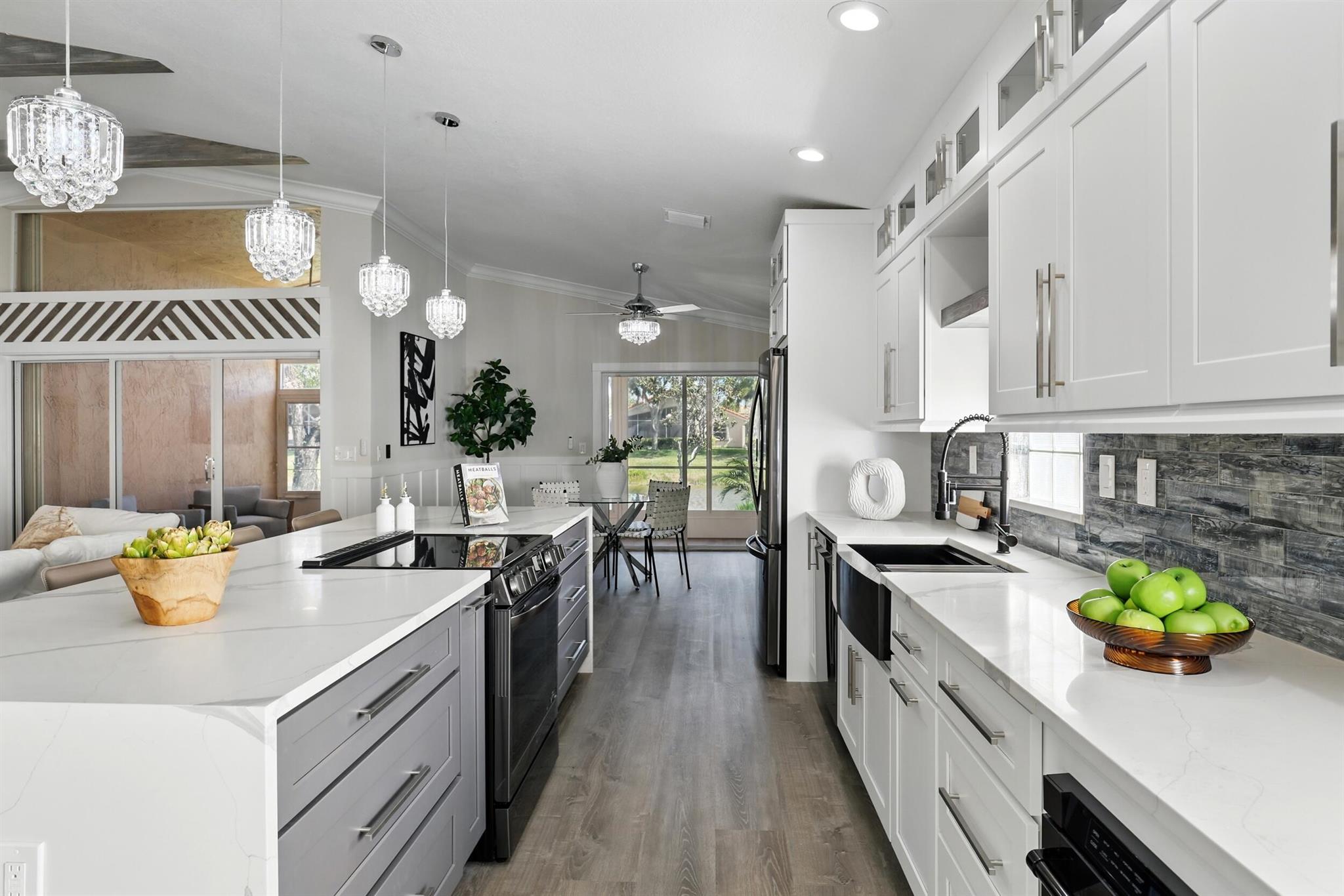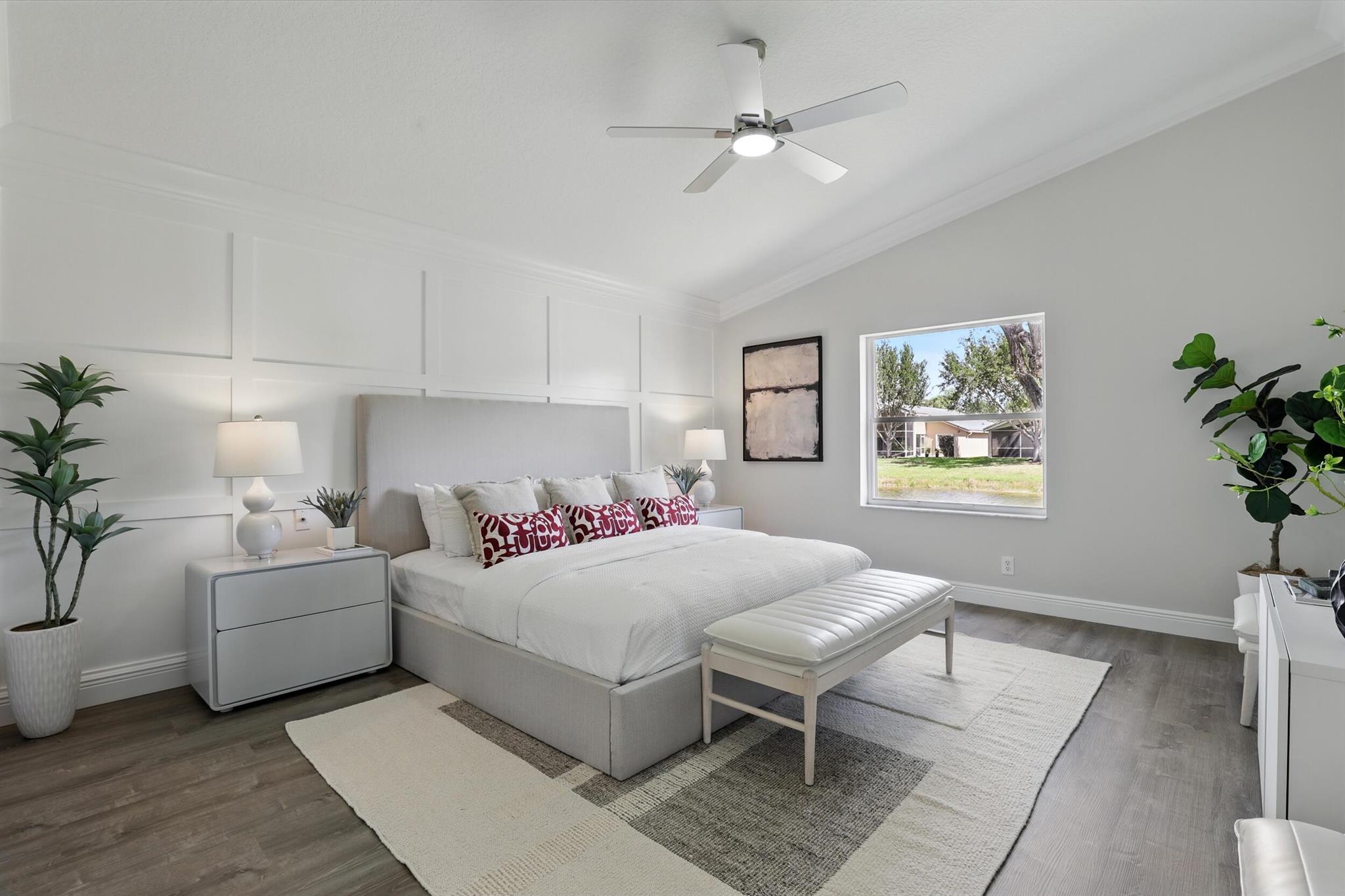 Updated from top to bottom! STUNNING, LAKEFRONT home featuring 3 bedrooms, 2 baths, and a spacious 2-car garage. Including a BRAND-NEW ROOF (2025) Hot water heater (2025). Designer finishes throughout include custom shaker cabinetry, quartz countertops with waterfall edging, brand-new black stainless-steel appliances, sleek center island. High ceilings. Premium laminate flooring. The elegant primary suite is set apart for added privacy and features two expansive walk-in closets, luxurious soaking tub & separate glass enclosed shower with seating. Dual sinks. Unwind on your covered screened patio overlooking the lake. Accordion shutters for added storm protection. This home is truly a showpiece! Meticulously upgraded!