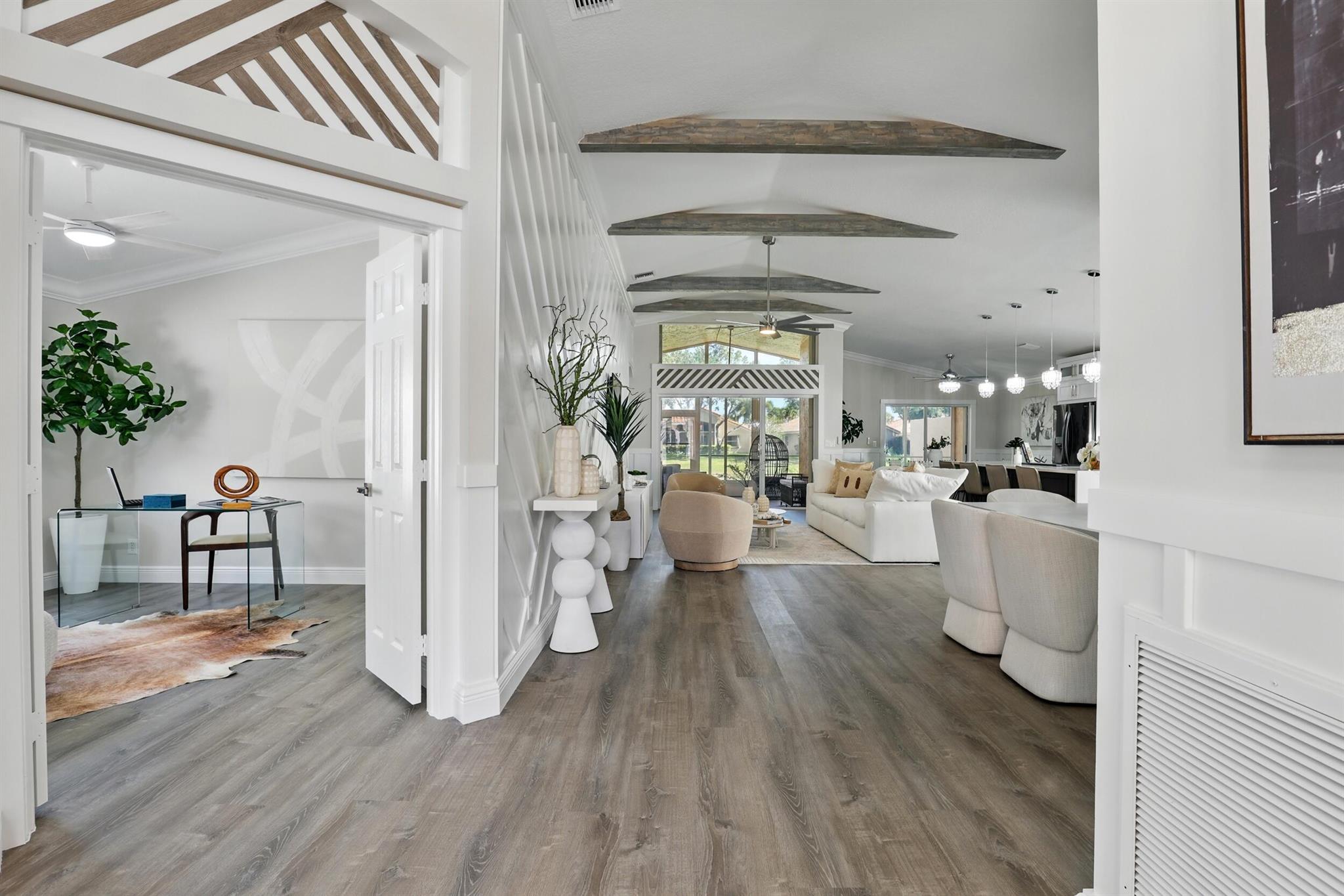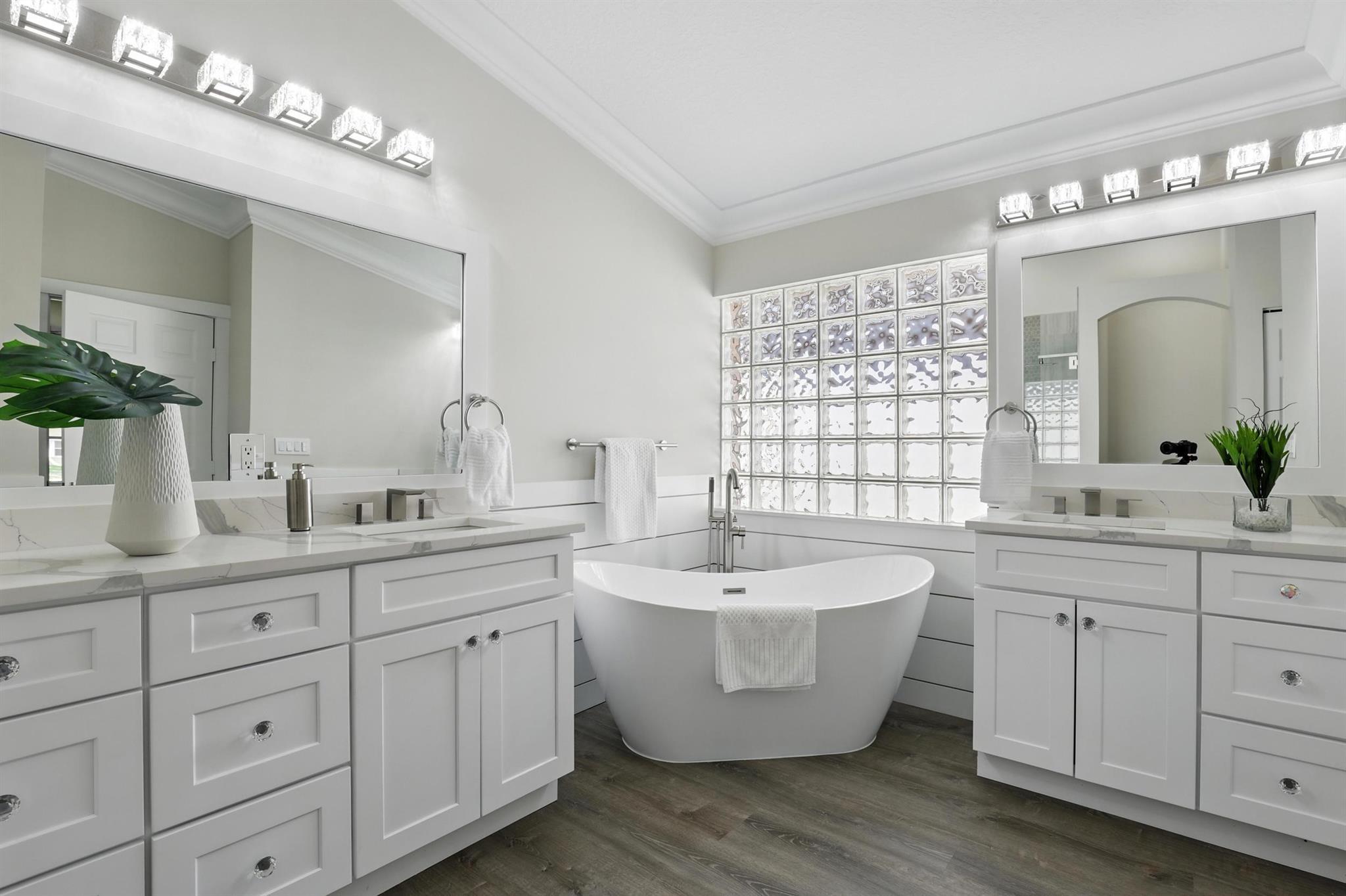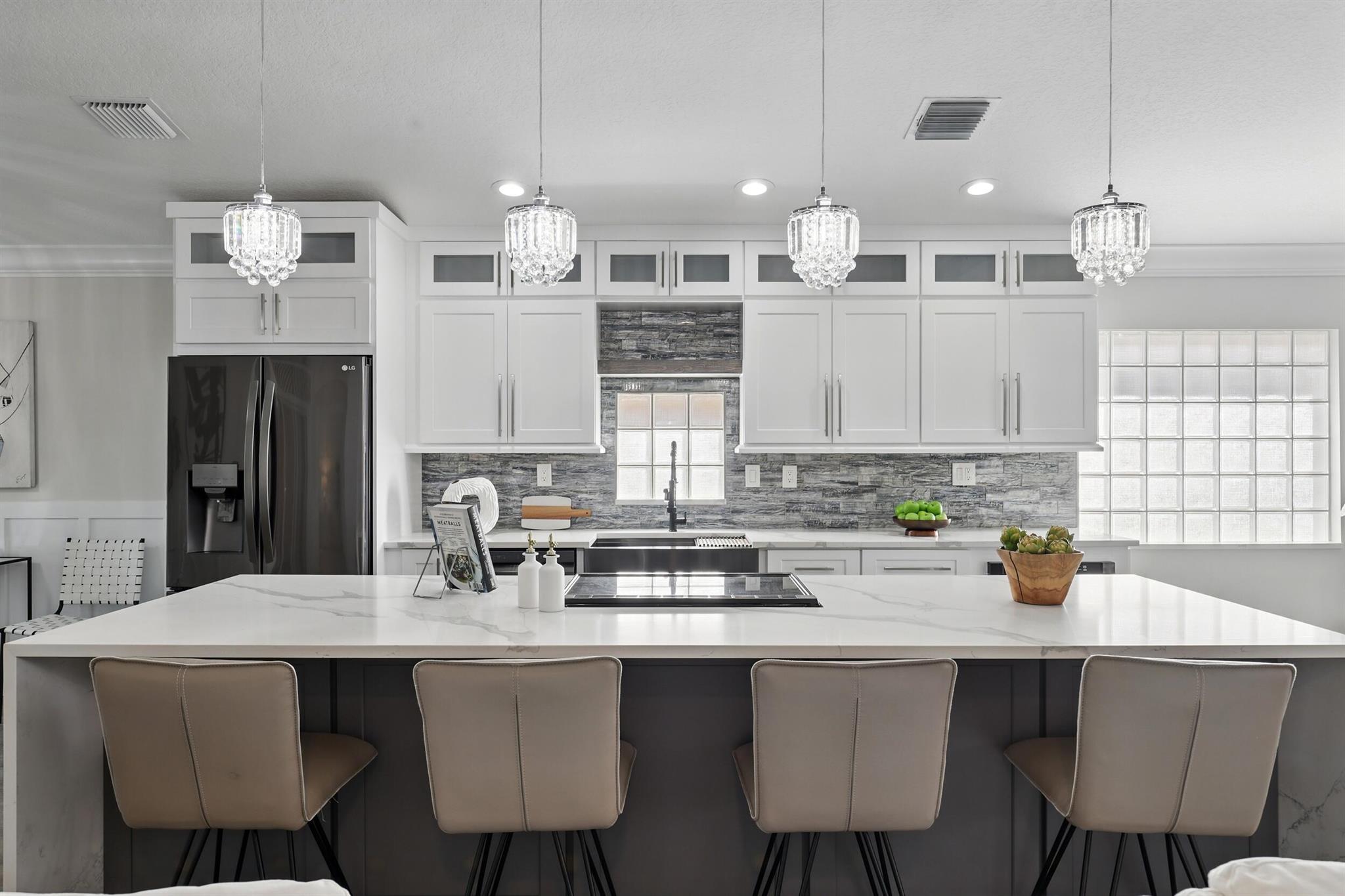 Updated from top to bottom! STUNNING, LAKEFRONT home featuring 3 bedrooms, 2 baths, and a spacious 2-car garage. Including a BRAND-NEW ROOF (2025) Hot water heater (2025). Designer finishes throughout include custom shaker cabinetry, quartz countertops with waterfall edging, brand-new black stainless-steel appliances, sleek center island. High ceilings. Premium laminate flooring. The elegant primary suite is set apart for added privacy and features two expansive walk-in closets, luxurious soaking tub & separate glass enclosed shower with seating. Dual sinks. Unwind on your covered screened patio overlooking the lake. Accordion shutters for added storm protection. This home is truly a showpiece! Meticulously upgraded!