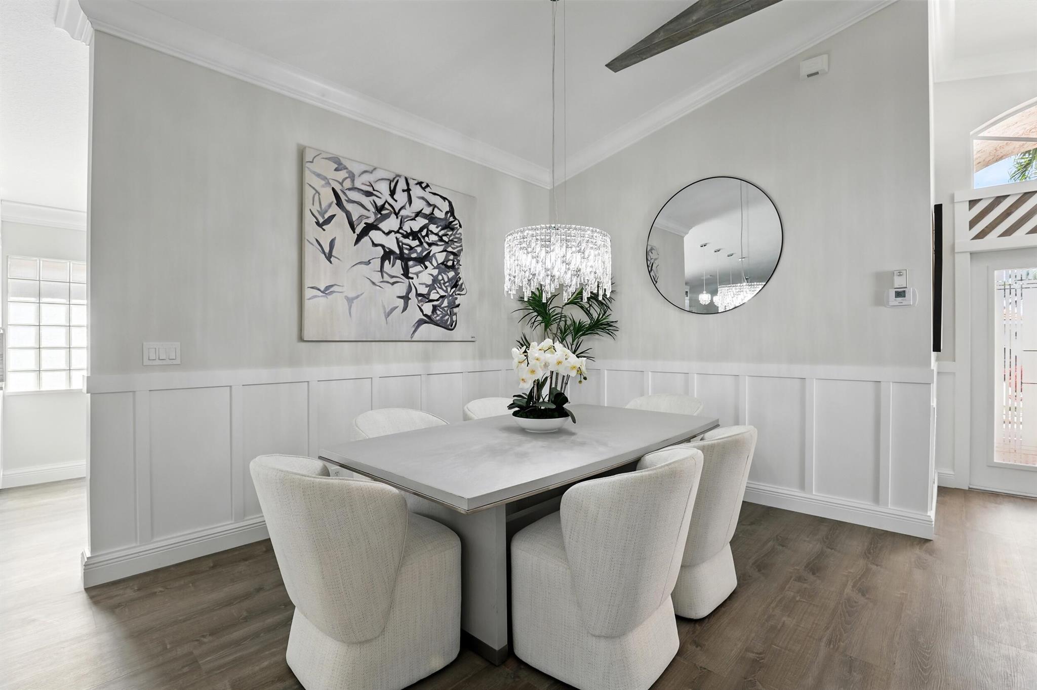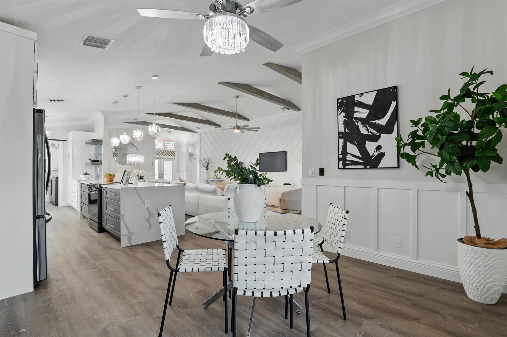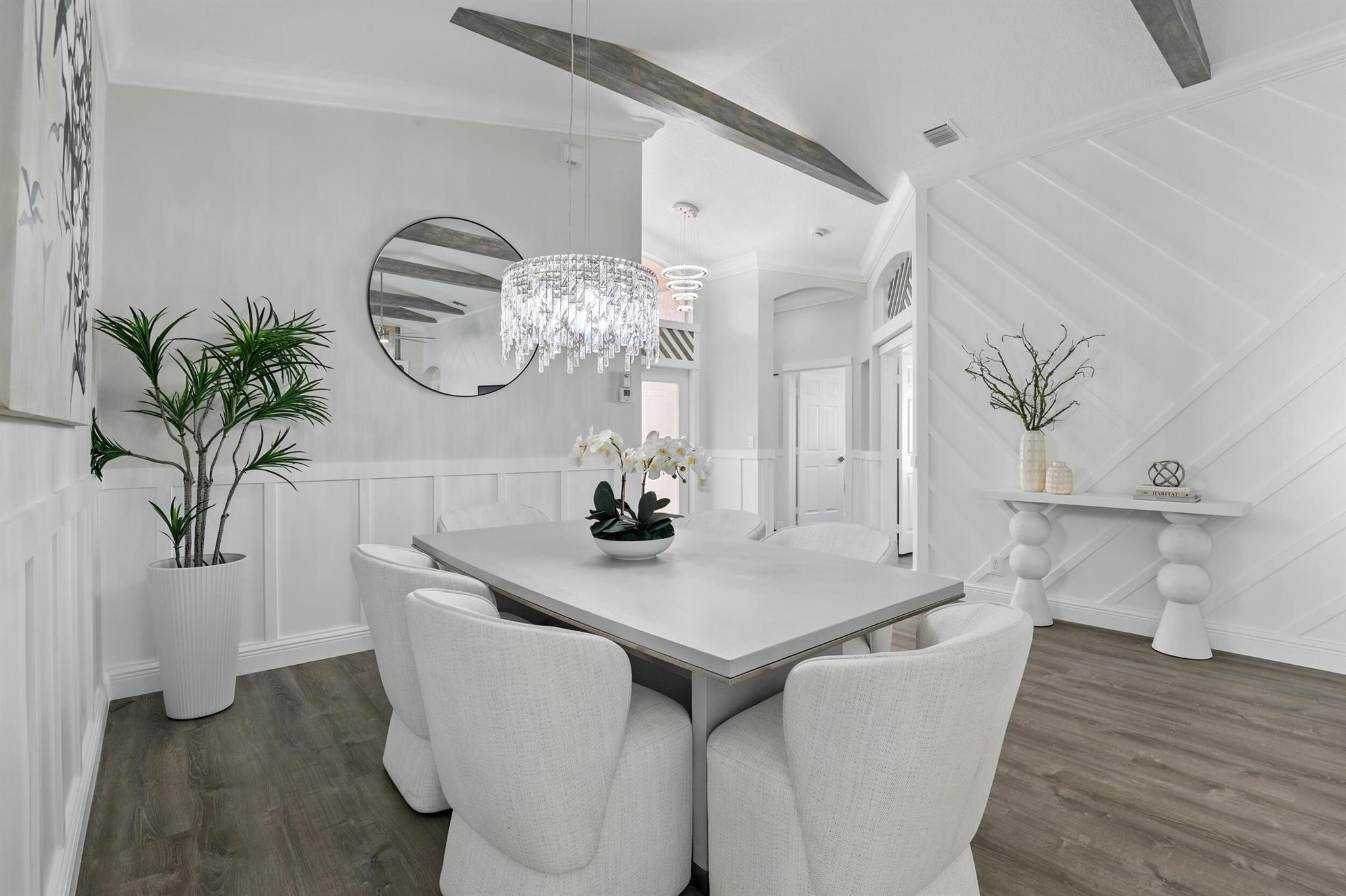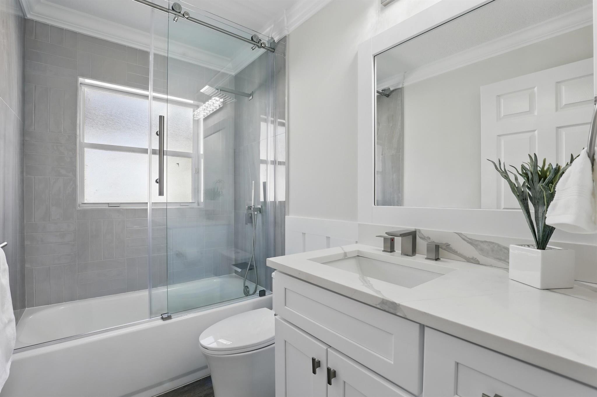 Updated from top to bottom! STUNNING, LAKEFRONT home featuring 3 bedrooms, 2 baths, and a spacious 2-car garage. Including a BRAND-NEW ROOF (2025) Hot water heater (2025). Designer finishes throughout include custom shaker cabinetry, quartz countertops with waterfall edging, brand-new black stainless-steel appliances, sleek center island. High ceilings. Premium laminate flooring. The elegant primary suite is set apart for added privacy and features two expansive walk-in closets, luxurious soaking tub & separate glass enclosed shower with seating. Dual sinks. Unwind on your covered screened patio overlooking the lake. Accordion shutters for added storm protection. This home is truly a showpiece! Meticulously upgraded!