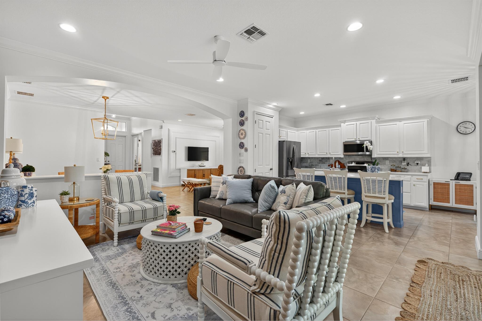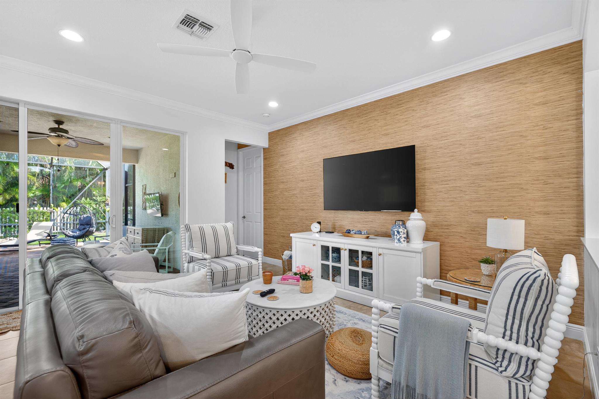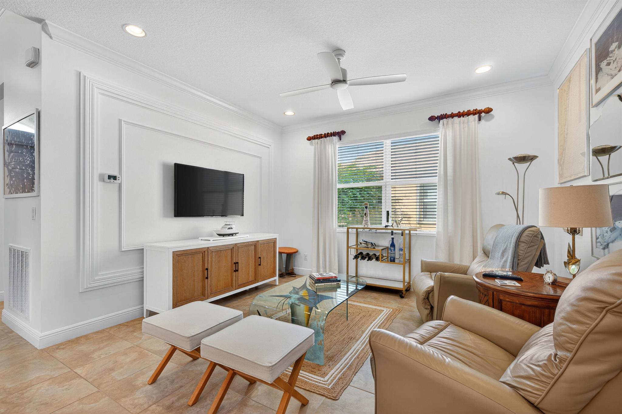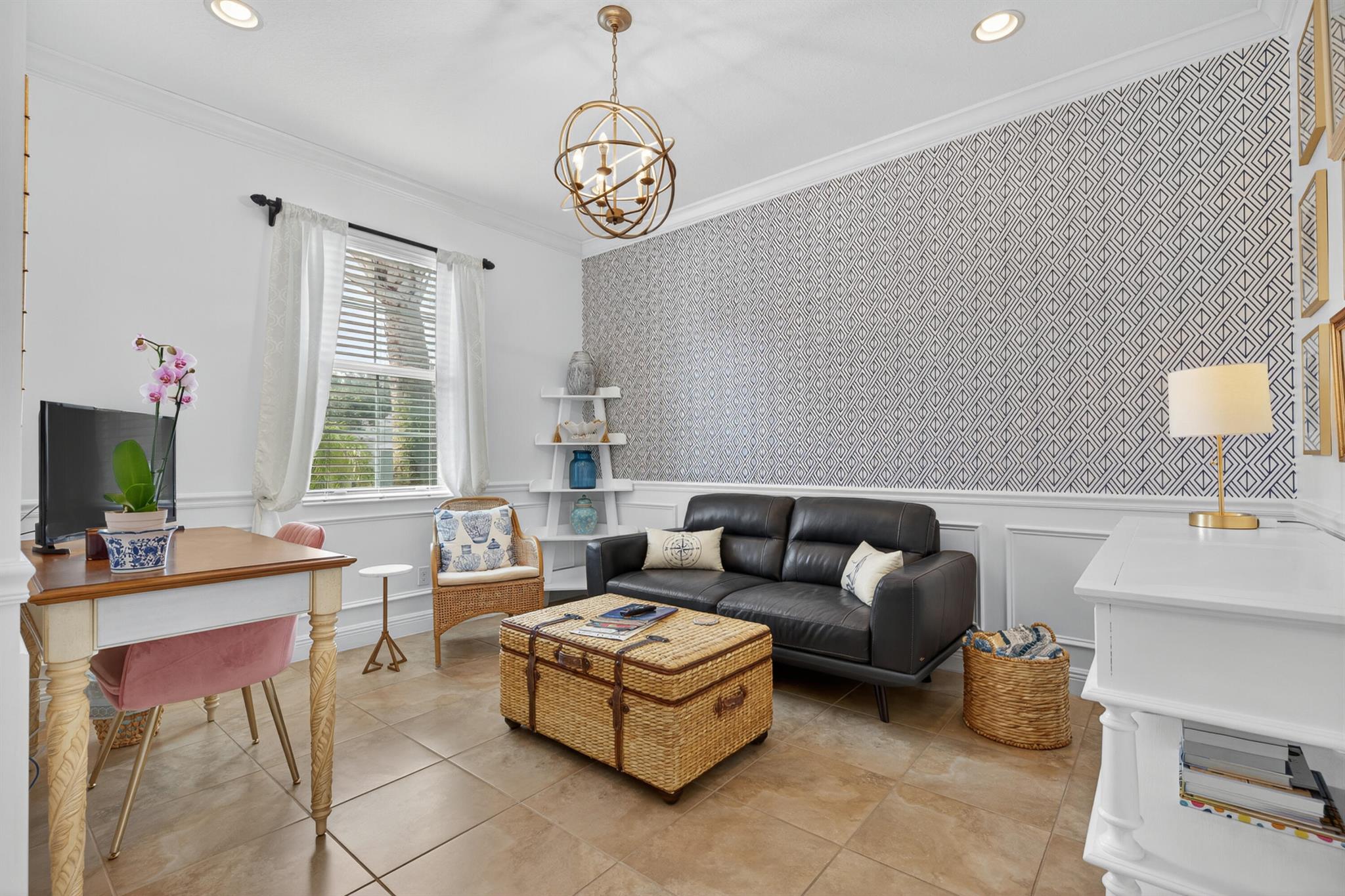 *Please watch our awesome video! Welcome to this stunning and well-maintained concrete block one story home with 2 bedrooms plus den and 2 and a half baths. Open concept layout with custom wood work, crown molding, custom window treatments, ceramic tile throughout the living area and engineered hardwood in the bedrooms. Updated kitchen with gorgeous quartz countertops paired with Italian marble backsplash and wooden cabinets. Modern light fixtures and fans throughout the house. Large primary bedroom with custom built walk-in closet. Dual sinks and enormous shower in primary bath. Spacious guest bedroom with custom built closet and en-suite bath. Versatile den which can be used as a 3rd bedroom or a home office. Large screened lanai and fenced yard. TownPark offers