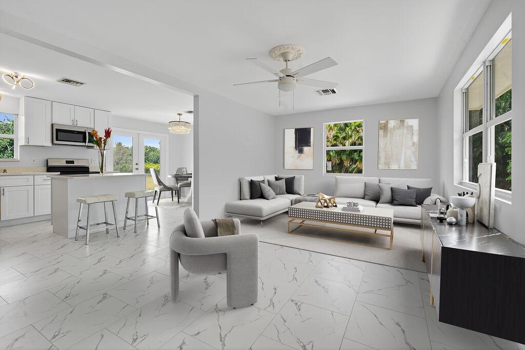 Completely Renovated Jupiter Farms Home - No HOA, 1.25 Acres This beautifully renovated 3 bedroom, 2 bathroom home sits on a spacious 1.25 acre. Every detail has been thoughtfully curated, making it move-in ready. 2024 Roof, freshly painted in & out, exquisite new pavers at all entrances, New AC & Water Heater, New Impact Glass Windows & doors, Sophisticated Open concept Kitchen boasts custom Center Island, new Frigidaire appliances. Elegant living spaces, Modern Finishes & elegant bathrooms showcasing refined tile and marble. Tile and Porcelain Flooring throughout. GE washer & dryer. Room for pool/barn. On paved road, Top rated schools, 5 miles to I-95 & Florida Turnpike. This home combines modern upgrades with country style living, all within minutes of everything Jupiter has to offer