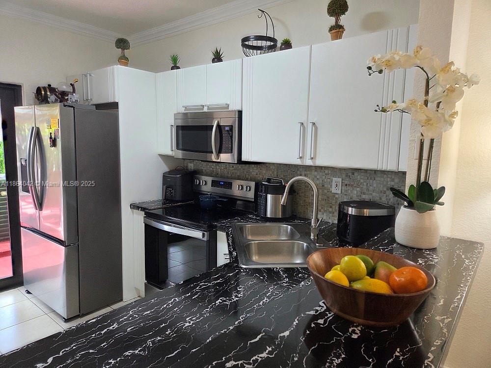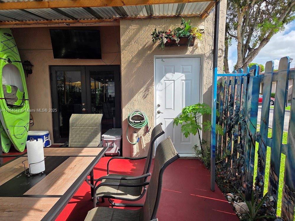 This charming, 2 Bedrooms, 2 1/2 bathrooms corner-unit townhouse offers both privacy and curb appeal in a quiet and children-friendly neighborhood, Cazadores South. It boasts a light beige exterior accented by elegant white trim and topped with brown Spanish tile roofing. New, beautiful hurricane-proof windows and doors installed, while the corner lot placement means fewer shared walls and more outdoor space. Situated on a tree-lined street with two parking lots and easy access to nearby shops, schools, and parks, this home blends style, convenience, and comfort—ready for its next owner to move in and make it their own. It has a paved and roofed terrace, with some plants giving it a green touch which, together with the mounted outdoor TV, you can enjoy while having a BBQ in the afternoon.