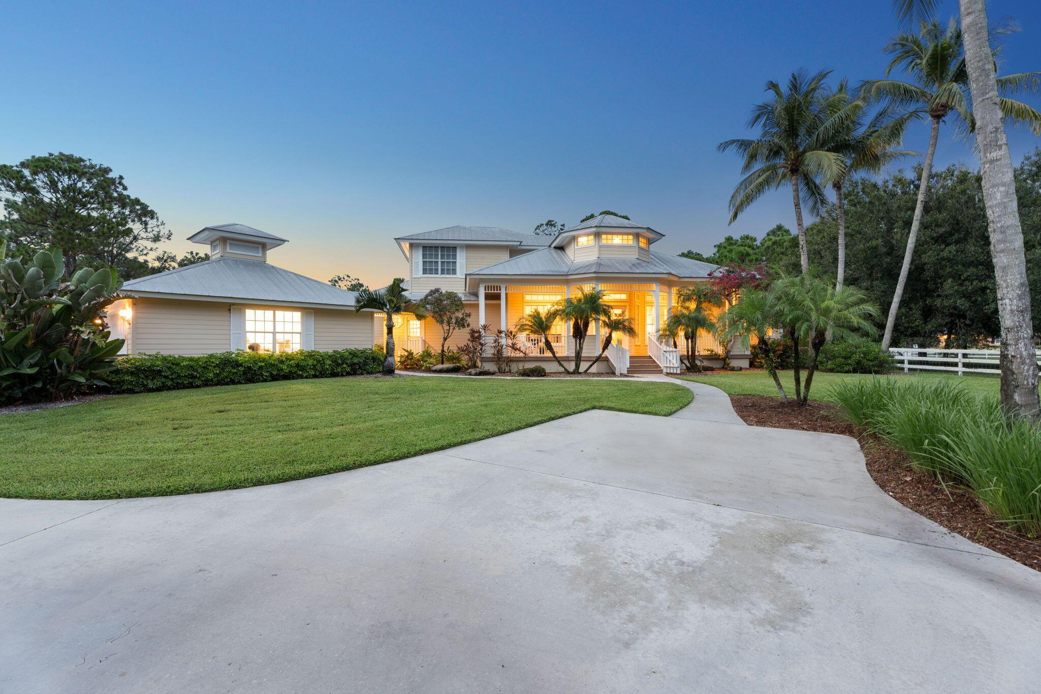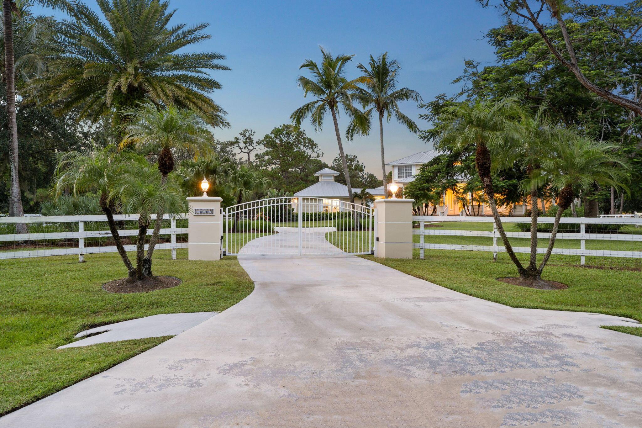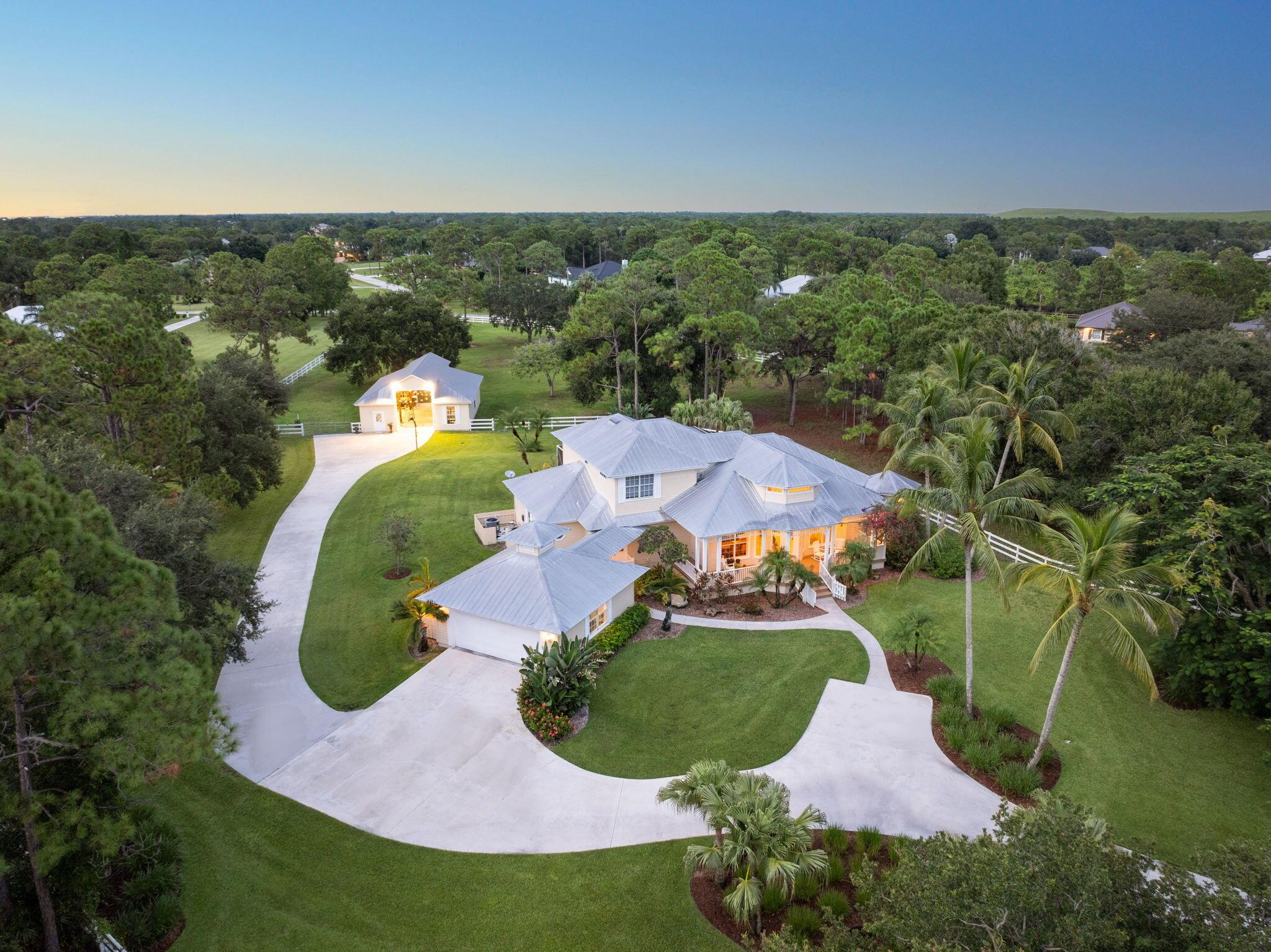 Over 4 acres of dry, fully usable and fenced land in the gated community of Stuart West. This Key West-style estate features a 4-bed, 3-bath pool home with an attached garage, plus a detached 36x46 hurricane-rated RV barn with 12x14 doors and 100-amp service. Inside, enjoy a cozy fireplace, custom finishes, and a wraparound porch. Outside, a beautifully redone pool and over an acre of irrigated landscaping surrounded by mature oaks and vibrant Poincianas. A 400-ft concrete driveway leads to the back acreage, ideal for horses, RVs, or boats. Fully fenced with electric gate, whole-home generator, and no wetlands. A rare mix of privacy, charm, and functionality in one of Martin County's premier acreage communities