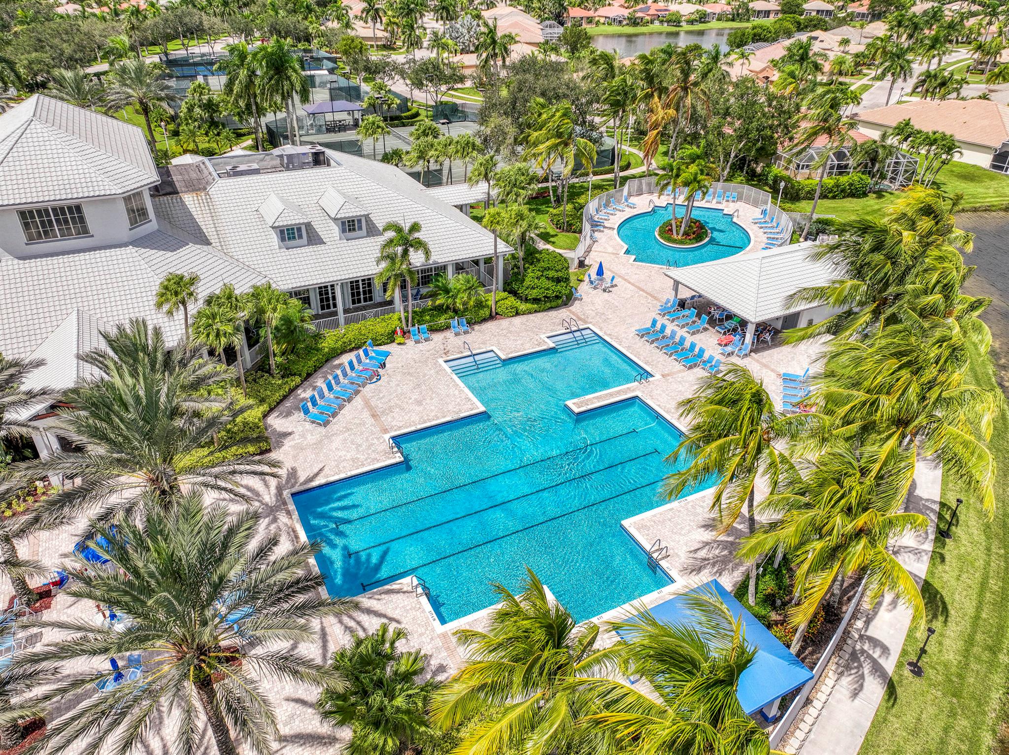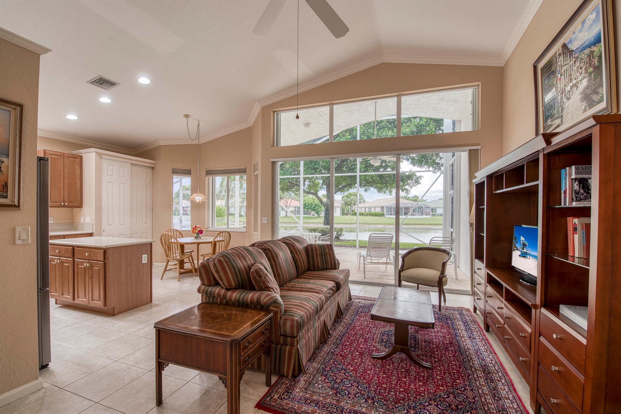 Welcome to Baywinds - a 55+ active adult community situated in West Palm Beach. This lakefront home features 3 bedrooms, 2 full bathrooms and an extended screened-in patio with expansive views. With 2,184 living square feet, this home offers a split floorplan that provides comfort and flexibility for your family and guests. The diverse layout features a formal living sitting area, family room, eat-in kitchen and dining space with direct waterviews. In addition, you will find high ceilings, a large primary suite & bathroom, interior laundry room and a two car garage. Known for its beautifully designed clubhouse and amenities, the exterior grounds feature three pools & hot tub, five tennis courts, four pickleball courts, four bocce courts and four shuffleboard courts. The clubhouse provides