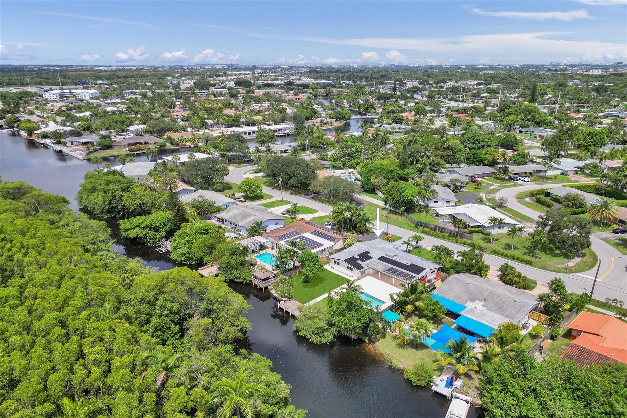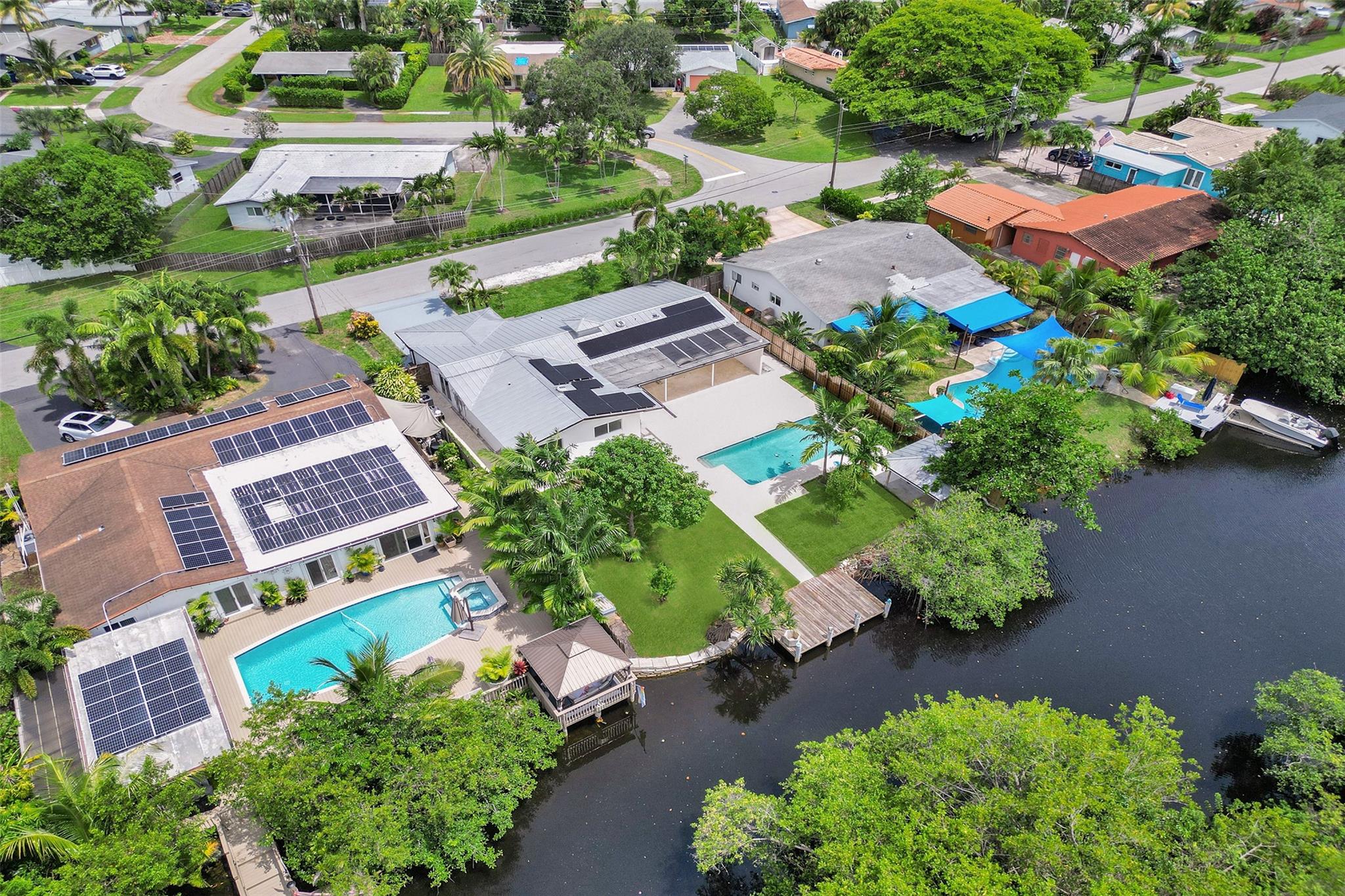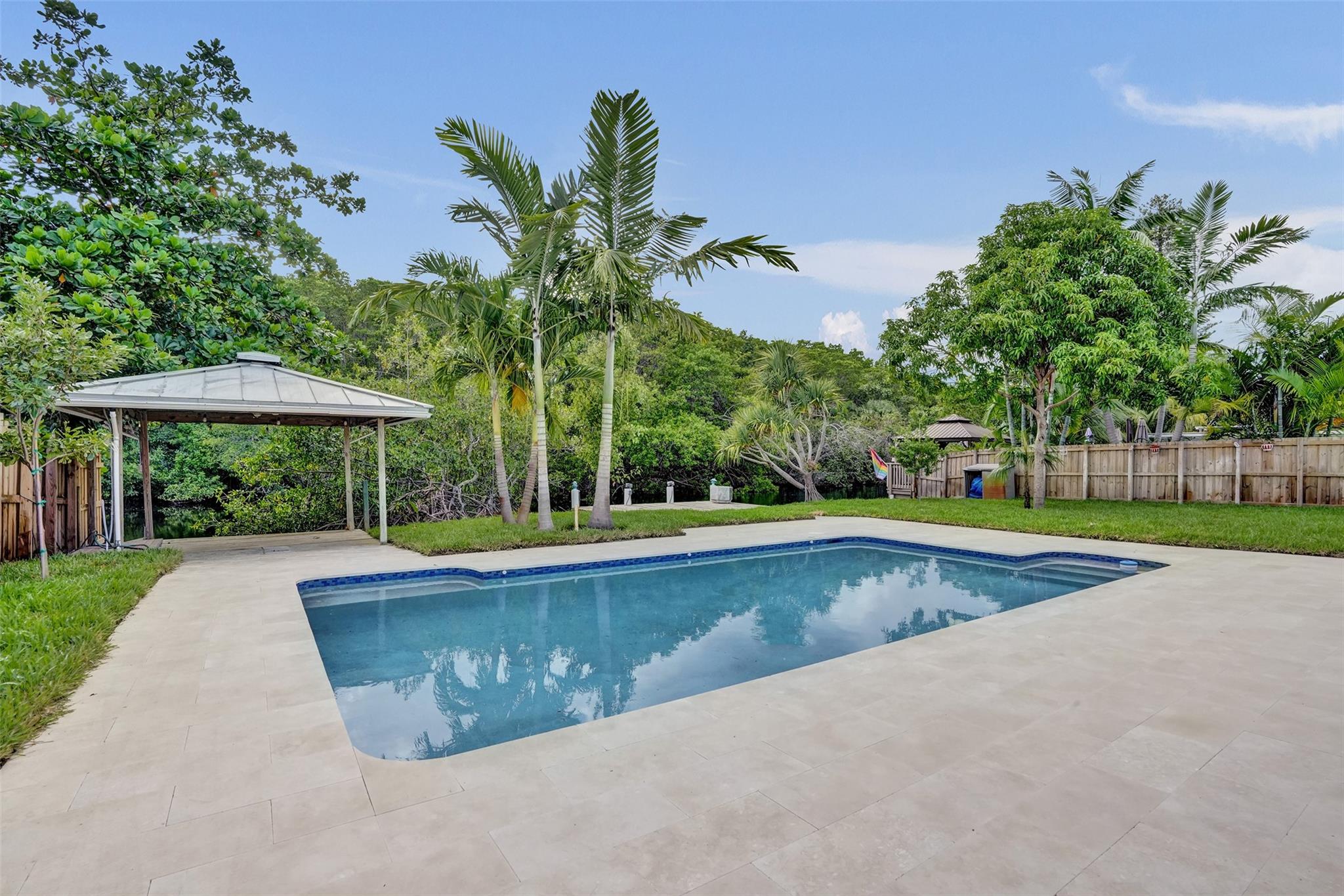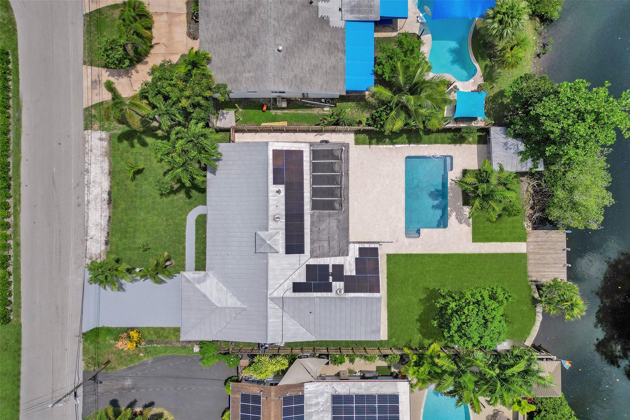 For those seeking a luxuriously remodeled, contemporary home w/ ocean access & extensive upgrades, look no further—this is your private paradise! Striking stacked-stone façade w/ 2002 metal roof & energy-efficient 2024 solar panels. Inside, the open-concept kitchen showcases shaker cabinetry, quartz counters, waterfall-edge bar & premium appliances accented in gold. Split BR layout ensures privacy, while spa-inspired baths create a resort-like atmosphere. Elegant porcelain tile flows thru/out, supported by a 2-zone AC system (2020/2022). Step outside to your oversized backyard designed for entertaining, featuring Jerusalem stone patio, sparkling pool, tiki hut & private dock. 2-car garage, sep. laundry, upgraded lighting, fans & more add to this exceptional property...a true must-see!