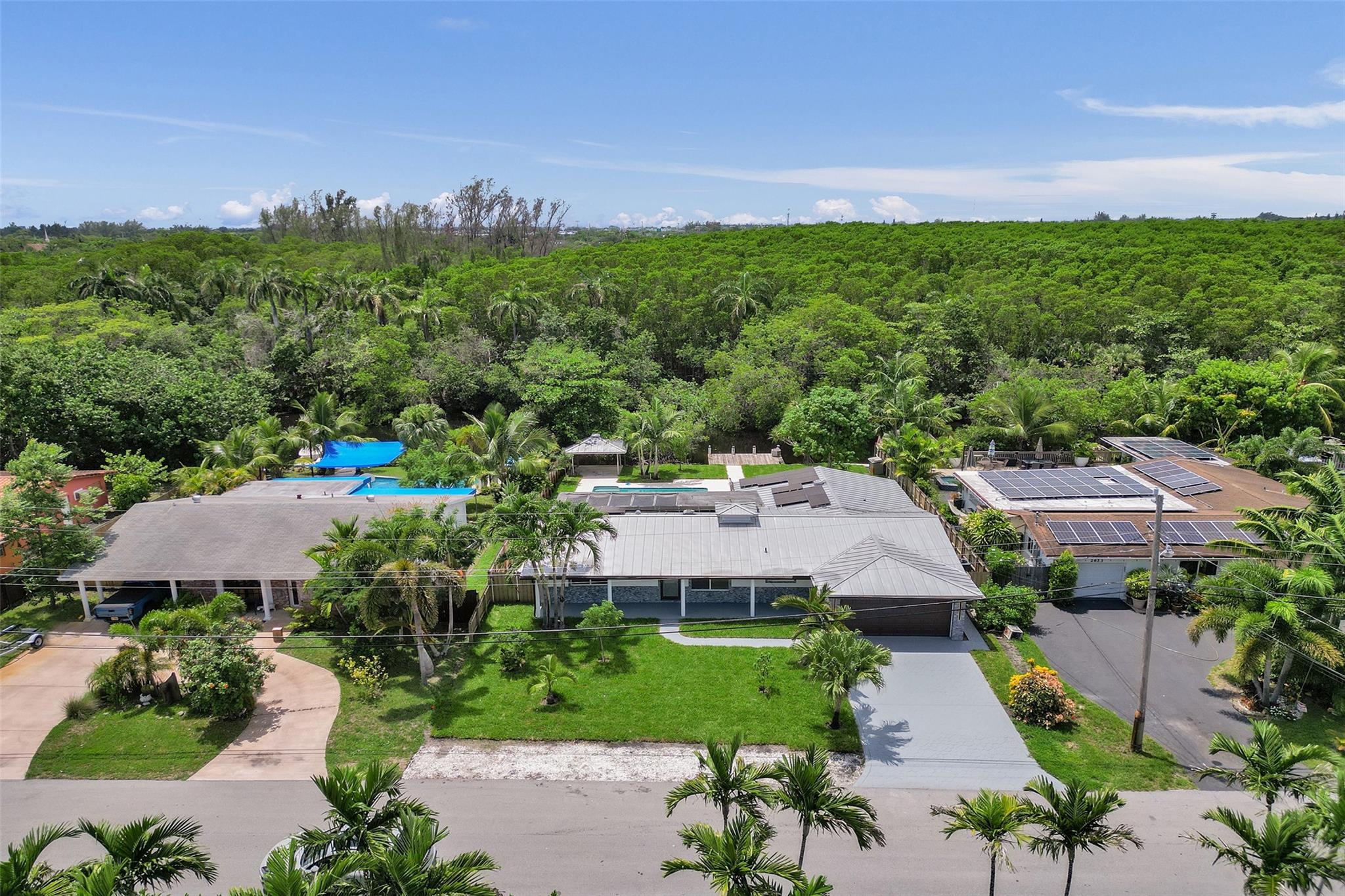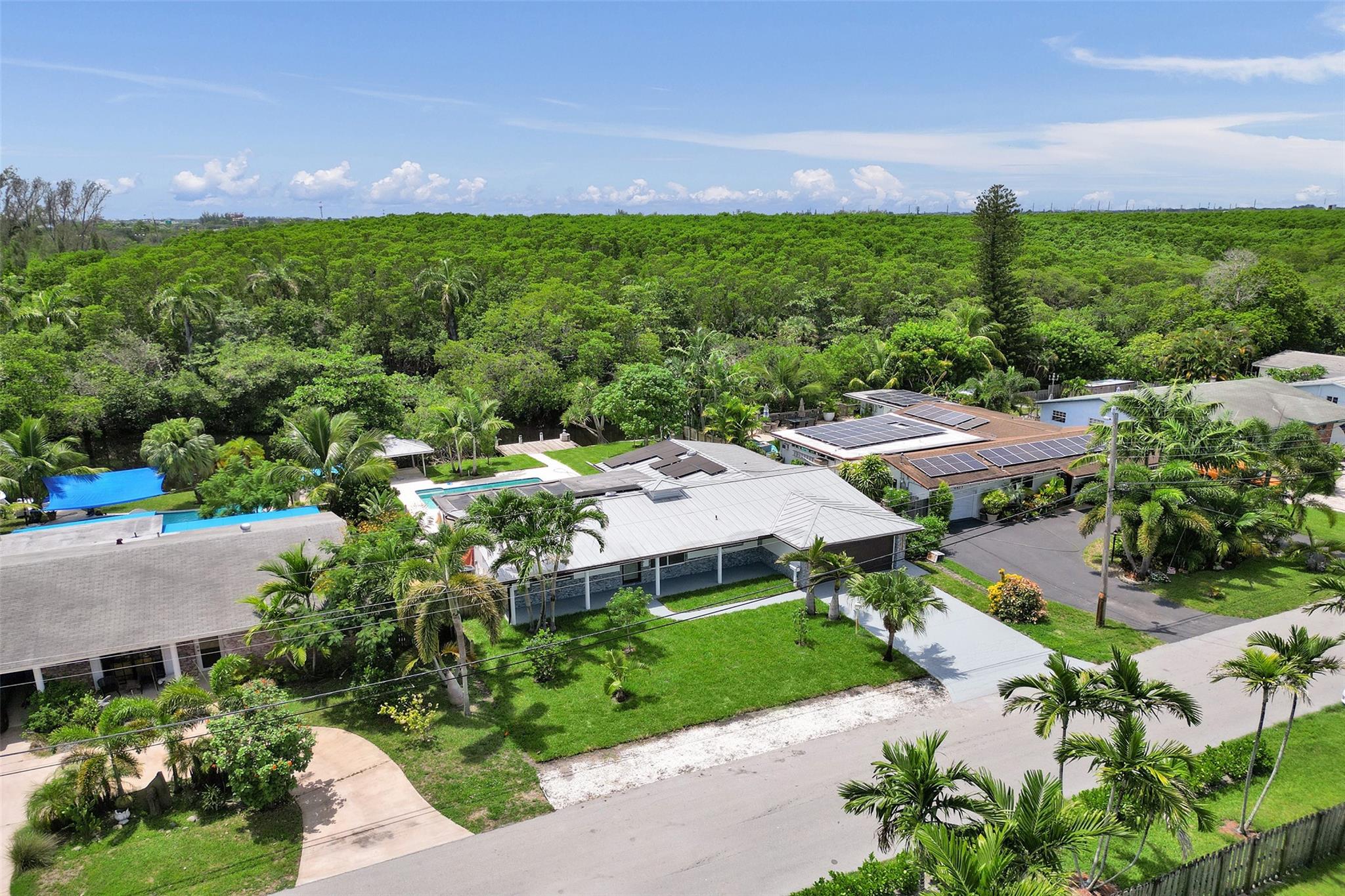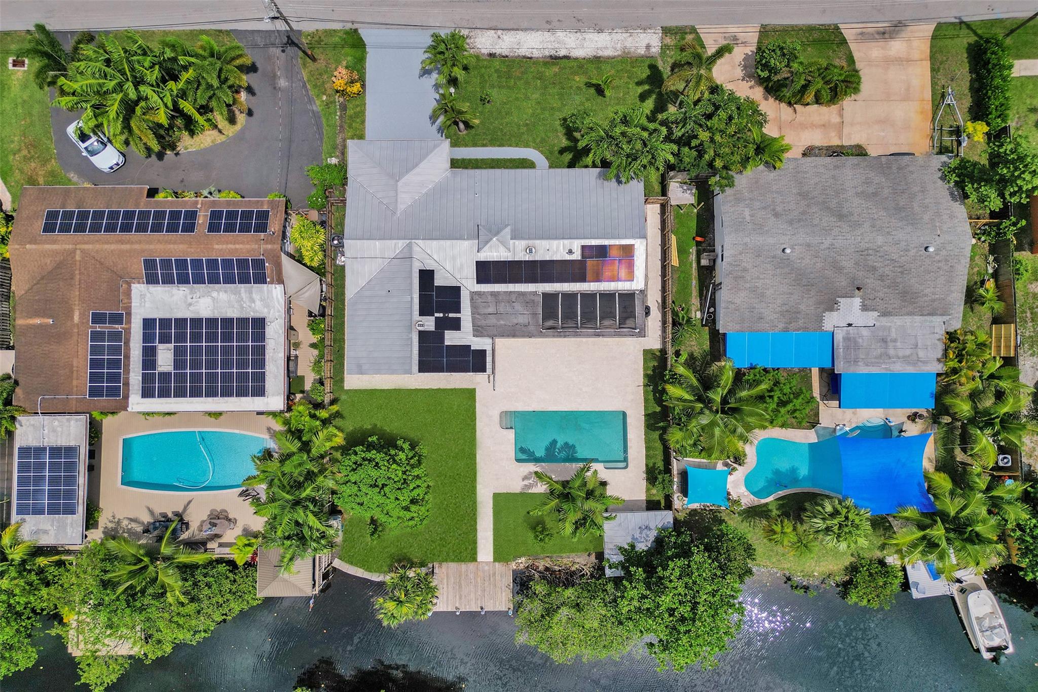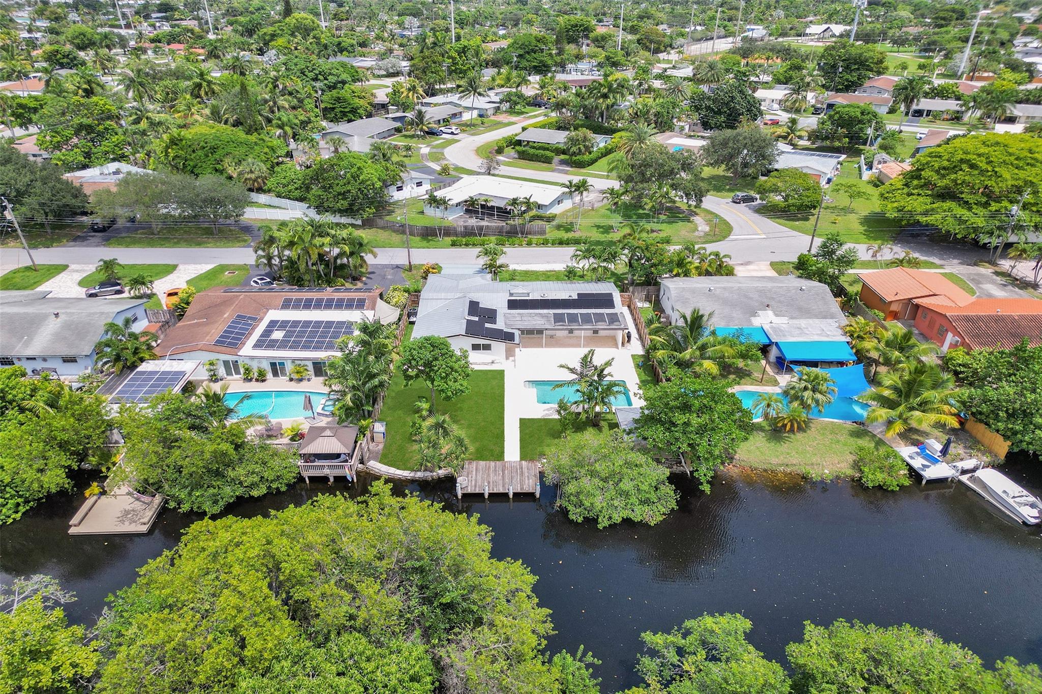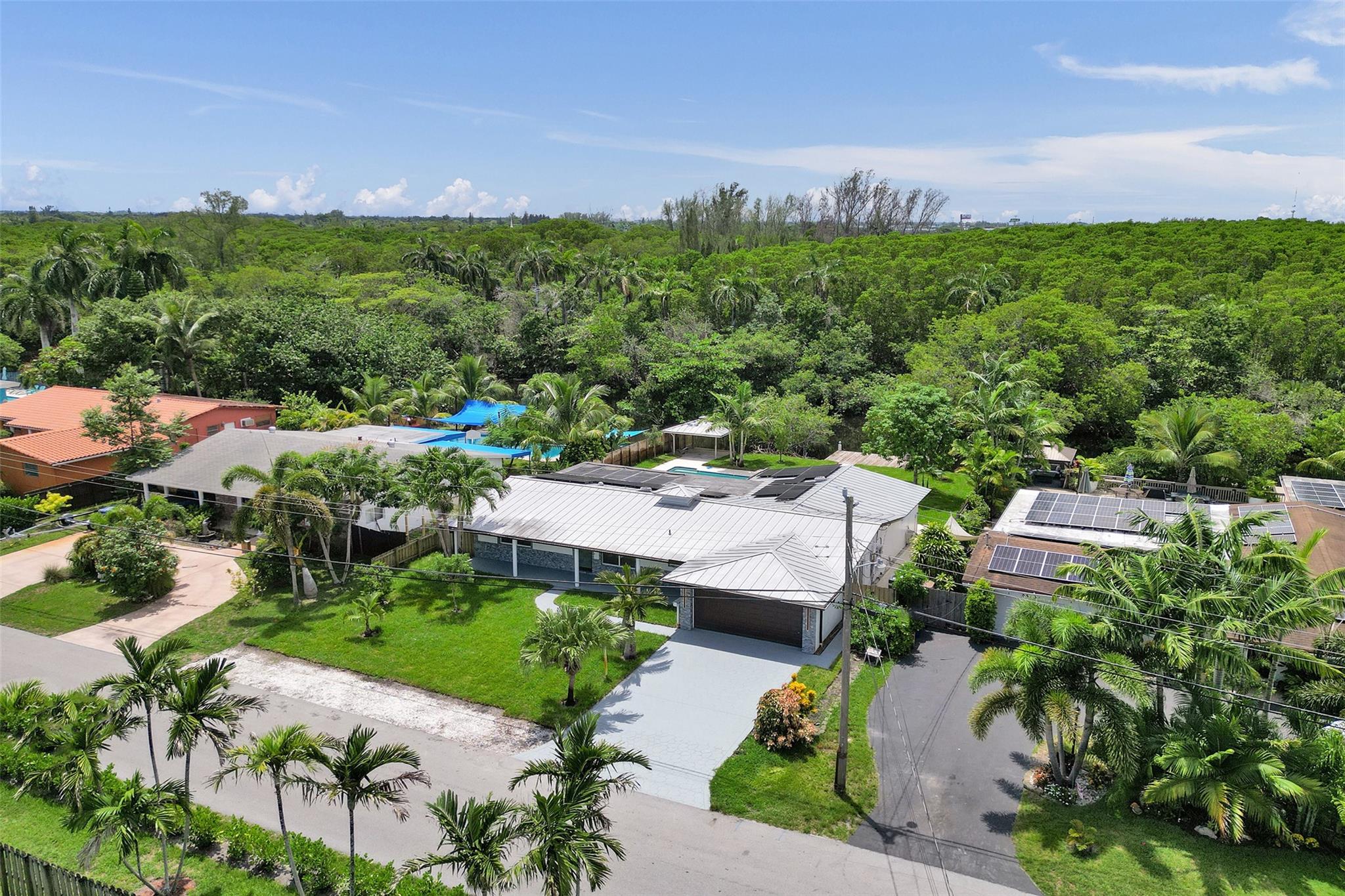 For those seeking a luxuriously remodeled, contemporary home w/ ocean access & extensive upgrades, look no further—this is your private paradise! Striking stacked-stone façade w/ 2002 metal roof & energy-efficient 2024 solar panels. Inside, the open-concept kitchen showcases shaker cabinetry, quartz counters, waterfall-edge bar & premium appliances accented in gold. Split BR layout ensures privacy, while spa-inspired baths create a resort-like atmosphere. Elegant porcelain tile flows thru/out, supported by a 2-zone AC system (2020/2022). Step outside to your oversized backyard designed for entertaining, featuring Jerusalem stone patio, sparkling pool, tiki hut & private dock. 2-car garage, sep. laundry, upgraded lighting, fans & more add to this exceptional property...a true must-see!