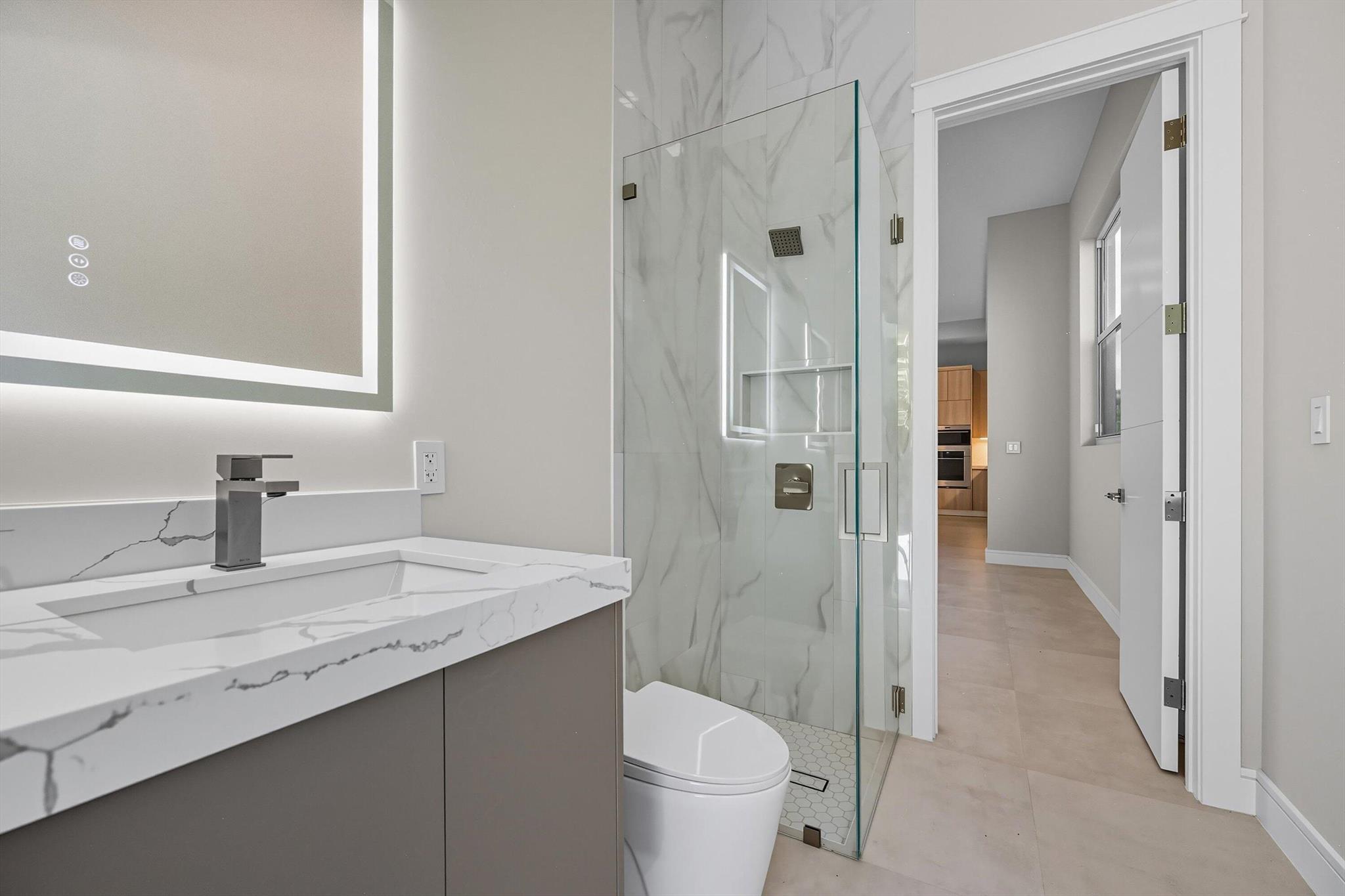Newly built coastal contemporary residence in the heart of East Delray Beach. Just a short walk to the beach and minutes from vibrant Atlantic Avenue. Part of a neighborhood undergoing a complete transformation with brand-new multimillion-dollar homes, this property blends modern design, sustainable living, and resort-style amenities.With 3,800 square feet of living space and over 4,600 total square feet, the home offers soaring 12-foot ceilings on the main level and 10-foot ceilings upstairs, creating an airy and open atmosphere. The chef's kitchen is a true showpiece with a dramatic waterfall quartz island, high-end appliances, and custom cabinetry.