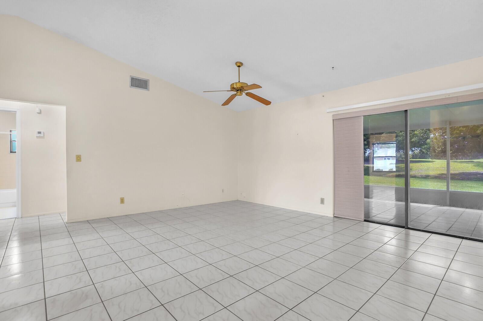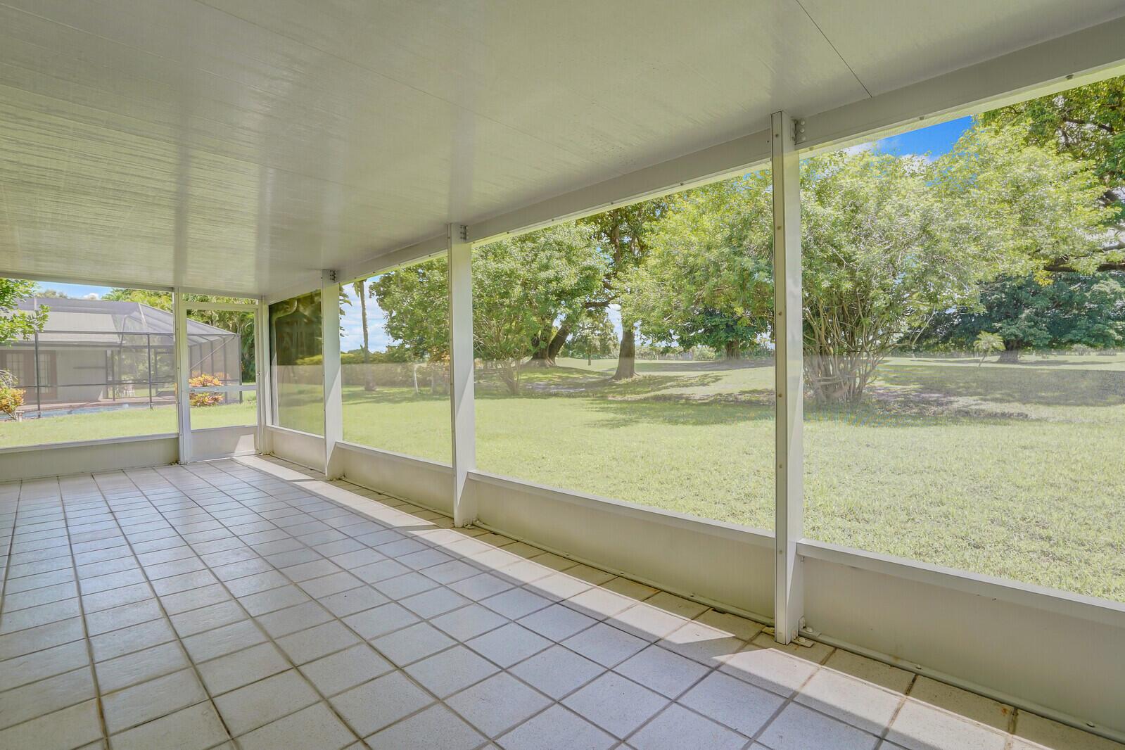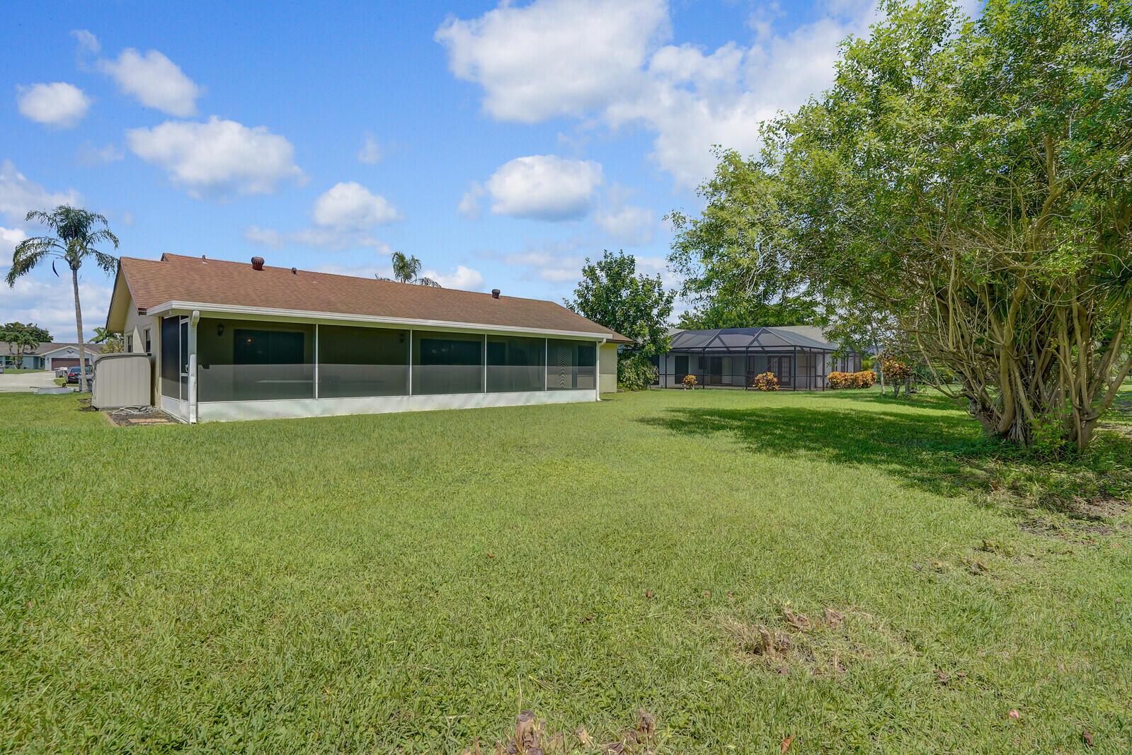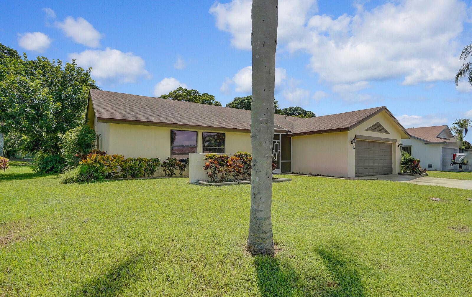 Incredible VALUE! Superb views are seen from this 'RARE'' 3-bedroom, 2-bath, 2-car garage, PLUS BONUS ROOM DEN/OFFICE, (can easily become a 4th BEDROOM by adding a closet) one-story single-family home directly on the Palm Beach County Southwinds Golf course. Large and private backyard with a covered and screened patio almost the full width of the home! The roof was installed 7/17/2020, A/C installed 9/14/2024 and upgraded kitchen cabinets with solid surface countertops. Living areas are fully tiled! INCREDIBLY LOW HOA just $75 MONTHLY. Newly upgraded community lighted amenities include pool, Gathering place, playground area, tennis, pickleball and basketball courts. Highly rated schools. No membership or dues required to play on the Palm Beach County Golf Course. Just pay and play
