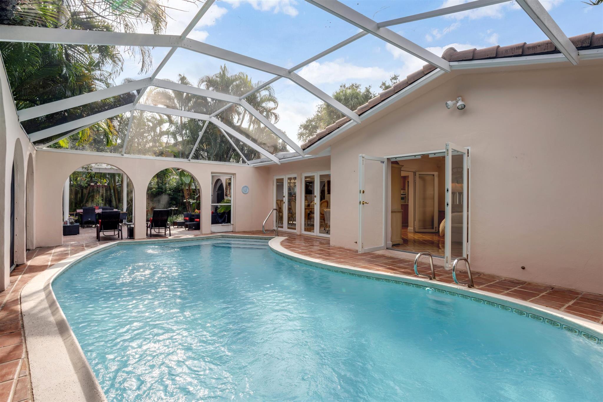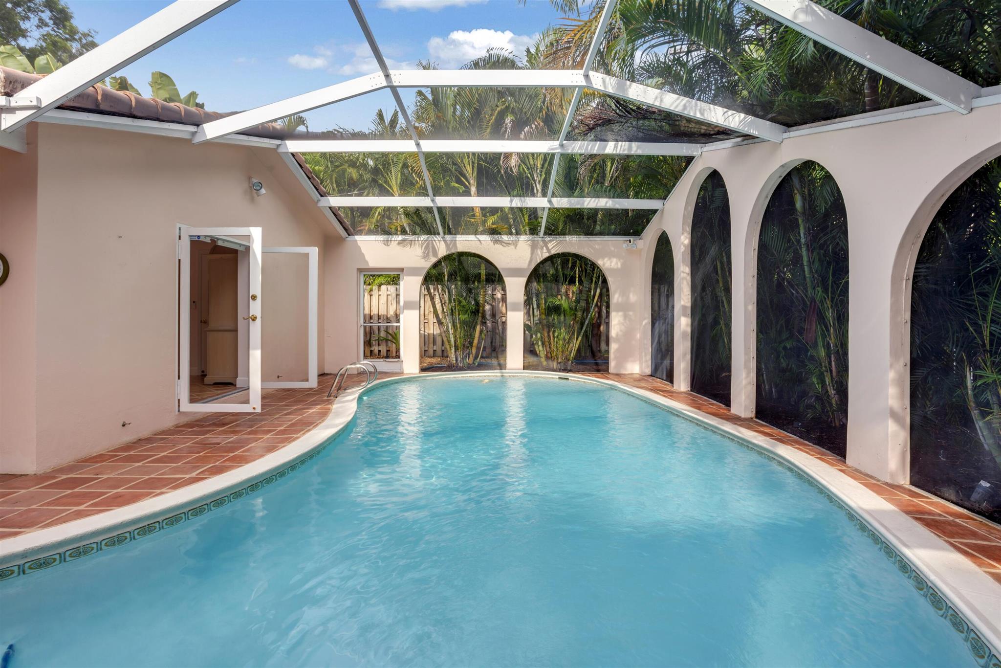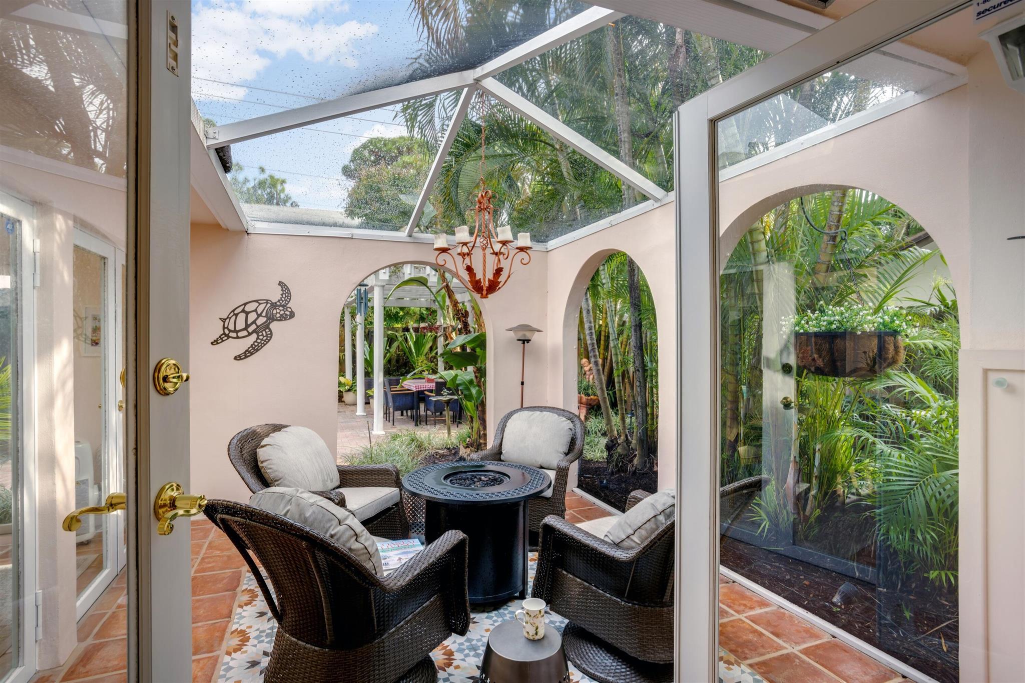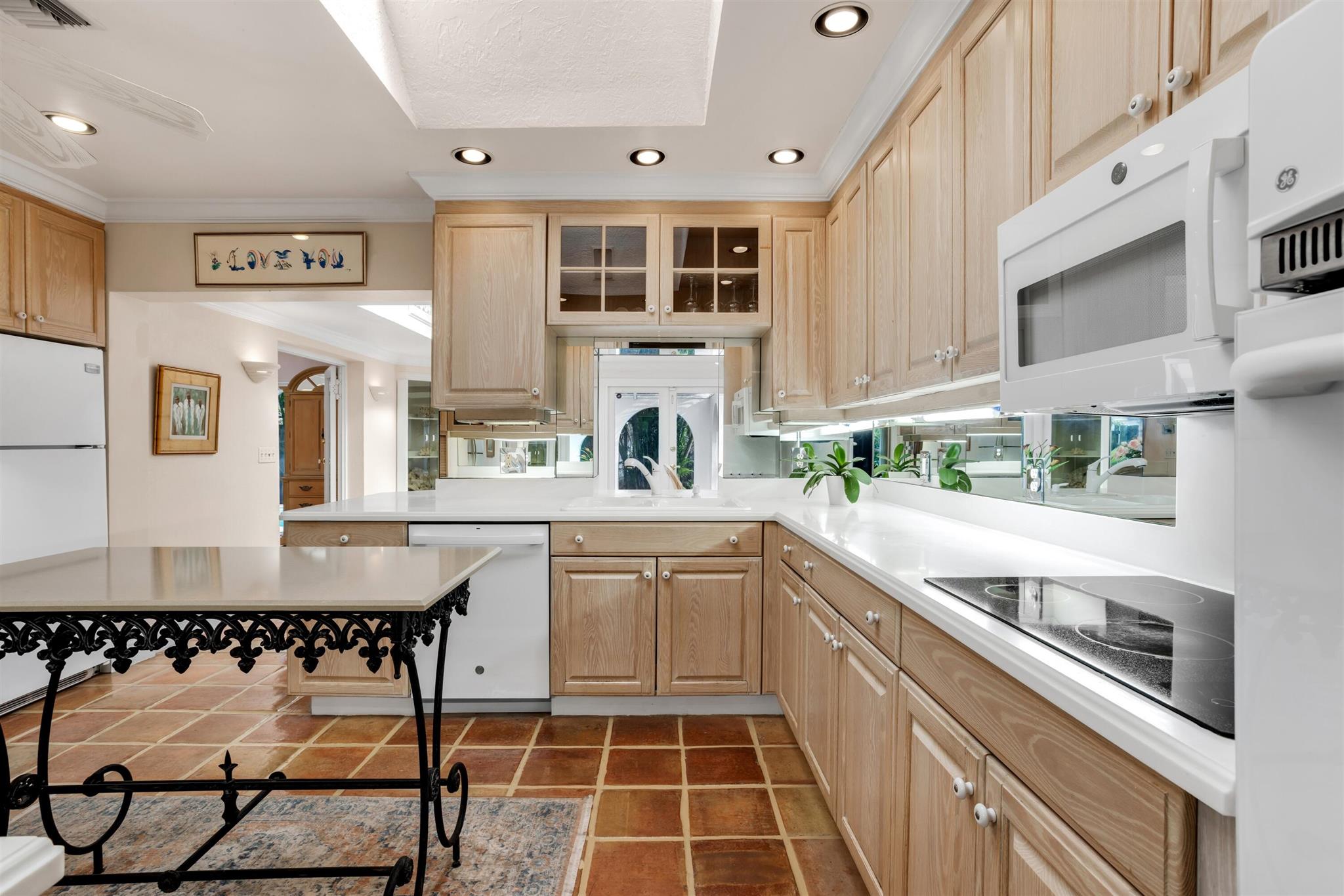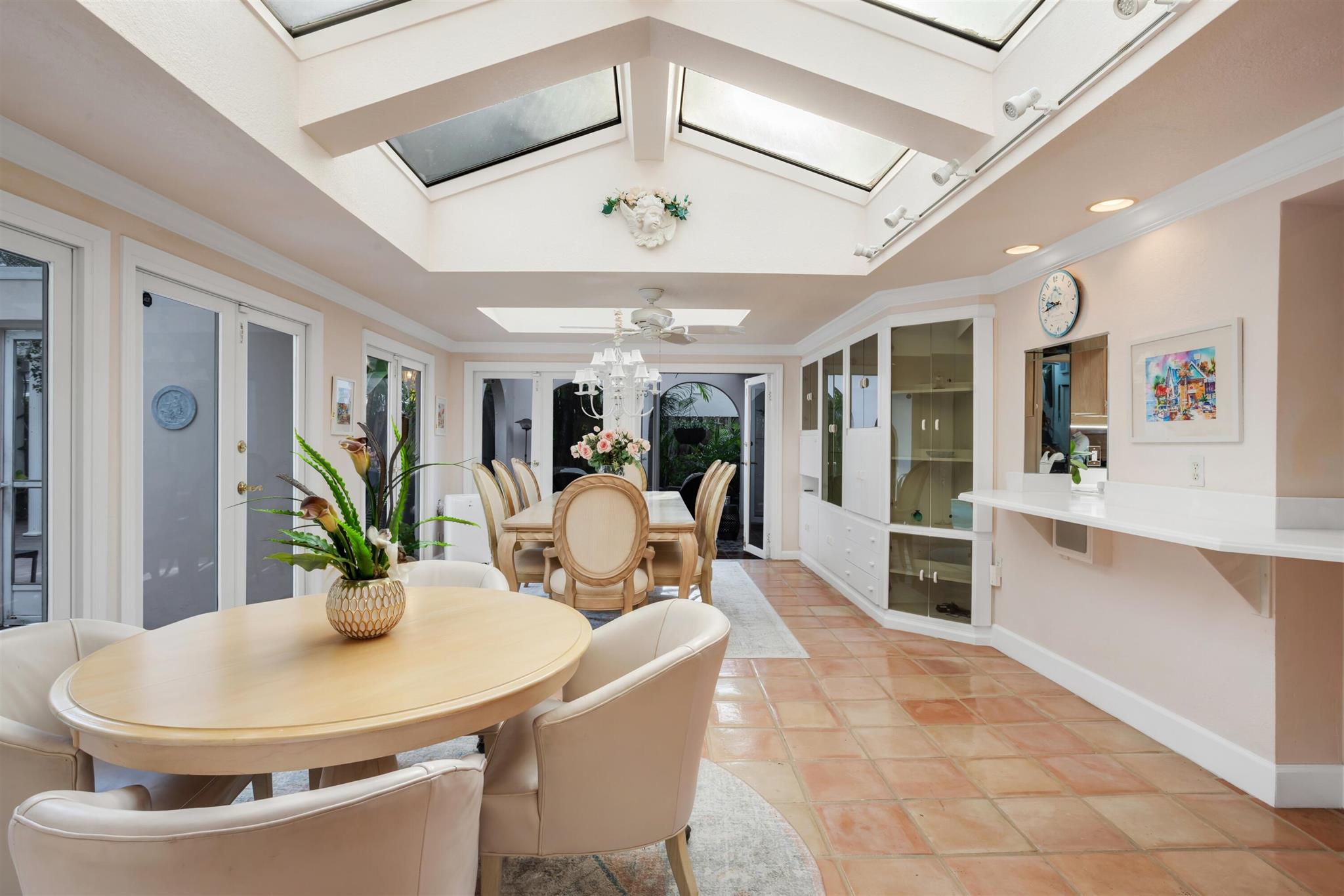 In an exquisite setting and radiating the charm of its era, this beautifully maintained residence is ideal for embracing South Florida's coveted lifestyle. With three bedrooms and 2,408+/- total square feet, its well-conceived floor plan was designed to optimize garden and pool views, seamlessly blending indoor and outdoor spaces. Details throughout include skylights making the interiors light and bright, custom built-in cabinetry, handsome moldings and clay-tile flooring. In the living room, a bay window overlooks the front gardens, while a fireplace adds a welcoming cordiality. The dining area comprises two areas, both defined by skylights and featuring French doors accessing the pool terrace. Just adjacent, the kitchen is fitted with cerused-wood cabinetry, mirrored backsplashes and a p