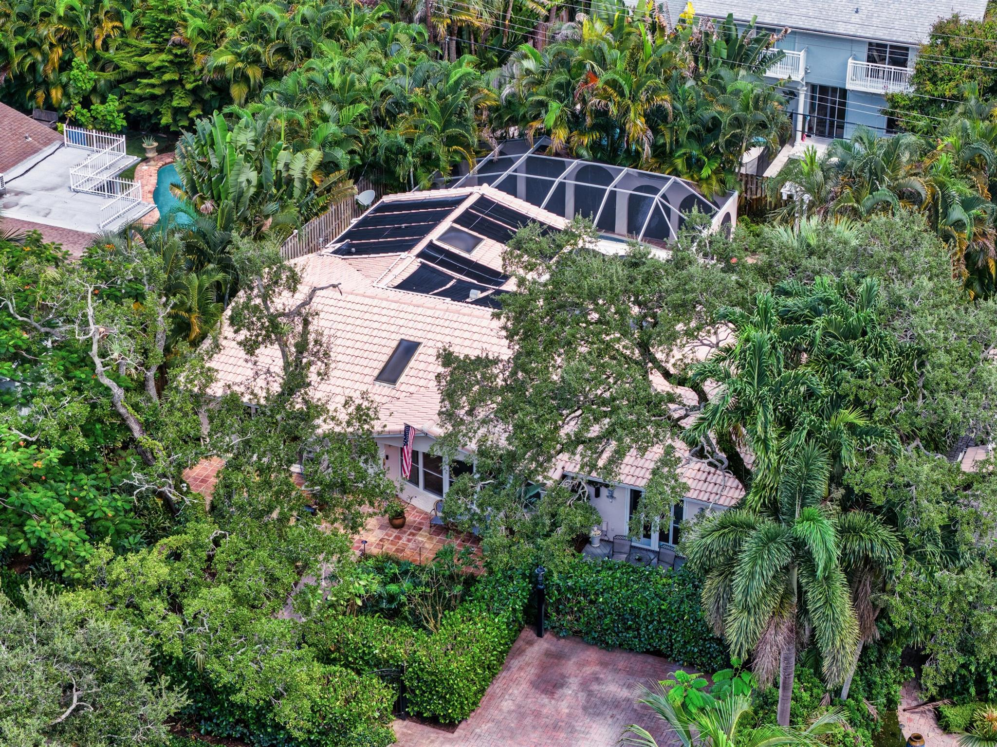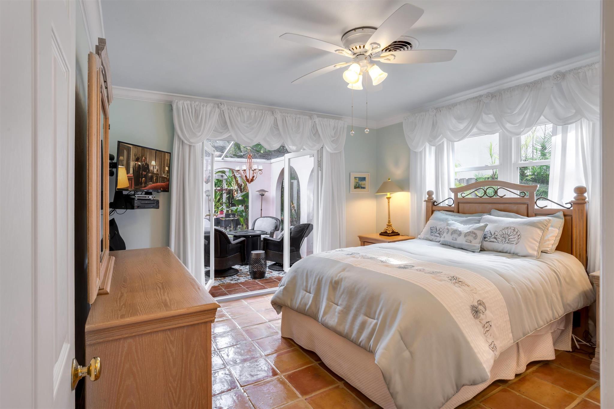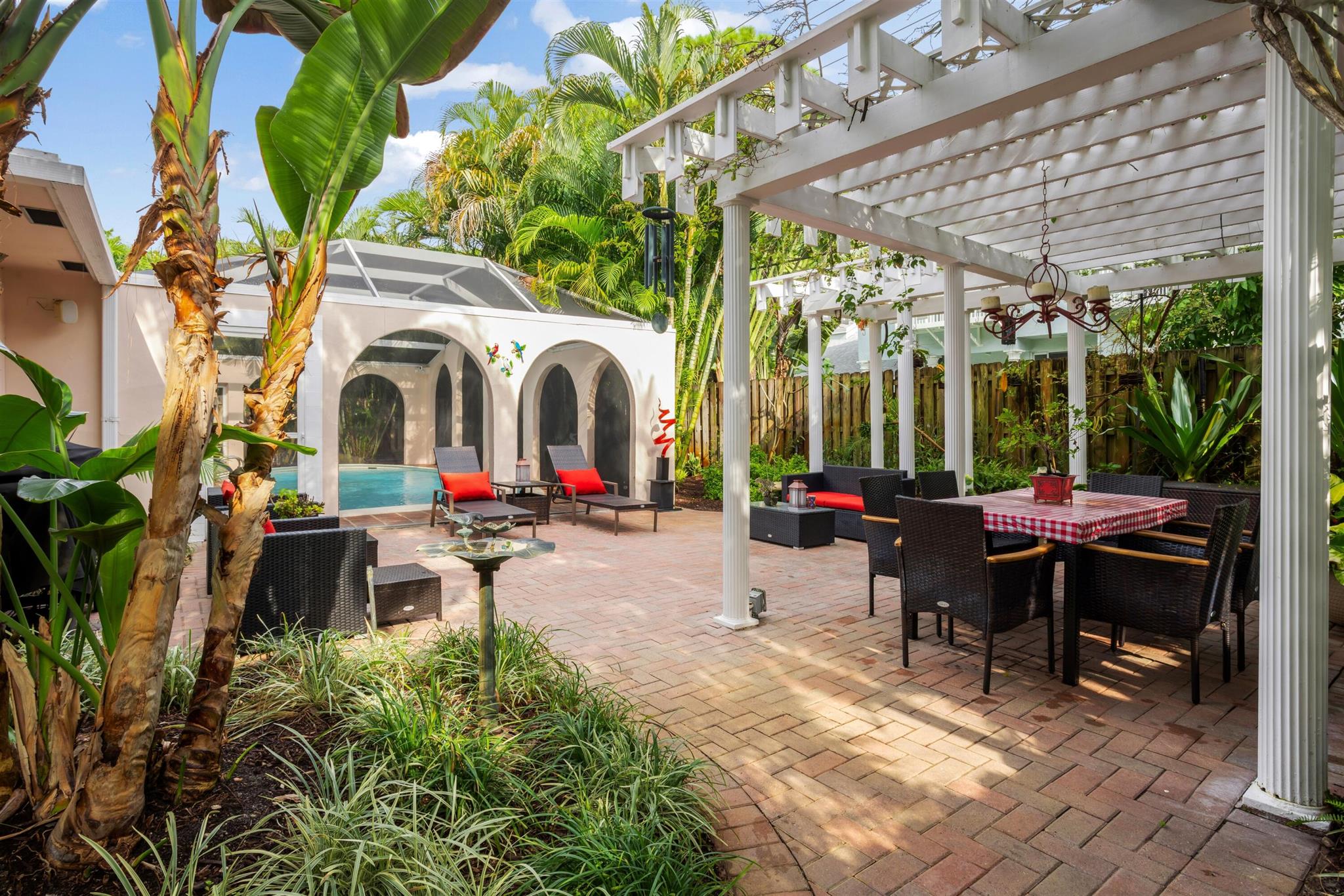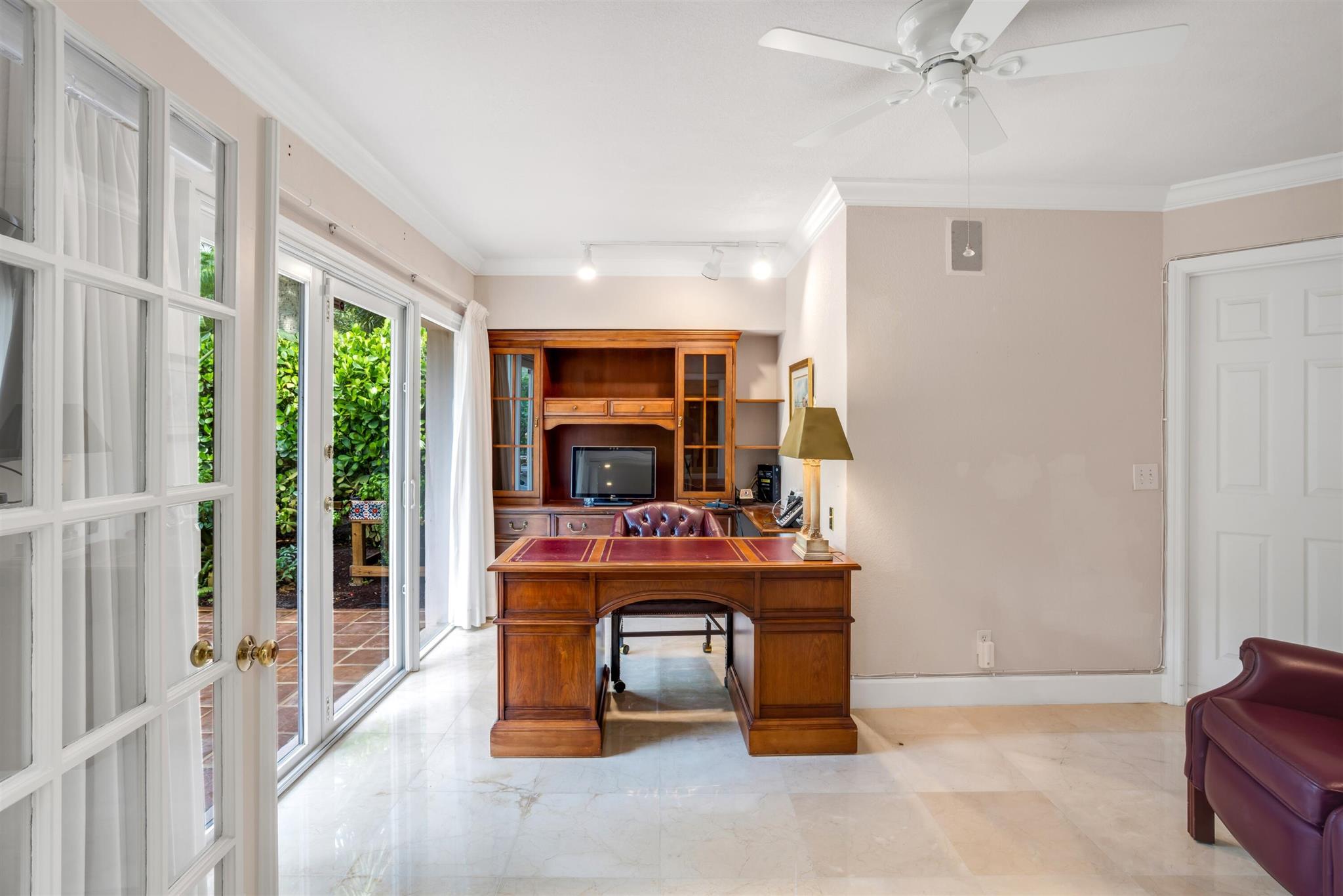 In an exquisite setting and radiating the charm of its era, this beautifully maintained residence is ideal for embracing South Florida's coveted lifestyle. With three bedrooms and 2,408+/- total square feet, its well-conceived floor plan was designed to optimize garden and pool views, seamlessly blending indoor and outdoor spaces. Details throughout include skylights making the interiors light and bright, custom built-in cabinetry, handsome moldings and clay-tile flooring. In the living room, a bay window overlooks the front gardens, while a fireplace adds a welcoming cordiality. The dining area comprises two areas, both defined by skylights and featuring French doors accessing the pool terrace. Just adjacent, the kitchen is fitted with cerused-wood cabinetry, mirrored backsplashes and a p