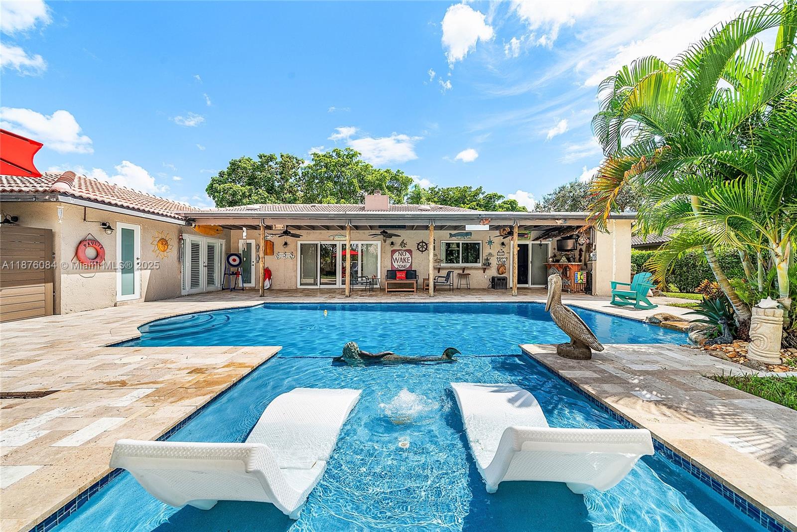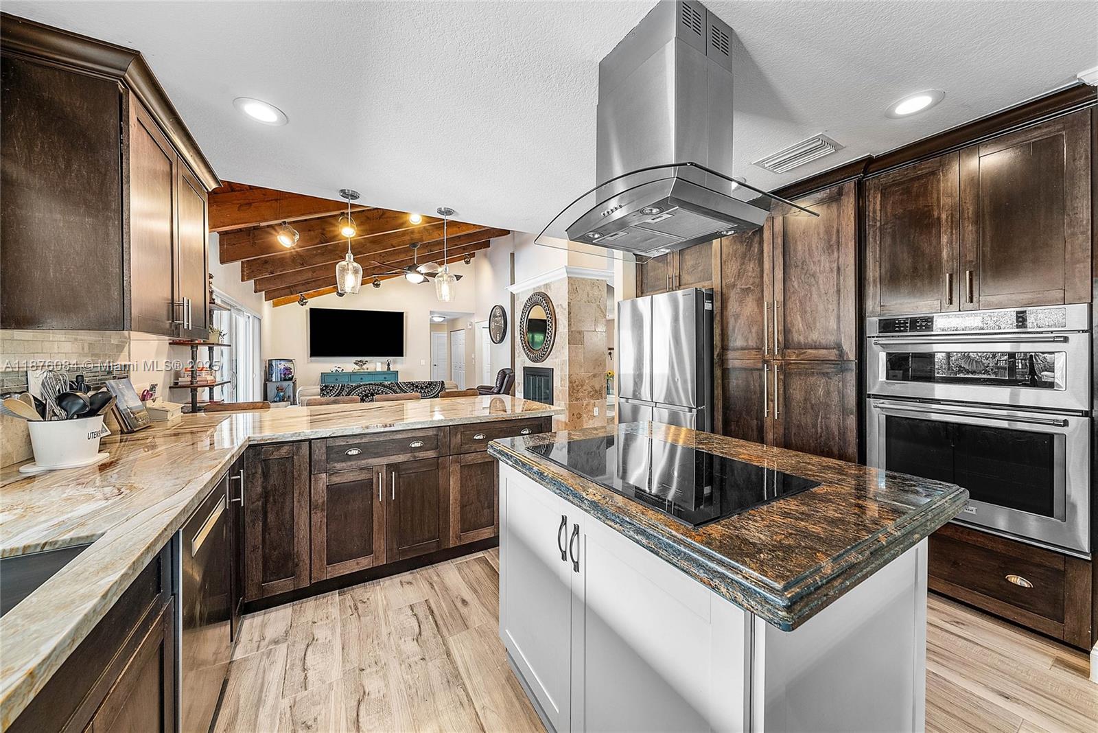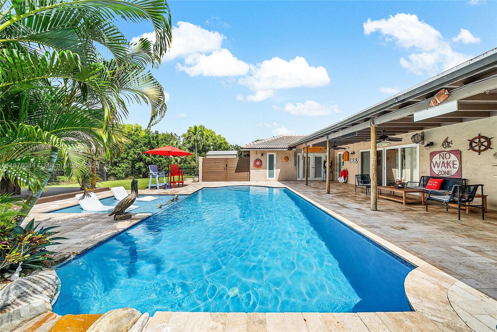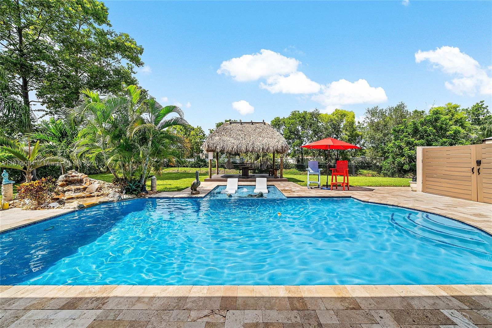 Imagine having everything you ever wished for in a house, and then seeing that house available to you right now. Come up the circular driveway and notice the brickwork, the tile roof, the granite along the front porch, the Euro front door, and you feel like you’re somewhere in the Mediterranean. Inside, the family room features porcelain tile flooring, pitched ceilings, and the grandiose travertine-lined double-sided fireplace as a focal point. Next, arrive in the updated kitchen and nook with well-appointed 42” cabinetry “all the way up”, stainless appliances, and an island with electric cooktop, hood vent and custom triple pencil edge granite. The house features 4 full bedrooms + office, with every detail having been updated! But then, the best part awaits you when you step out back...
