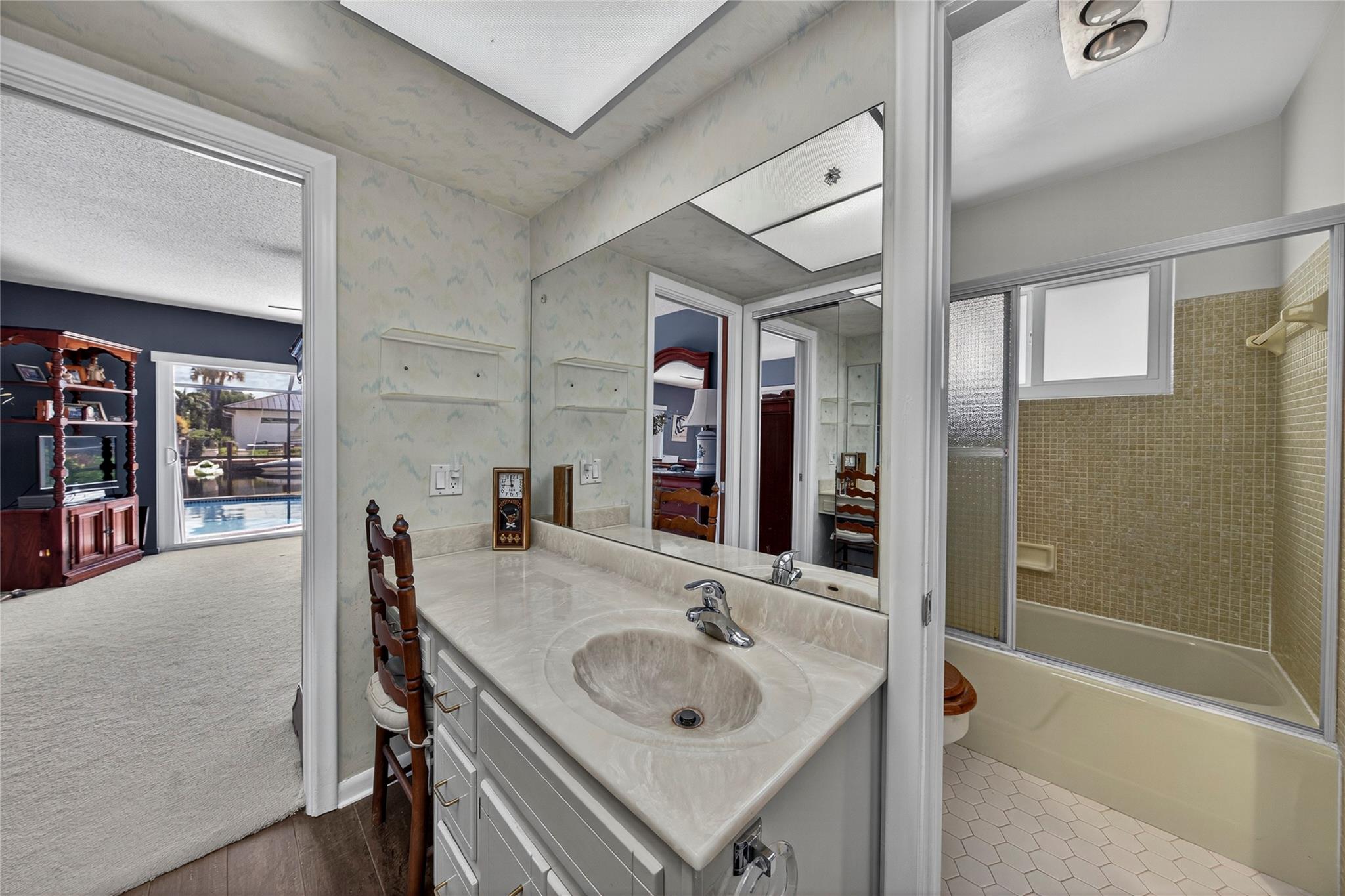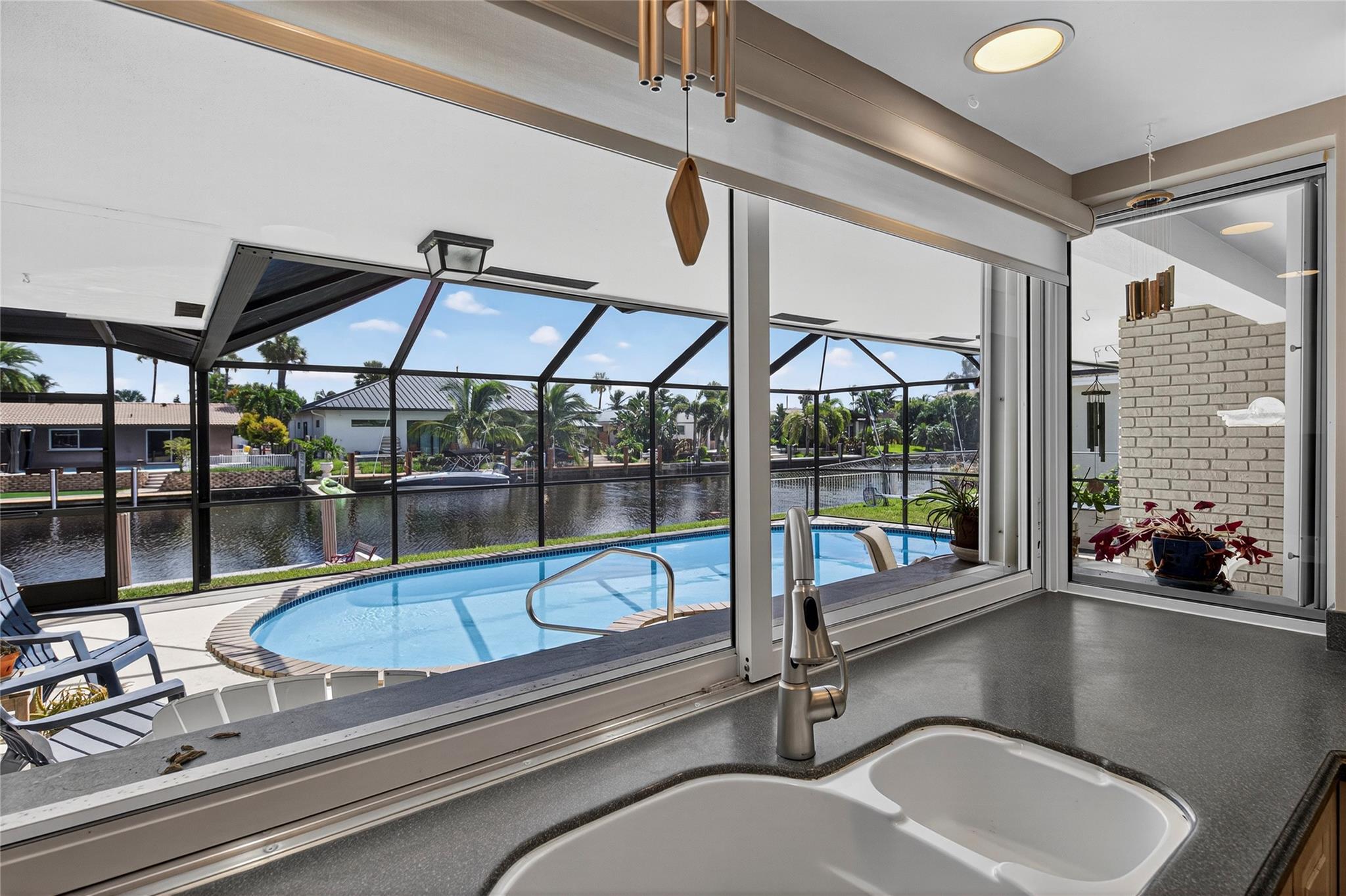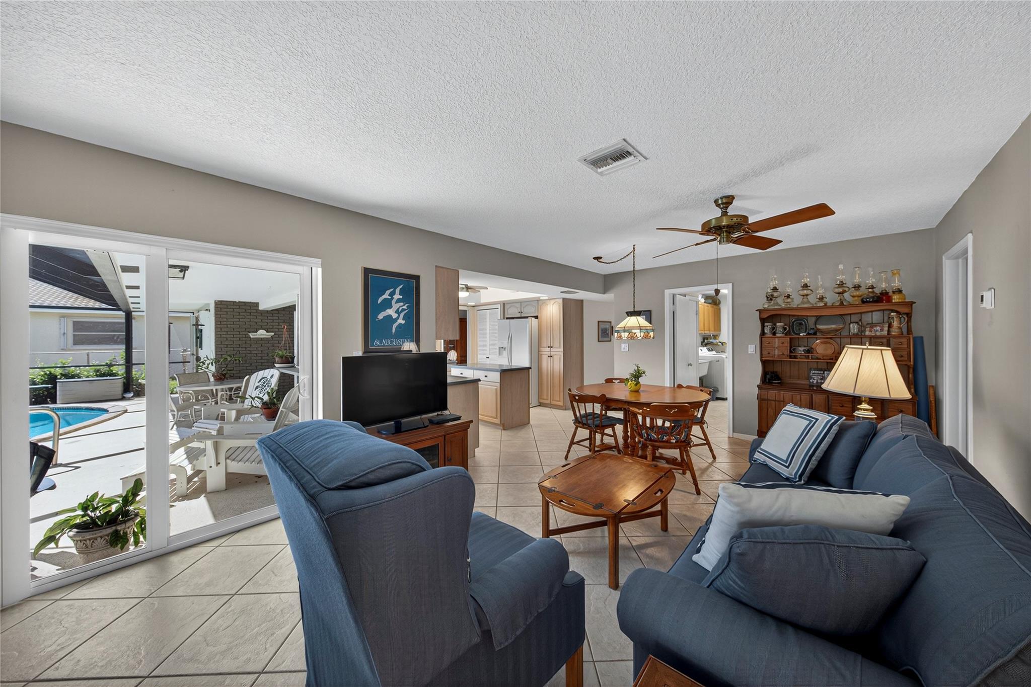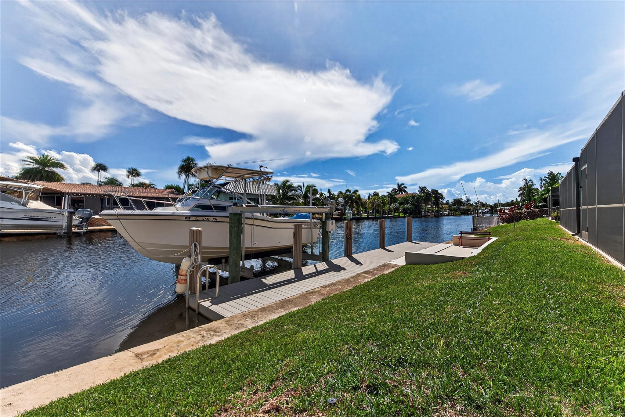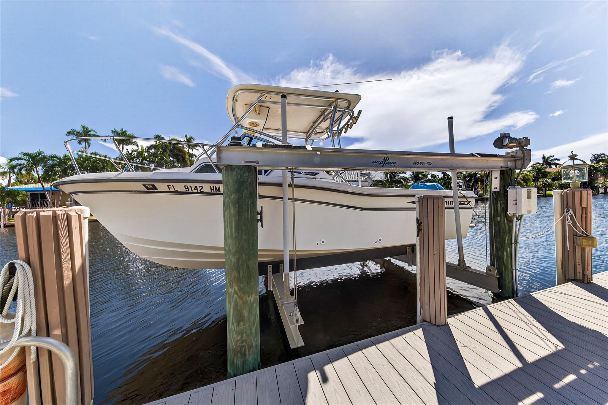 Well maintained 4 bedroom home with 2 original bathrooms, 2 car garage, screened pool and 80 feet of water frontage, one fixed bridge to ICW. Dock is composite and includes boat lift. Roof recently replaced in 2024, split package A/C units. Interior & exterior electric panels updated 2018 including generator hookup. Impact windows and doors. Kitchen is older but not original, opens to family room. Formal dining room in living room. Fourth bedroom connects to primary suite, ideal as an office, gym or nursery.