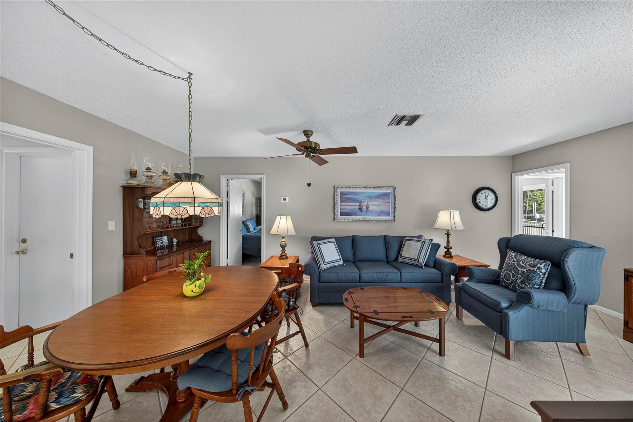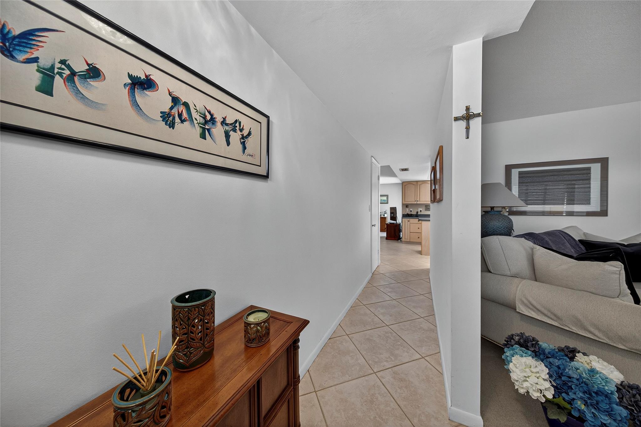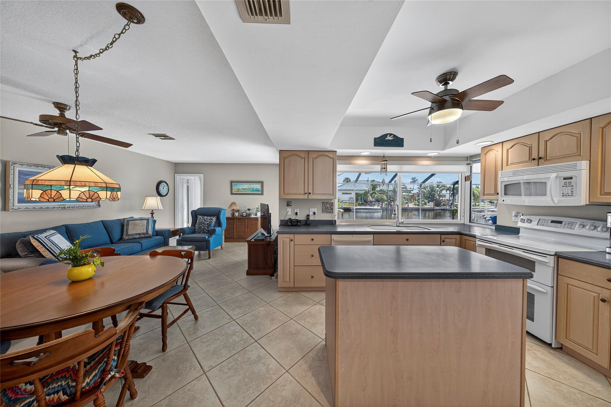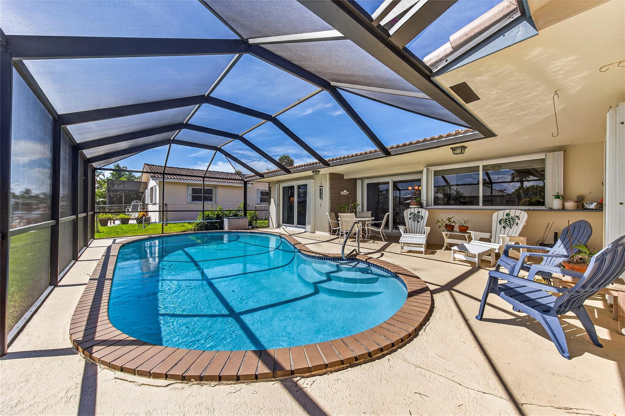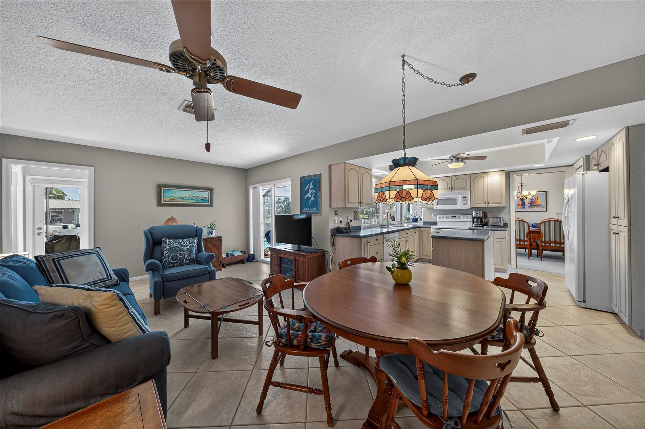Well maintained 4 bedroom home with 2 original bathrooms, 2 car garage, screened pool and 80 feet of water frontage, one fixed bridge to ICW. Dock is composite and includes boat lift. Roof recently replaced in 2024, split package A/C units. Interior & exterior electric panels updated 2018 including generator hookup. Impact windows and doors. Kitchen is older but not original, opens to family room. Formal dining room in living room. Fourth bedroom connects to primary suite, ideal as an office, gym or nursery.