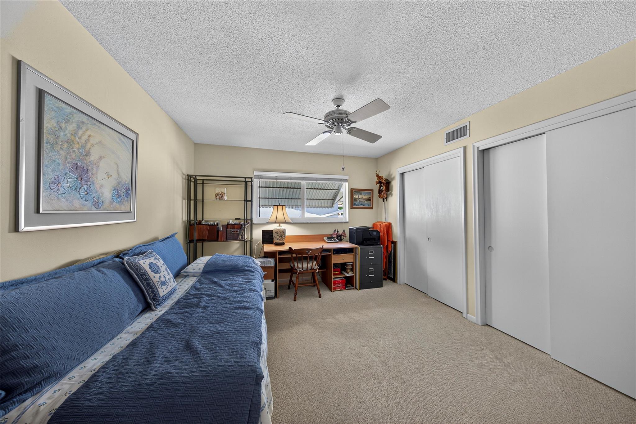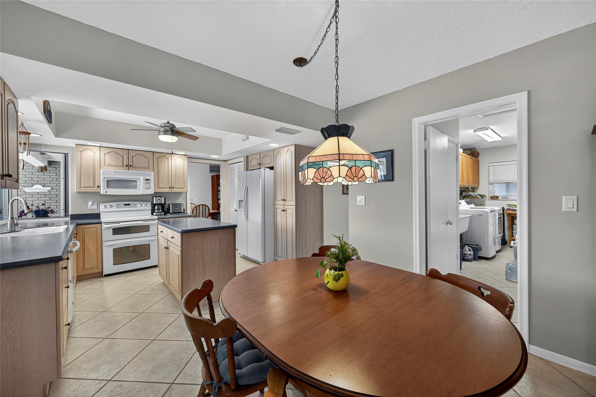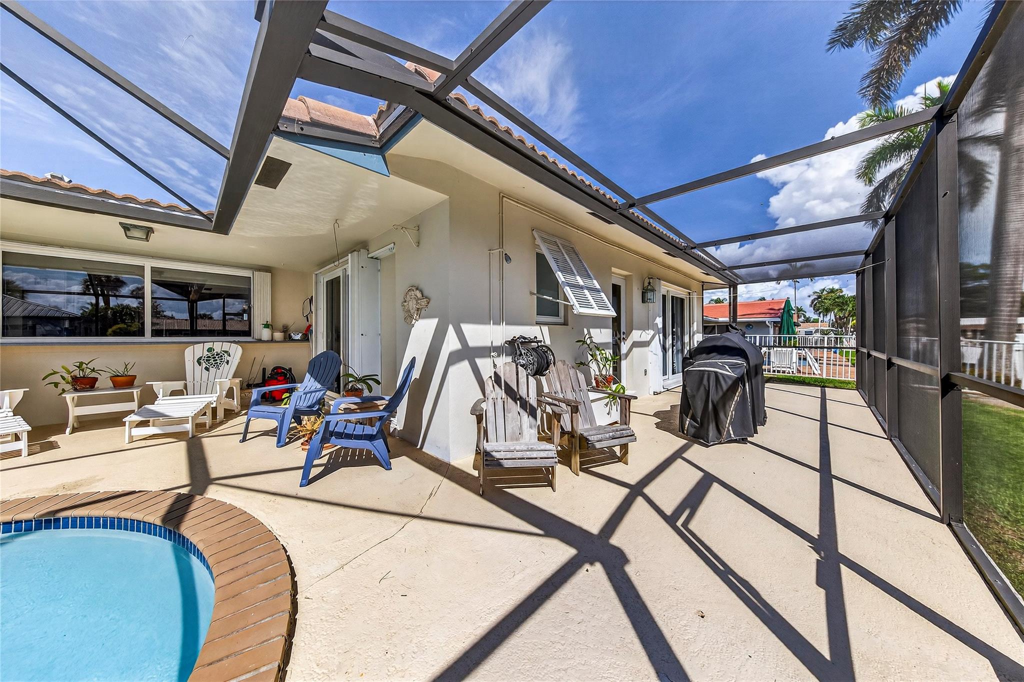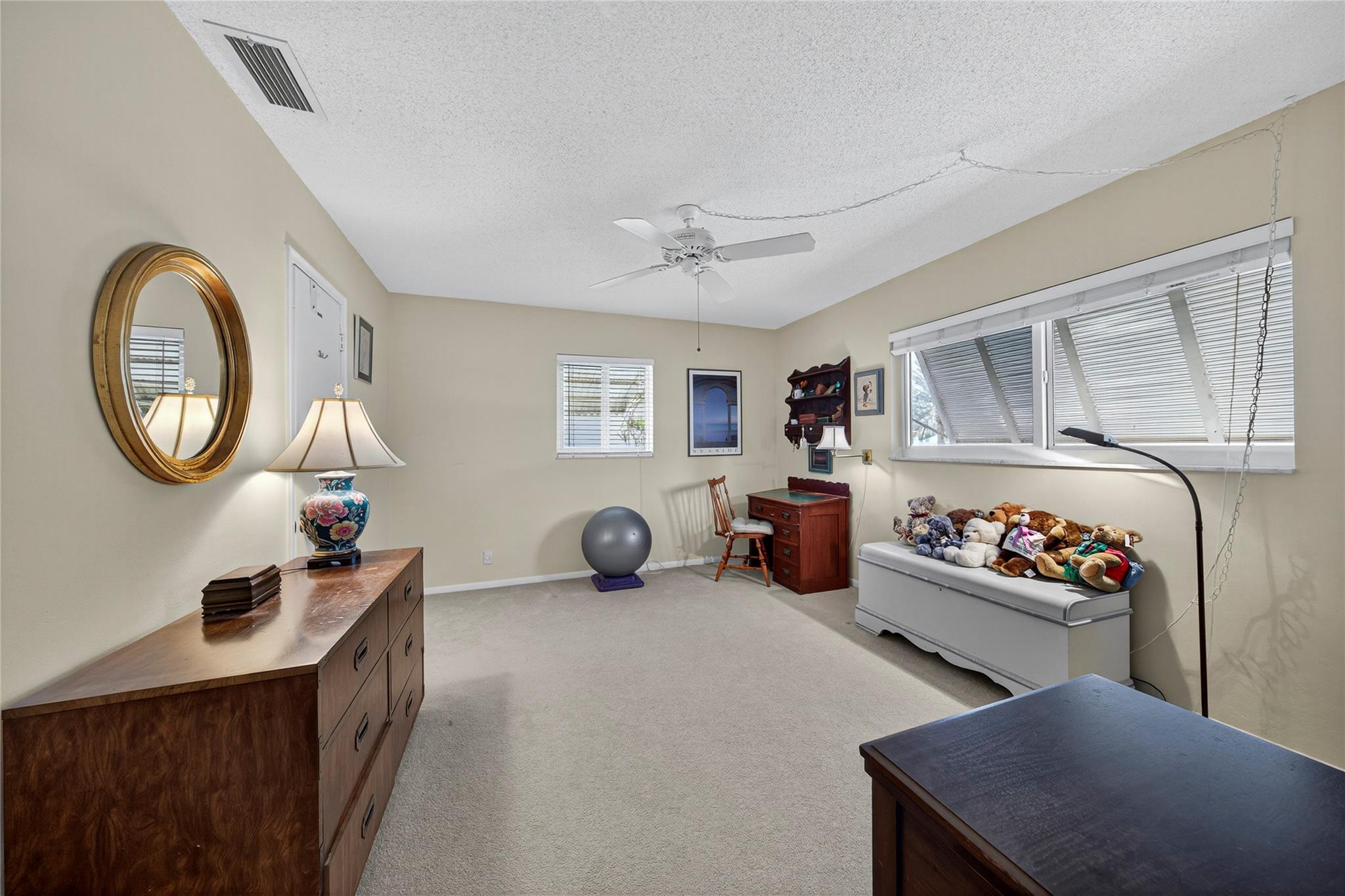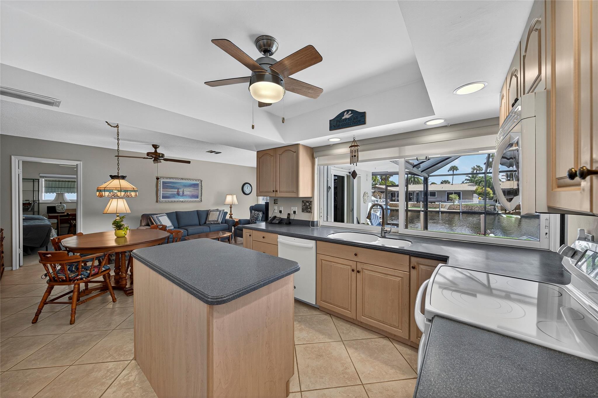 Well maintained 4 bedroom home with 2 original bathrooms, 2 car garage, screened pool and 80 feet of water frontage, one fixed bridge to ICW. Dock is composite and includes boat lift. Roof recently replaced in 2024, split package A/C units. Interior & exterior electric panels updated 2018 including generator hookup. Impact windows and doors. Kitchen is older but not original, opens to family room. Formal dining room in living room. Fourth bedroom connects to primary suite, ideal as an office, gym or nursery.
