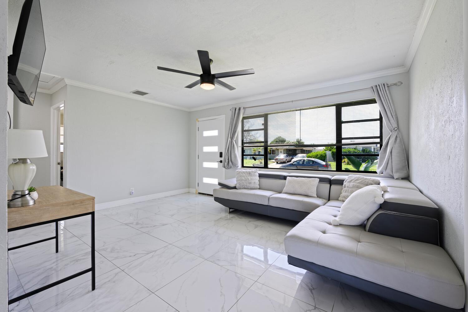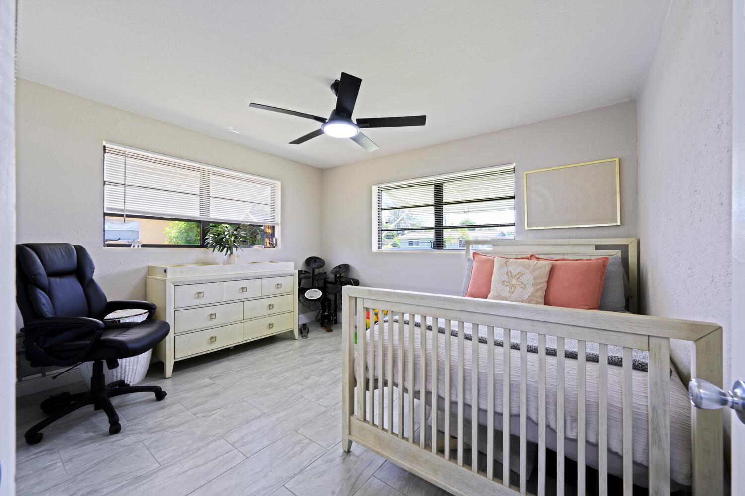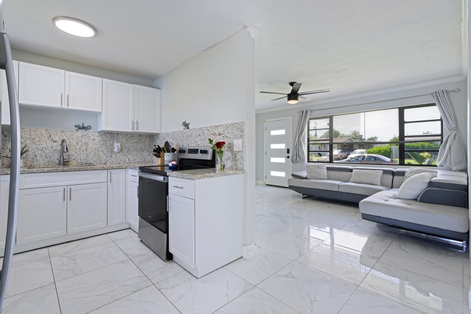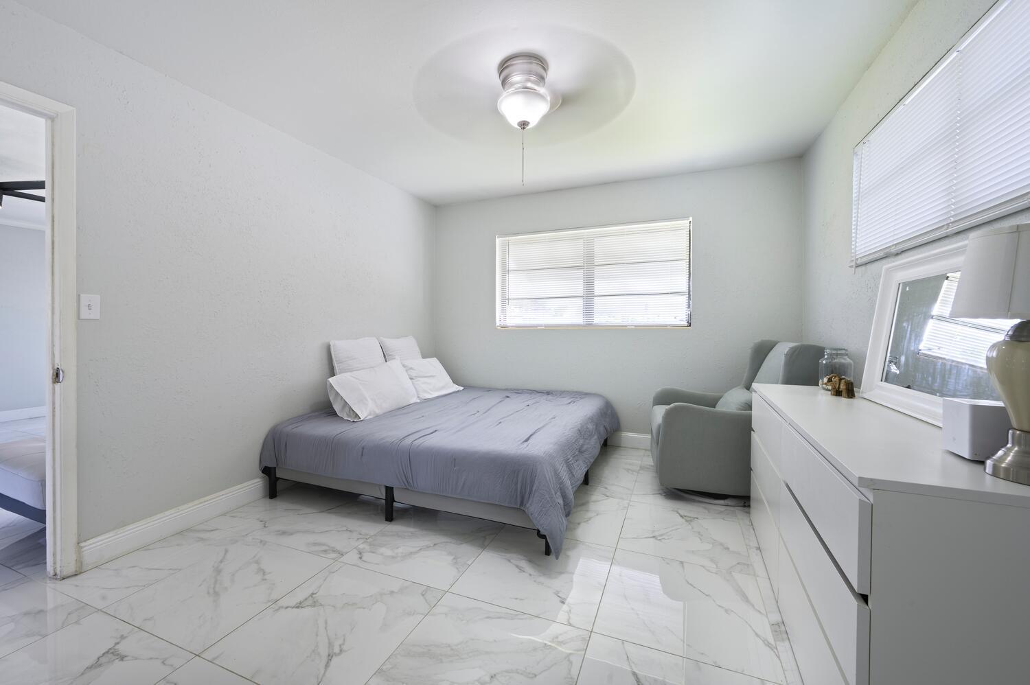 Move-in ready, newly renovated modern home with carport and laundry room with storage. Features include a new roof (2018), new appliances (2023), new water heater (2022), new central air (2022), new front door (2025), and three new rear windows (2023). Freshly painted exterior (2025) and newly epoxy-lined plumbing throughout (2023). Tile floors run throughout the home. Bright, open layout with plenty of natural light.The master suite includes an en suite bathroom with a rainfall shower, marble tile, and modern finishes. Both bathrooms are updated with contemporary lighting and a clean white and gray color scheme. The kitchen features stainless steel appliances, shaker-style cabinetry, and light granite countertops.Enjoy a large yard with mature fruit trees including mango,