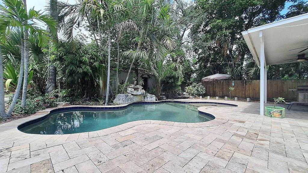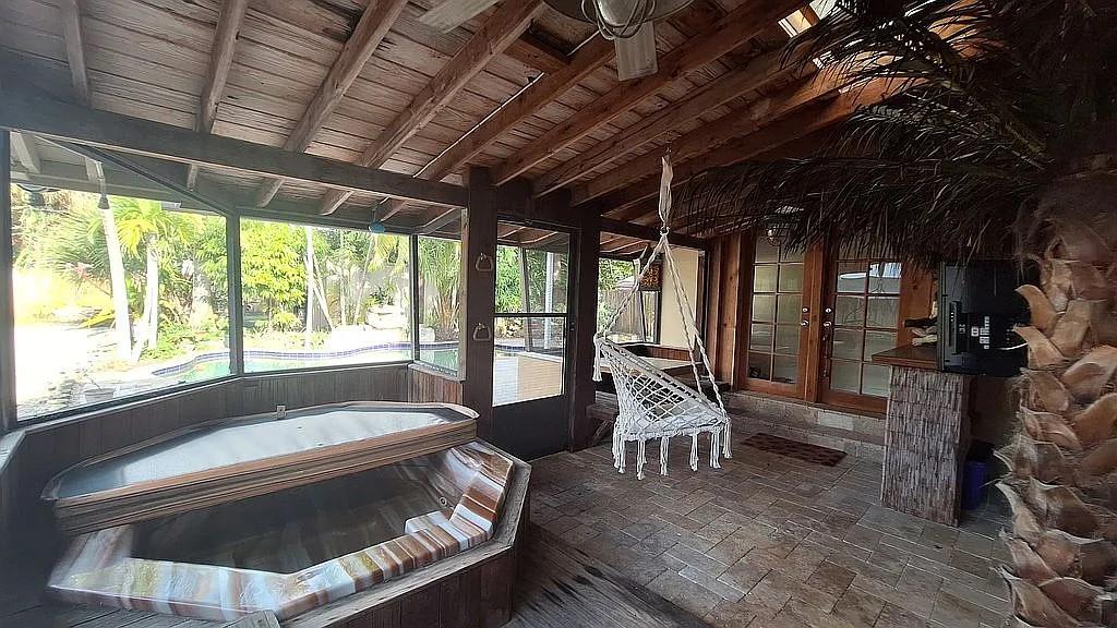 Charming 3-Bedroom, 2-Bath Home on a Spacious Lot! Welcome to this beautifully maintained home featuring vaulted wood-beam ceilings with skylights, a cozy wood-burning fireplace, and a warm blend of hardwood, travertine marble, and tile flooring throughout. Enjoy Florida living at its finest with a covered screened patio, complete with a tiki bar and jacuzzi, overlooking a uniquely designed saltwater pool. The large lot provides ample off-street parking, abundant storage—including a sizable shed—and endless possibilities. This home also offers a versatile layout with the potential for a private suite with its own separate entry. Located in a fantastic neighborhood, just minutes from Port Everglades, the airport, beaches, and major highways. Best of all, it’s not in a flood zone!