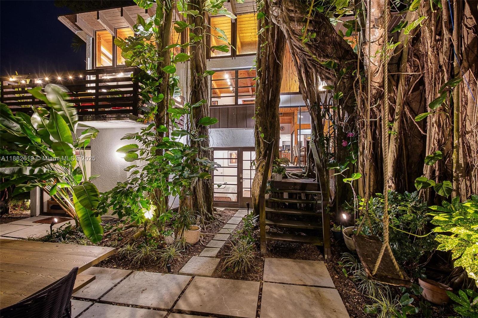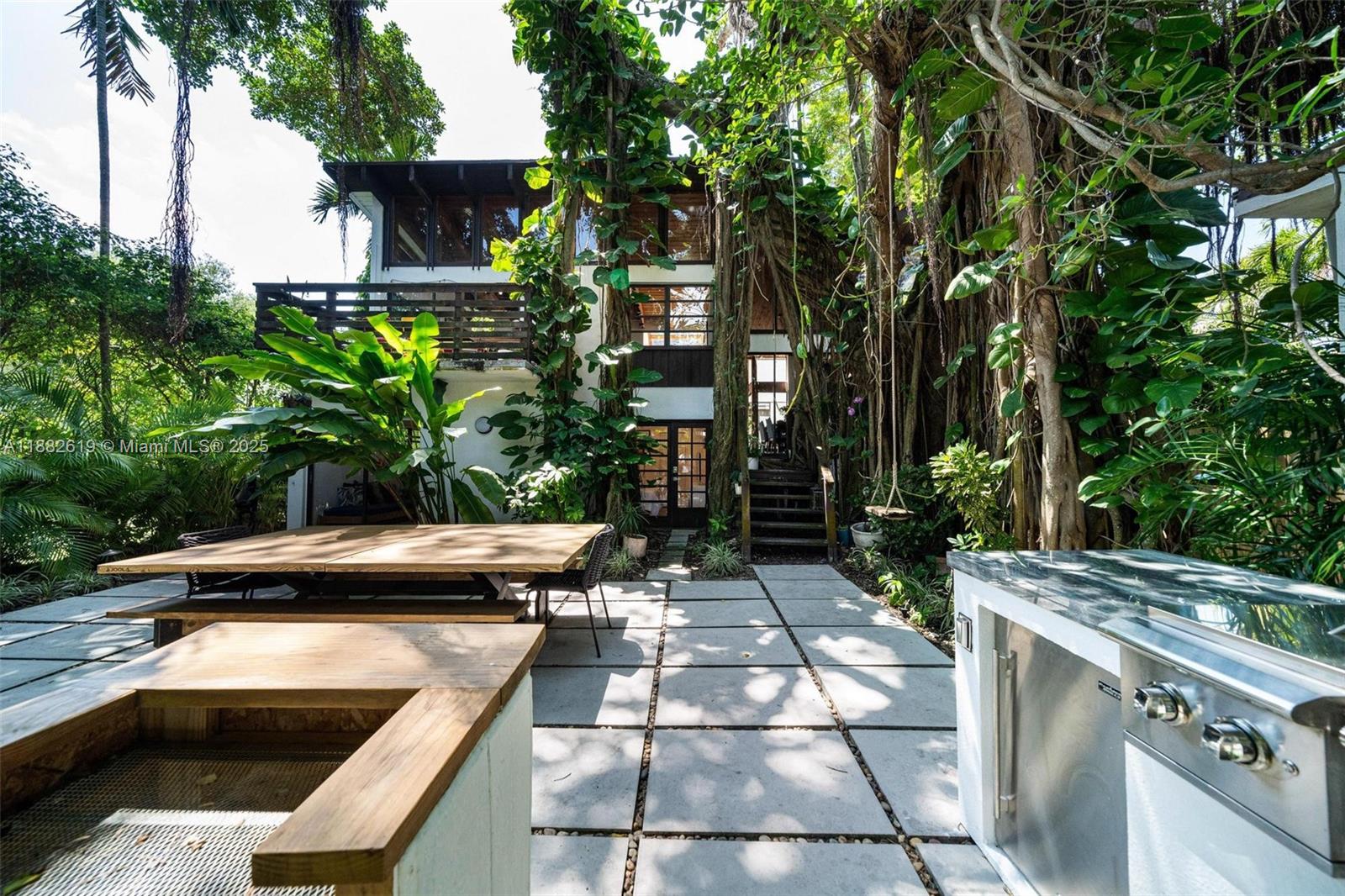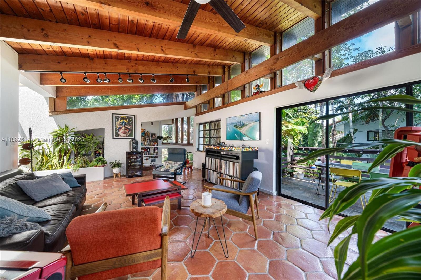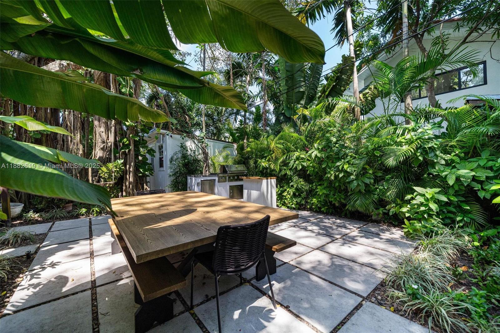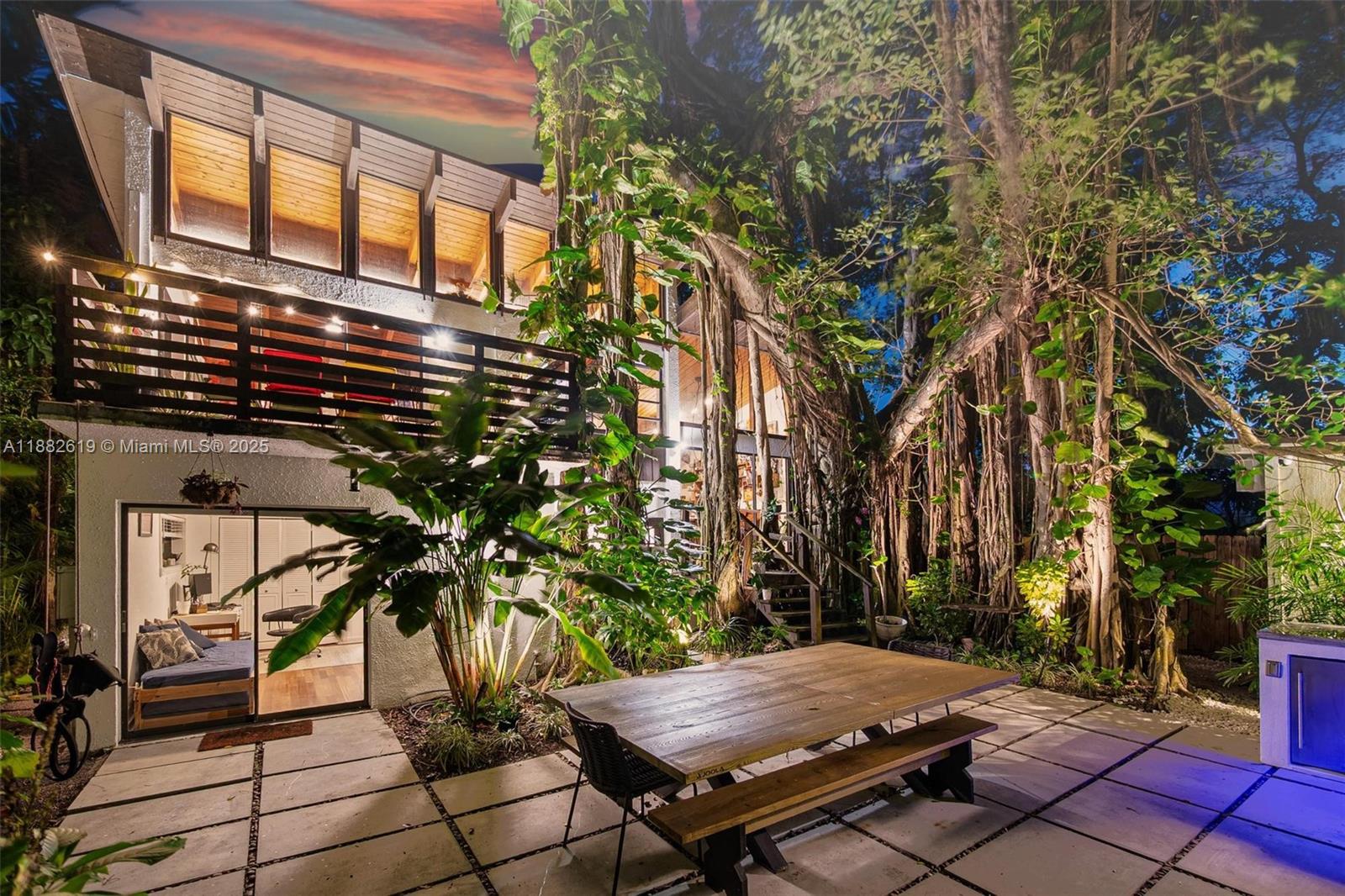 Nestled away in prime Coconut Grove on one of its most lush, tree-lined streets, this iconic Modernist gem is in perfect harmony with nature. Designed for flow and light, its soaring ceilings and jungle-style views elevate every room. This elegantly finished 3-bedroom + office + family room stuns with exotic wood floors, a sleek gas kitchen, remodeled baths, “in the trees” balcony, and “head in the stars” patio. Entertain outdoors with a dining kitchen set in a tropical garden with timed lighting and smart irrigation. Lots of space to park6-car driveway with EV outlet. Climate-controlled veranda and shed, impact windows, skylight, whirlpool tub, and updated A/C, roof, septic, and electrical. Your tropical haven awaits mango trees, hummingbirds, pure serenity in a magical setting.