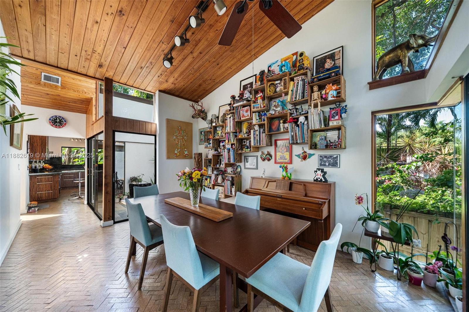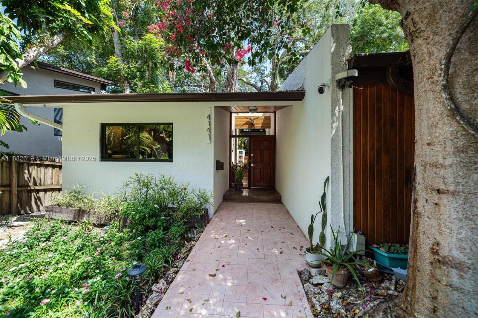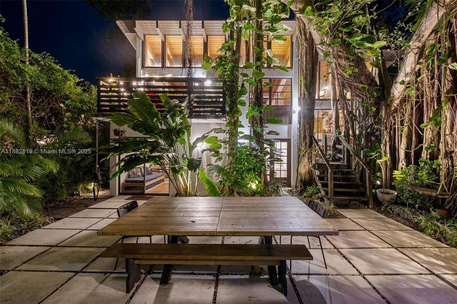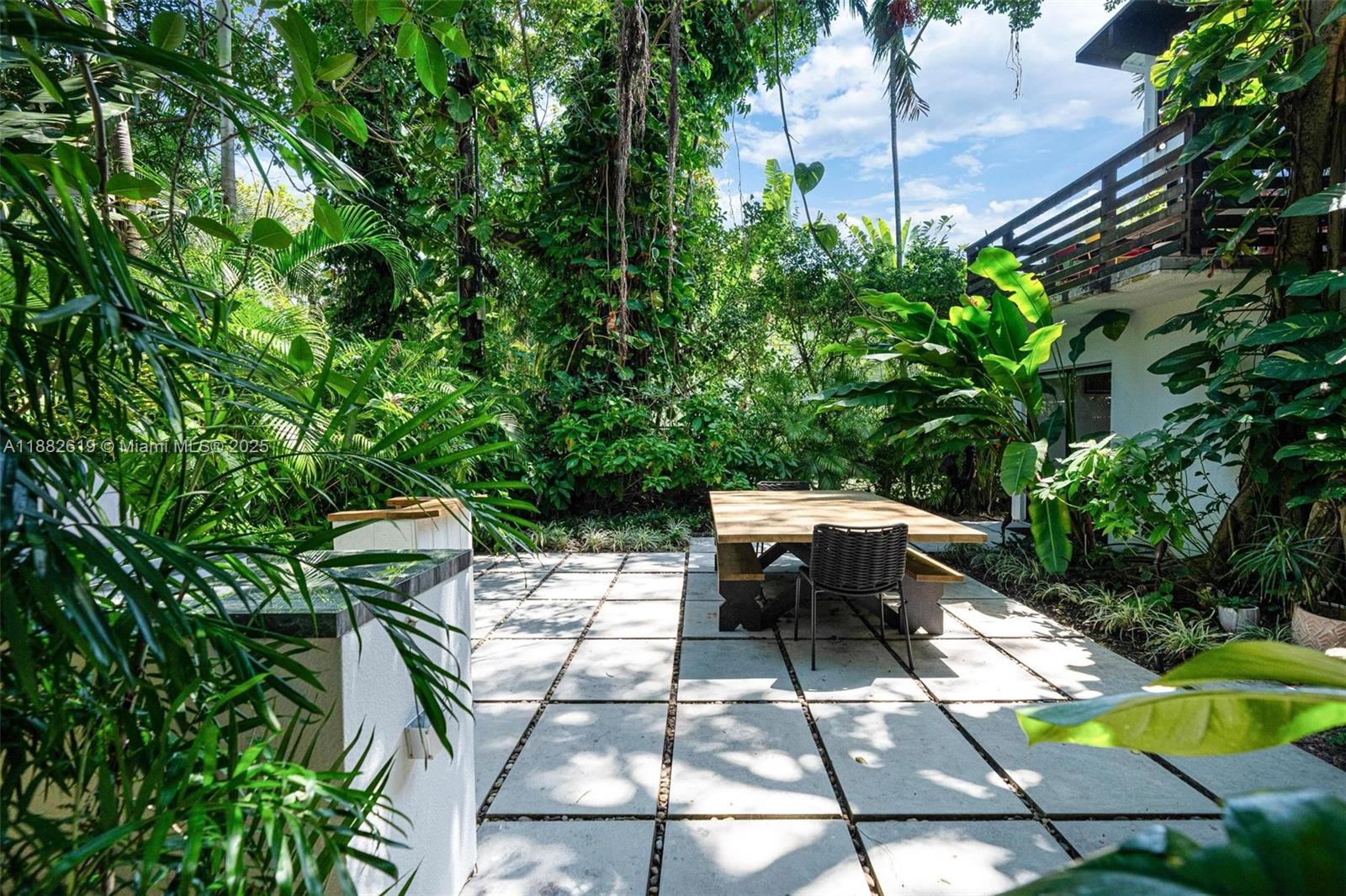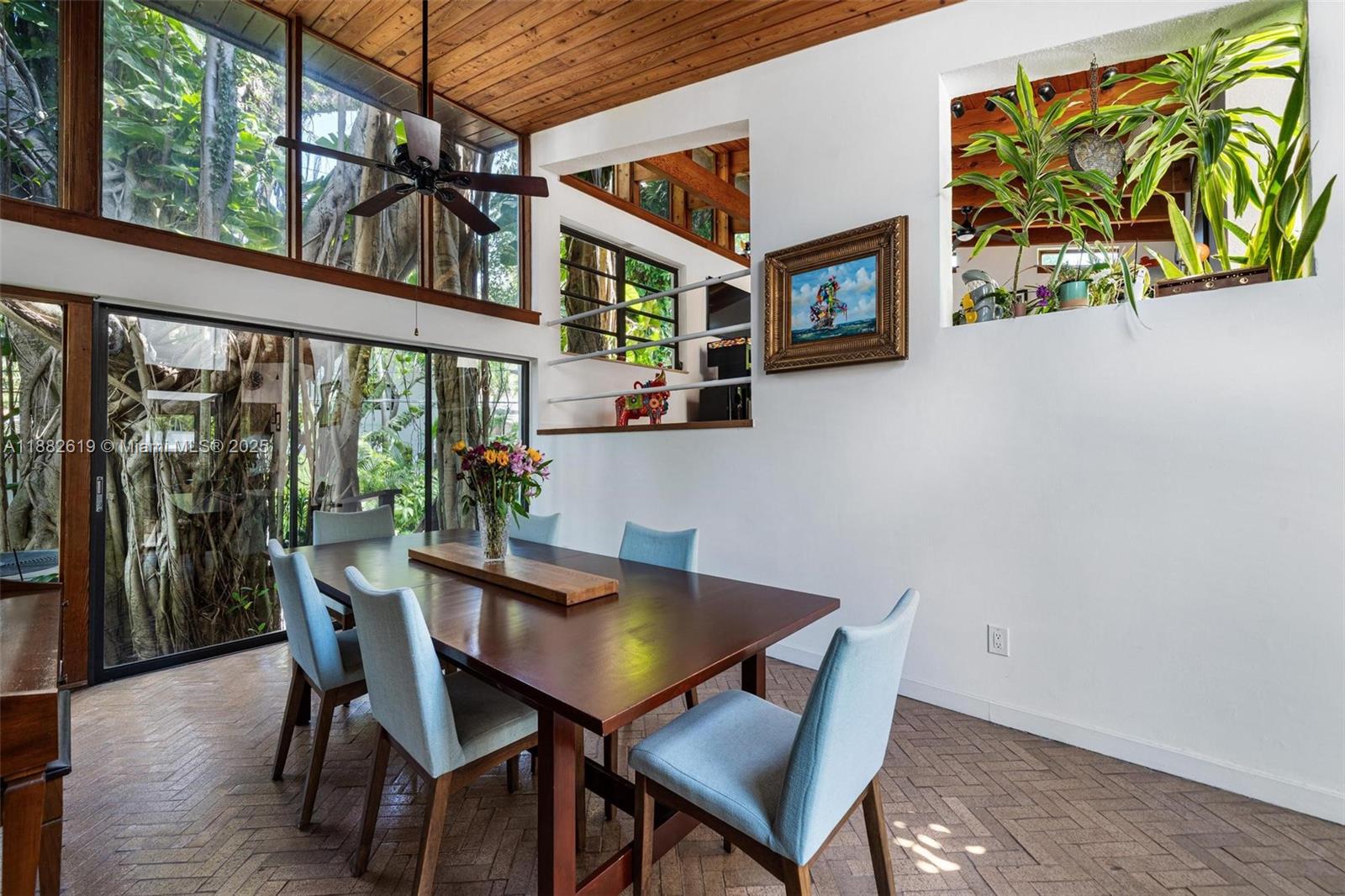Nestled away in prime Coconut Grove on one of its most lush, tree-lined streets, this iconic Modernist gem is in perfect harmony with nature. Designed for flow and light, its soaring ceilings and jungle-style views elevate every room. This elegantly finished 3-bedroom + office + family room stuns with exotic wood floors, a sleek gas kitchen, remodeled baths, “in the trees” balcony, and “head in the stars” patio. Entertain outdoors with a dining kitchen set in a tropical garden with timed lighting and smart irrigation. Lots of space to park6-car driveway with EV outlet. Climate-controlled veranda and shed, impact windows, skylight, whirlpool tub, and updated A/C, roof, septic, and electrical. Your tropical haven awaits mango trees, hummingbirds, pure serenity in a magical setting.