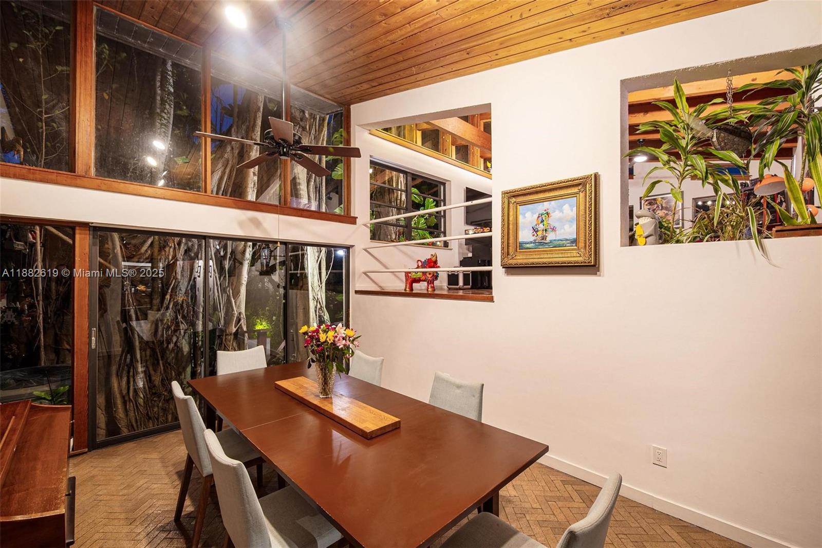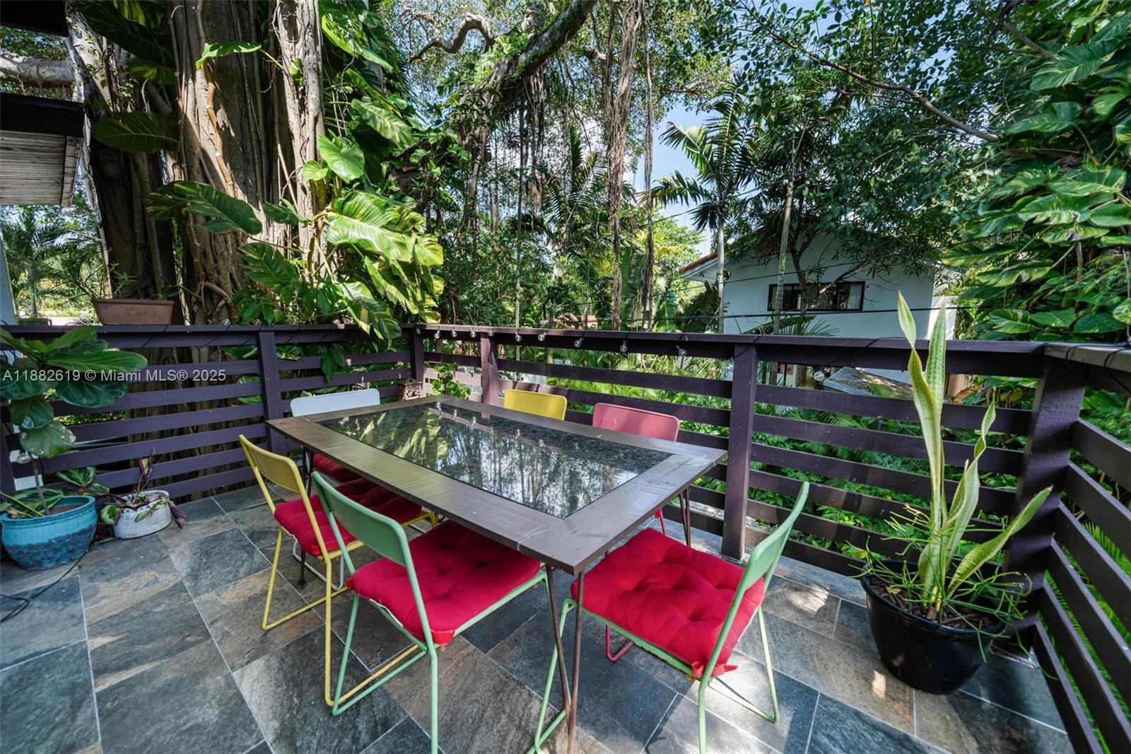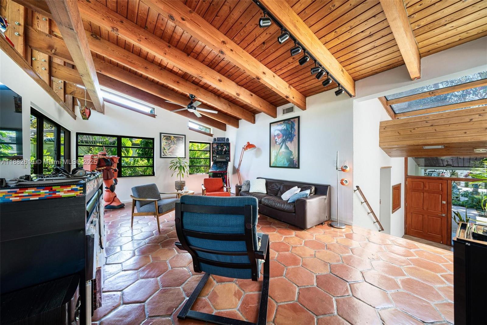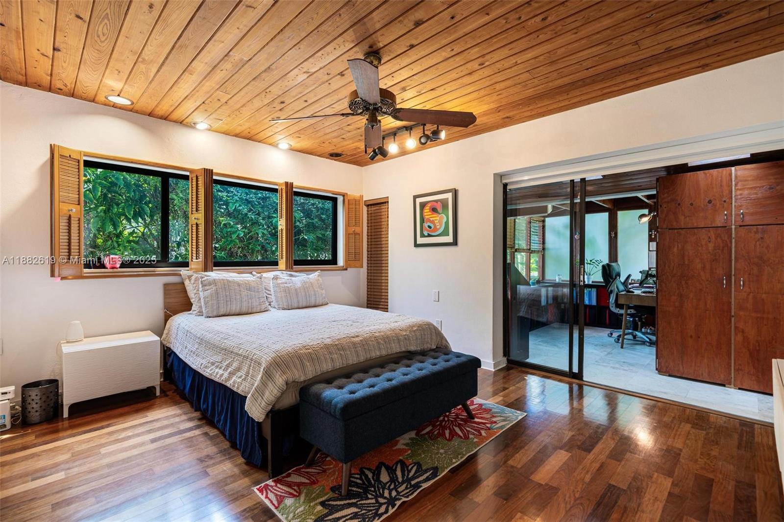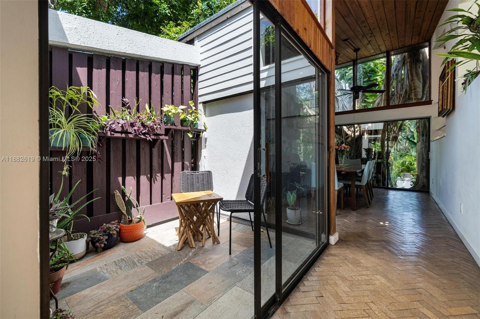 Nestled away in prime Coconut Grove on one of its most lush, tree-lined streets, this iconic Modernist gem is in perfect harmony with nature. Designed for flow and light, its soaring ceilings and jungle-style views elevate every room. This elegantly finished 3-bedroom + office + family room stuns with exotic wood floors, a sleek gas kitchen, remodeled baths, “in the trees” balcony, and “head in the stars” patio. Entertain outdoors with a dining kitchen set in a tropical garden with timed lighting and smart irrigation. Lots of space to park6-car driveway with EV outlet. Climate-controlled veranda and shed, impact windows, skylight, whirlpool tub, and updated A/C, roof, septic, and electrical. Your tropical haven awaits mango trees, hummingbirds, pure serenity in a magical setting.
