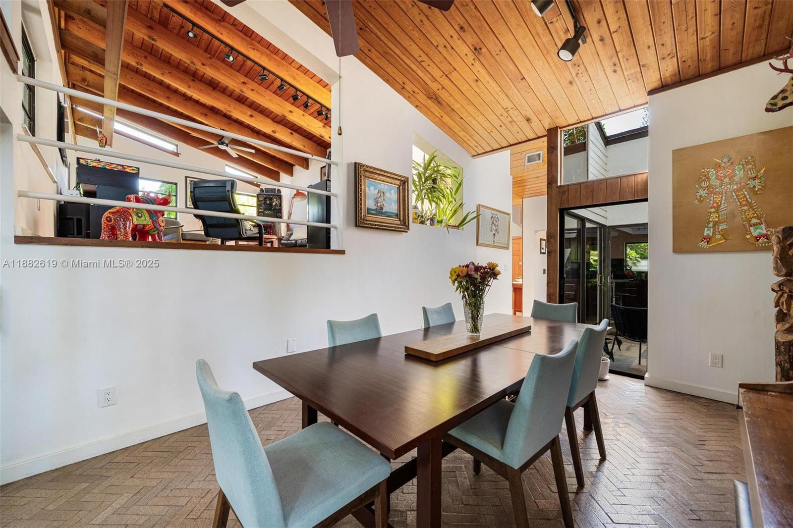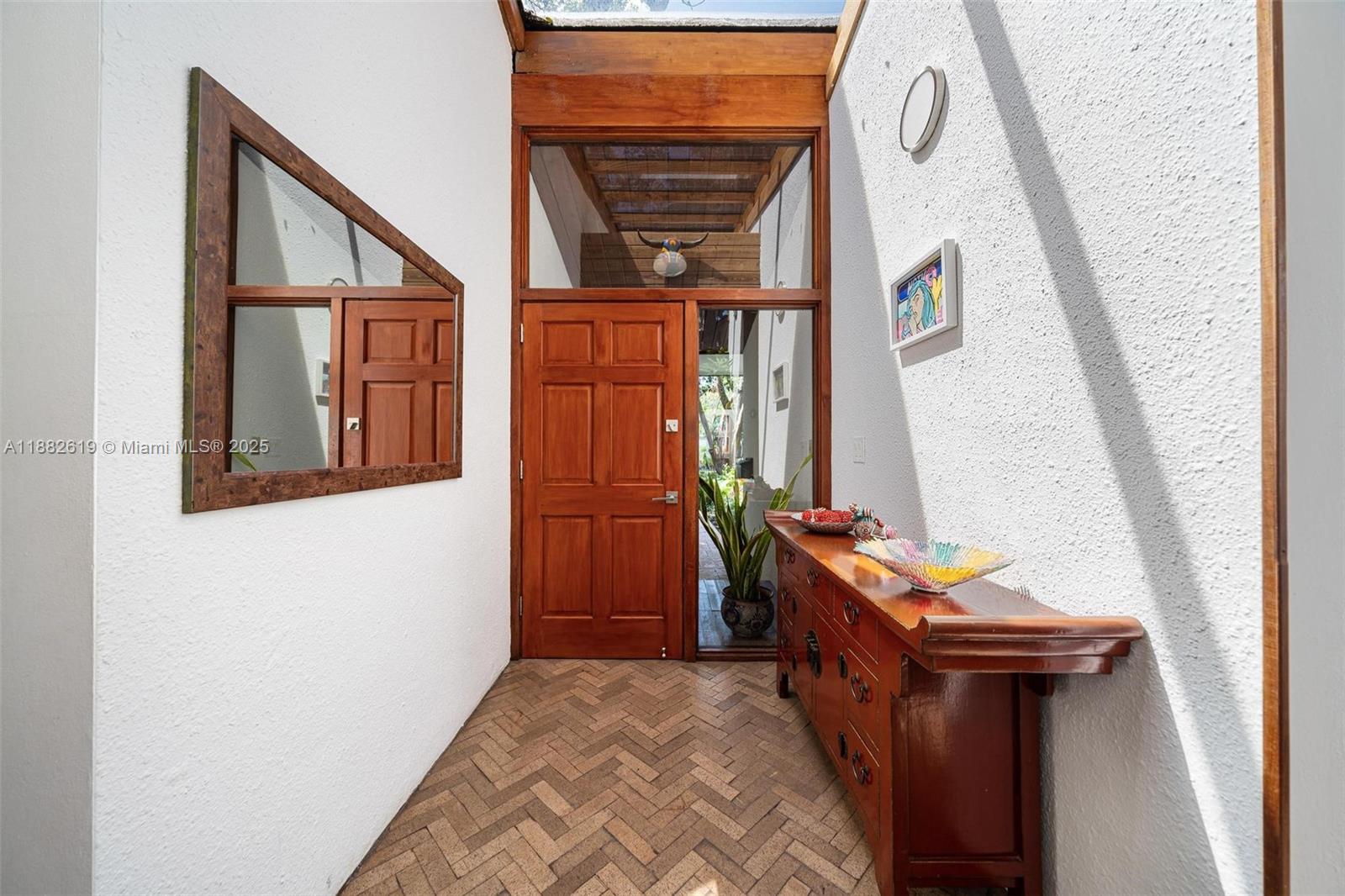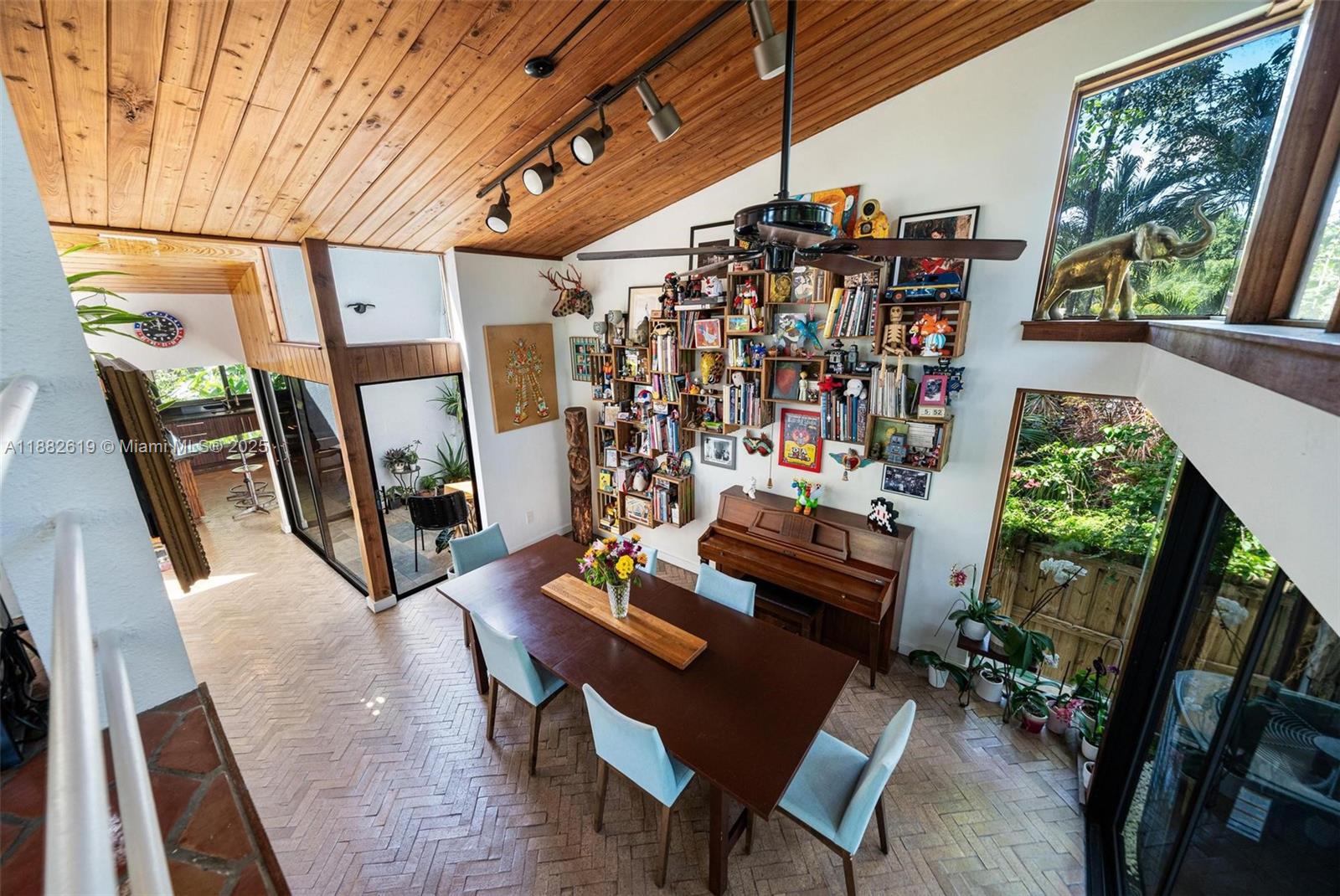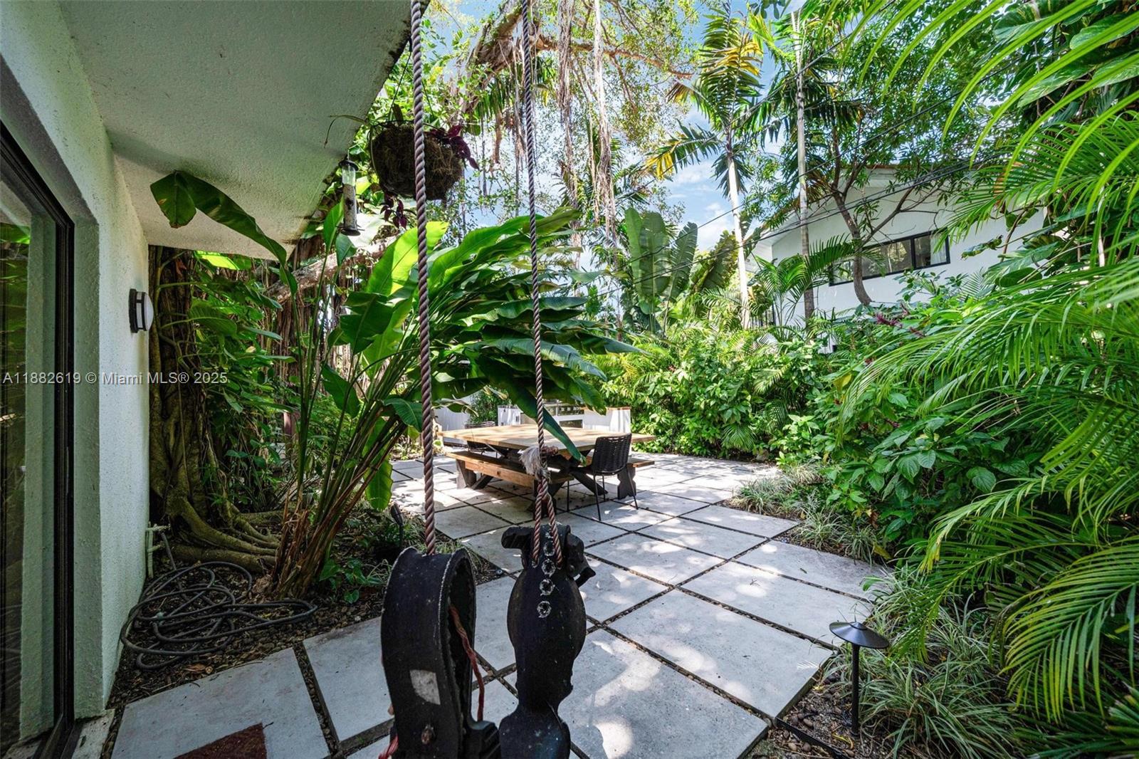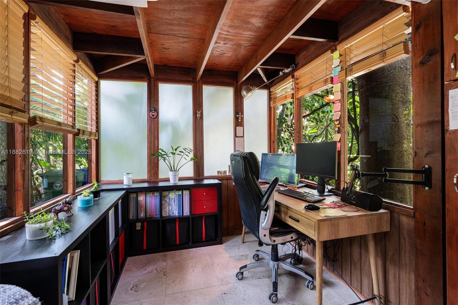 Nestled away in prime Coconut Grove on one of its most lush, tree-lined streets, this iconic Modernist gem is in perfect harmony with nature. Designed for flow and light, its soaring ceilings and jungle-style views elevate every room. This elegantly finished 3-bedroom + office + family room stuns with exotic wood floors, a sleek gas kitchen, remodeled baths, “in the trees” balcony, and “head in the stars” patio. Entertain outdoors with a dining kitchen set in a tropical garden with timed lighting and smart irrigation. Lots of space to park6-car driveway with EV outlet. Climate-controlled veranda and shed, impact windows, skylight, whirlpool tub, and updated A/C, roof, septic, and electrical. Your tropical haven awaits mango trees, hummingbirds, pure serenity in a magical setting.