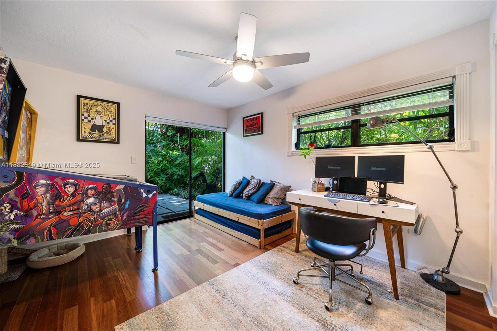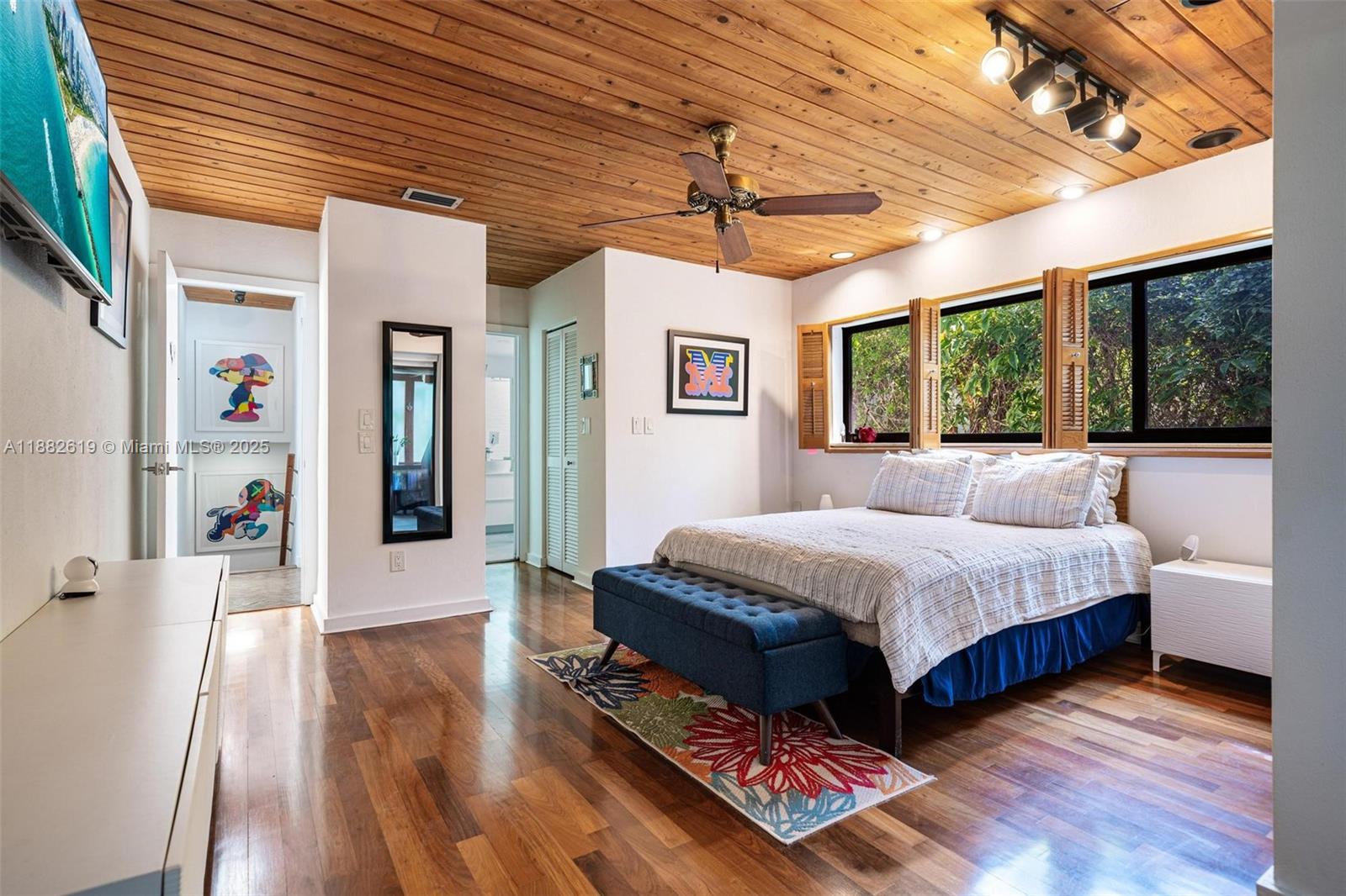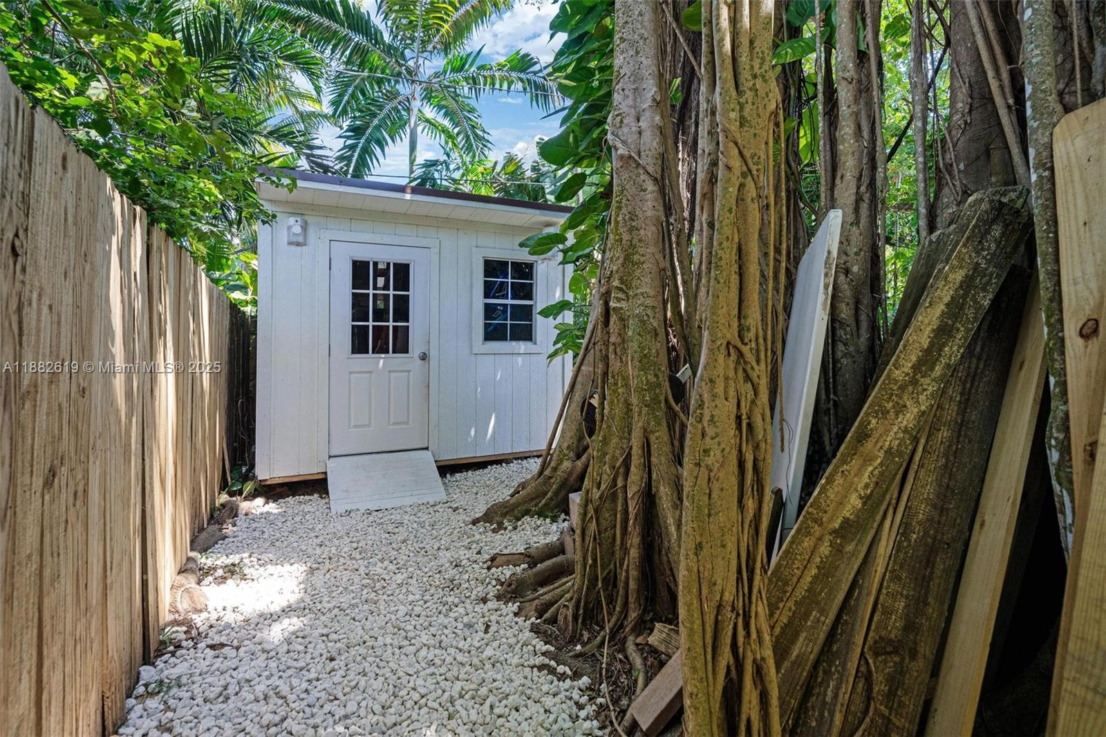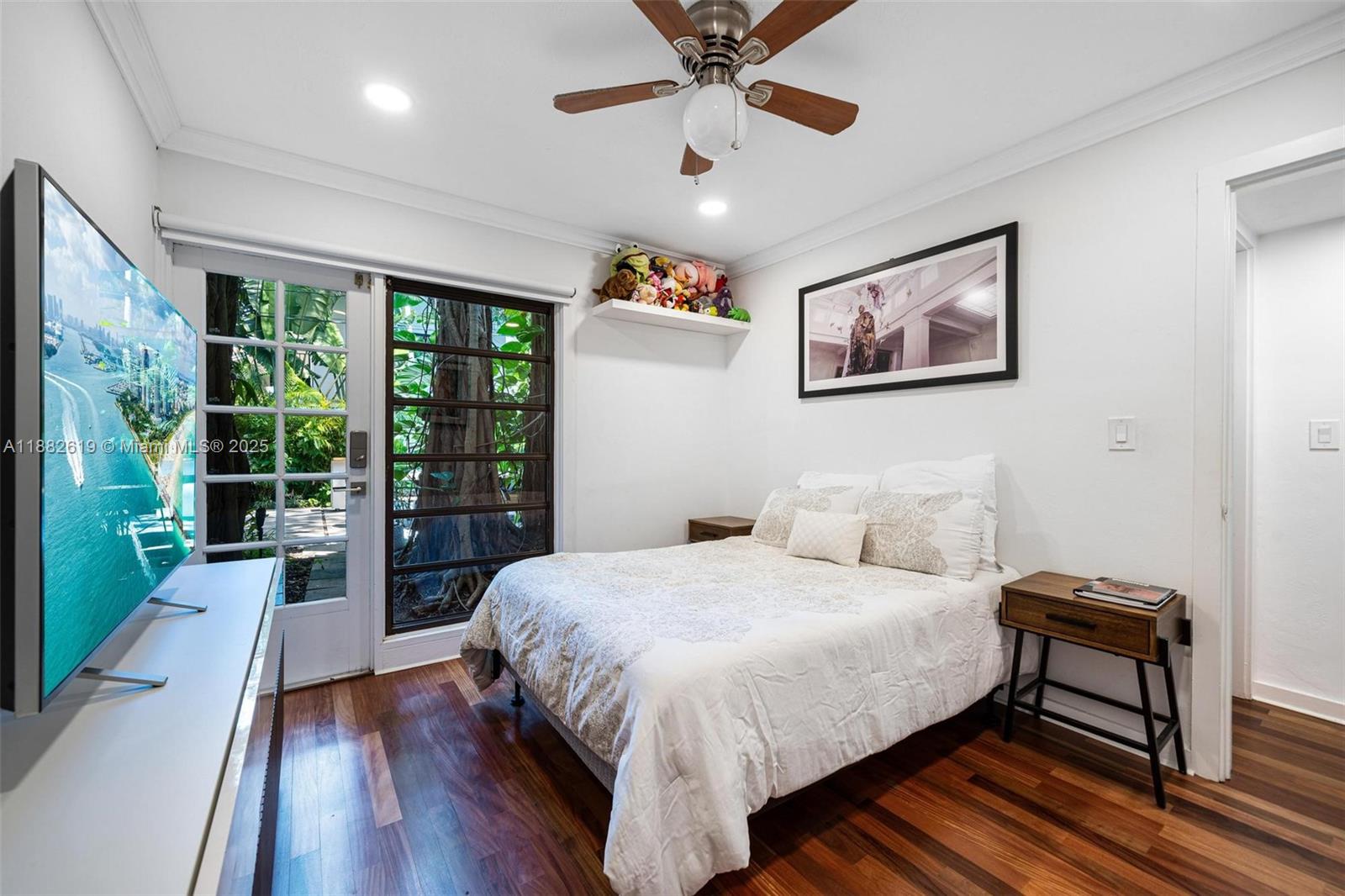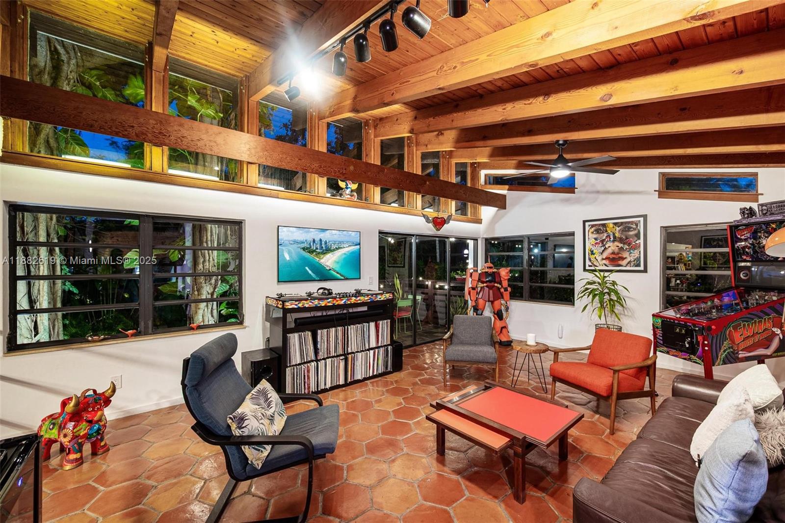 Nestled away in prime Coconut Grove on one of its most lush, tree-lined streets, this iconic Modernist gem is in perfect harmony with nature. Designed for flow and light, its soaring ceilings and jungle-style views elevate every room. This elegantly finished 3-bedroom + office + family room stuns with exotic wood floors, a sleek gas kitchen, remodeled baths, “in the trees” balcony, and “head in the stars” patio. Entertain outdoors with a dining kitchen set in a tropical garden with timed lighting and smart irrigation. Lots of space to park6-car driveway with EV outlet. Climate-controlled veranda and shed, impact windows, skylight, whirlpool tub, and updated A/C, roof, septic, and electrical. Your tropical haven awaits mango trees, hummingbirds, pure serenity in a magical setting.