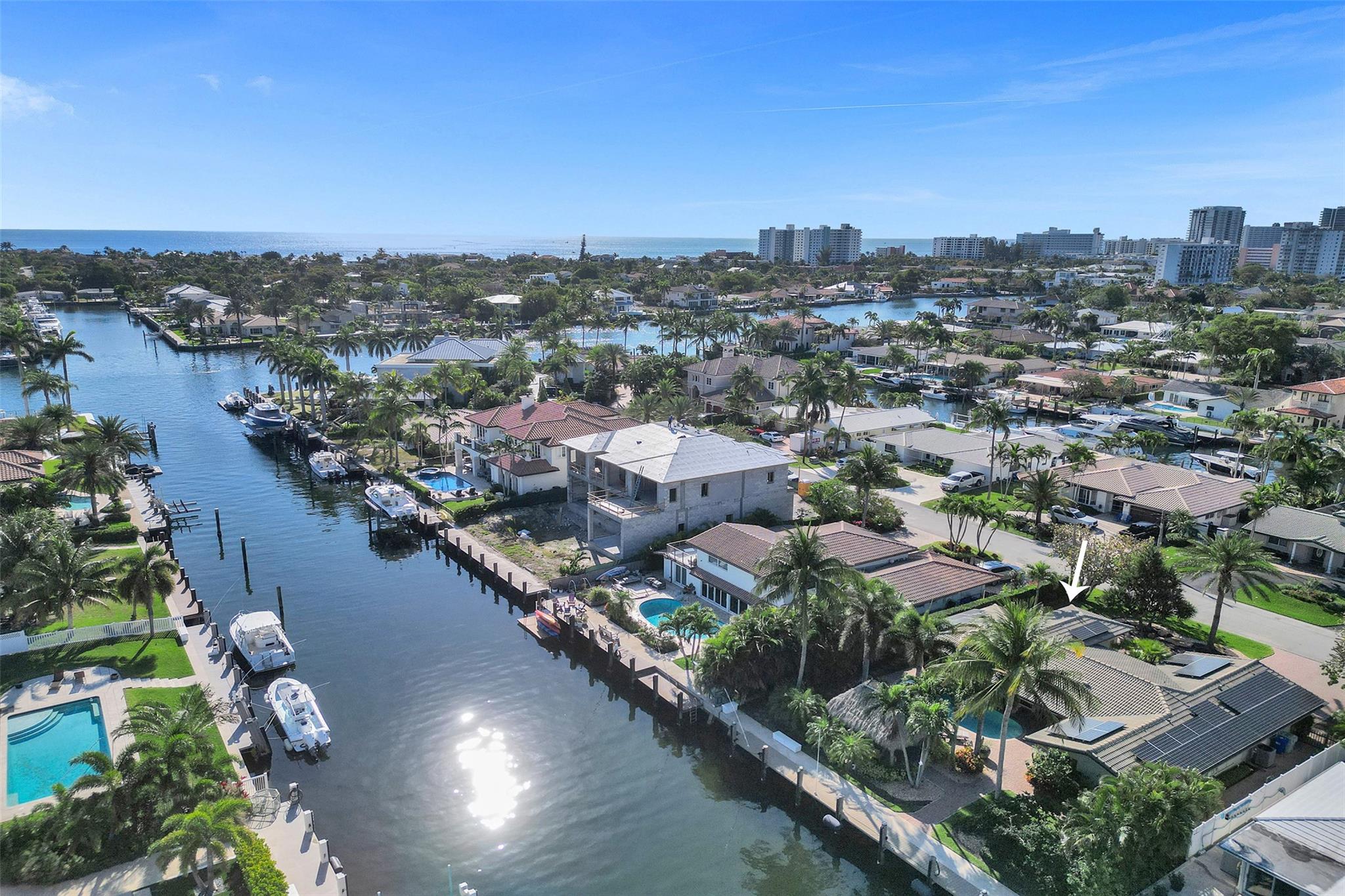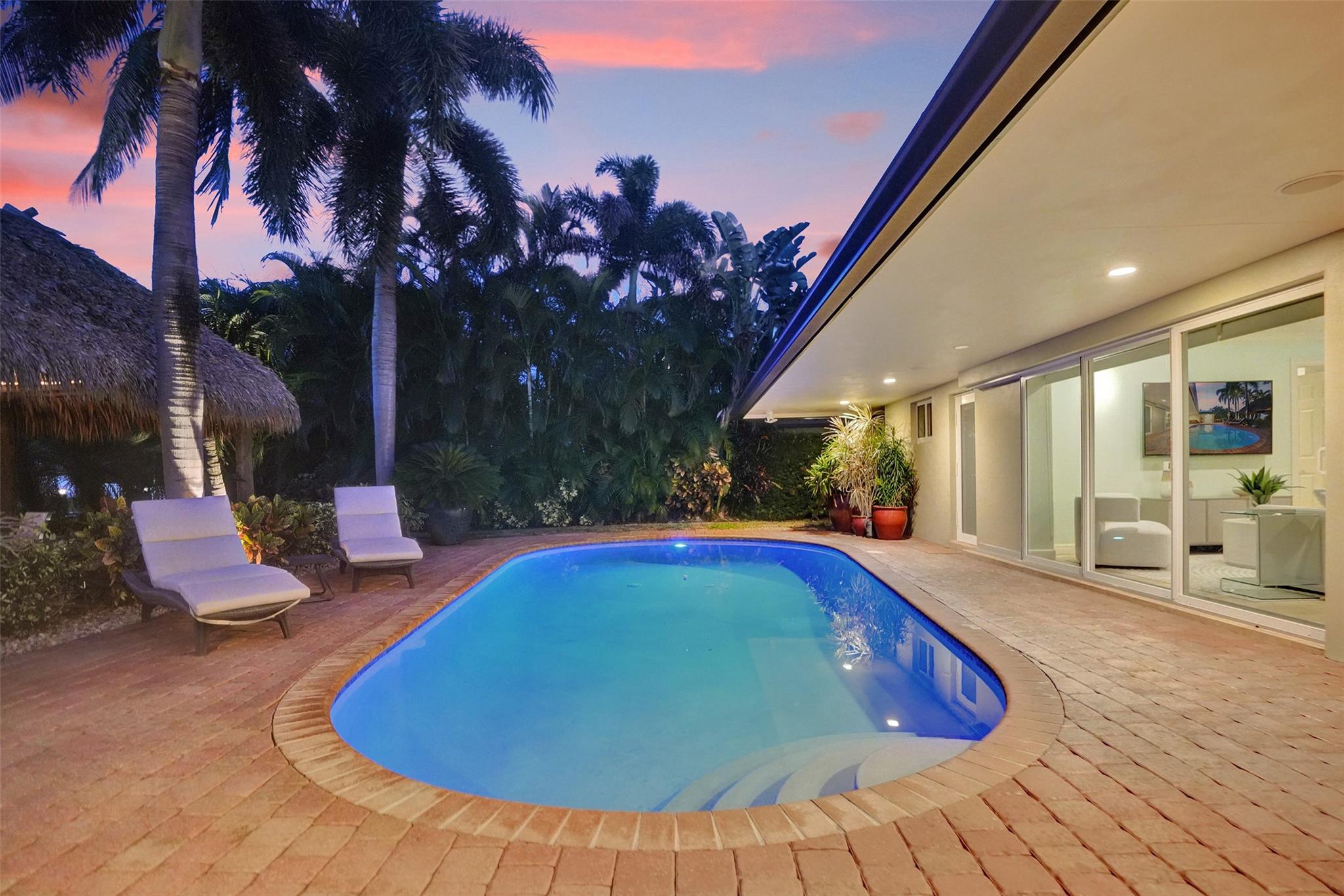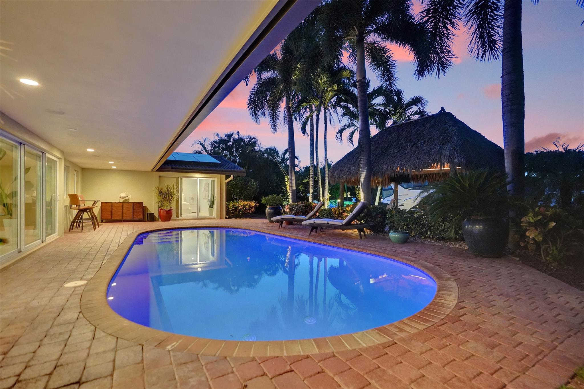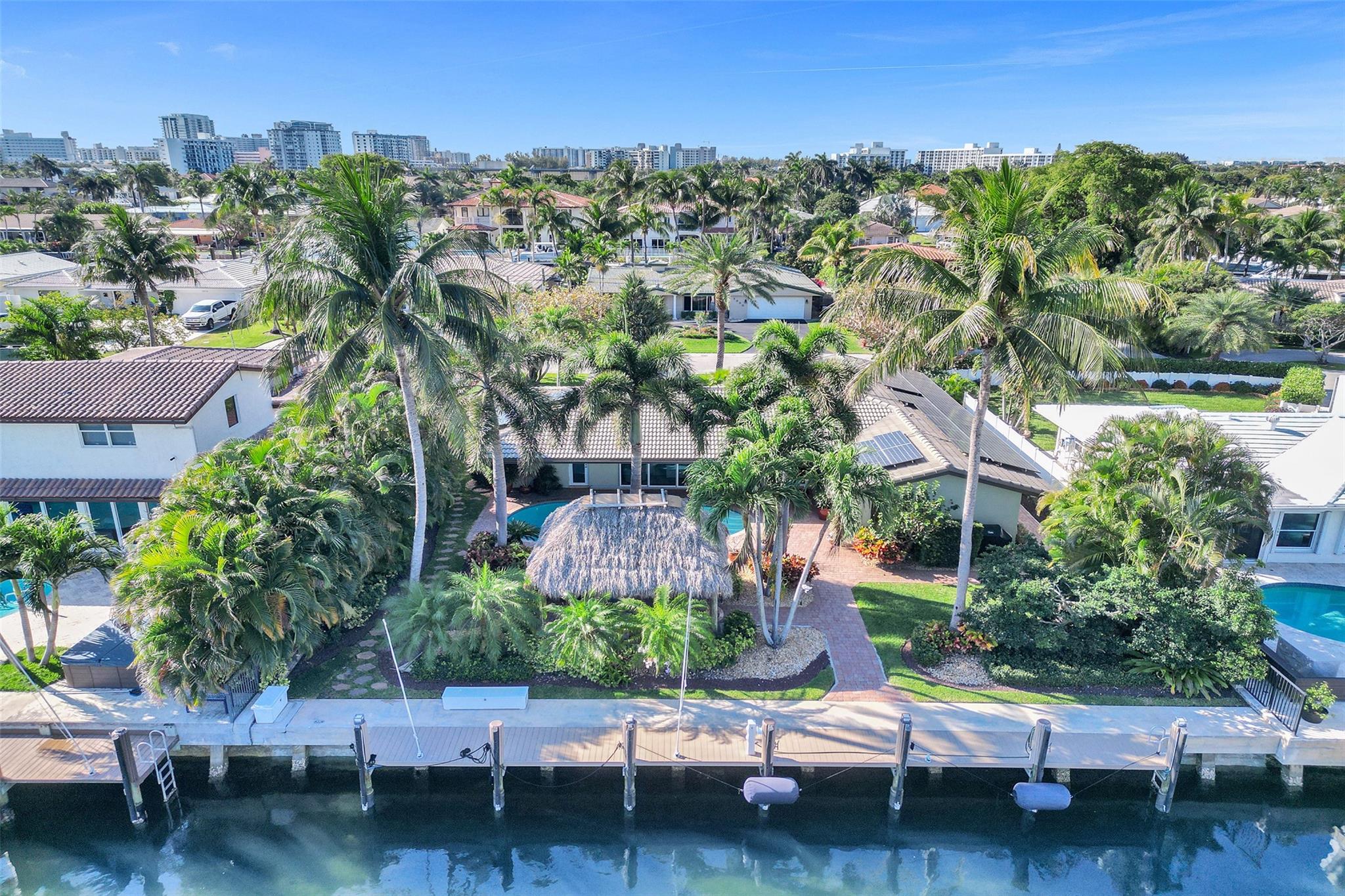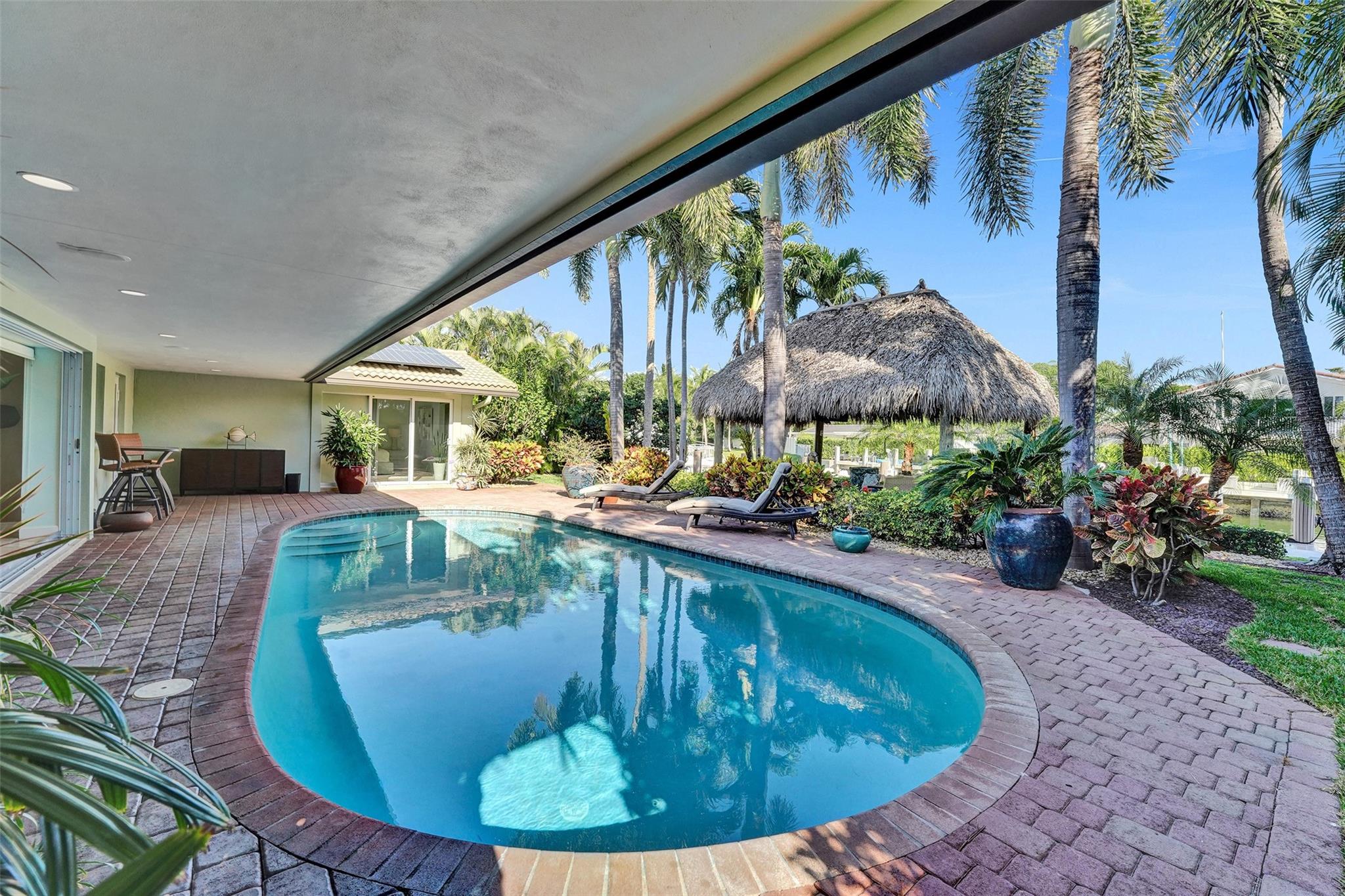 This stunning 2-bed 2-bath w/ office, fully rebuilt in 2008, home on a cul-de-sac offers 80 ft of waterfront & 60 ft of dock, no fixed bridges, & direct access to Intracoastal & ocean—just 6 houses in from the Intracoastal & minutes to the Hillsboro Inlet! Nestled on a spacious 9,600 sq ft lot, this home features a heated pool, an outdoor shower, & a tiki hut—perfect for evening entertaining. Enjoy the added benefits of solar panels & peace of mind w/hurricane impact windows & doors. The property includes a 2-car garage, w/plenty of storage & parking. Boating enthusiasts will appreciate the updated seawall/dock with view of the lighthouse! Income producing dock. A split floor plan provides privacy, & the kitchen boasts Bosch appliances w/ a gas range. Natural Travertine Floors thru out.
