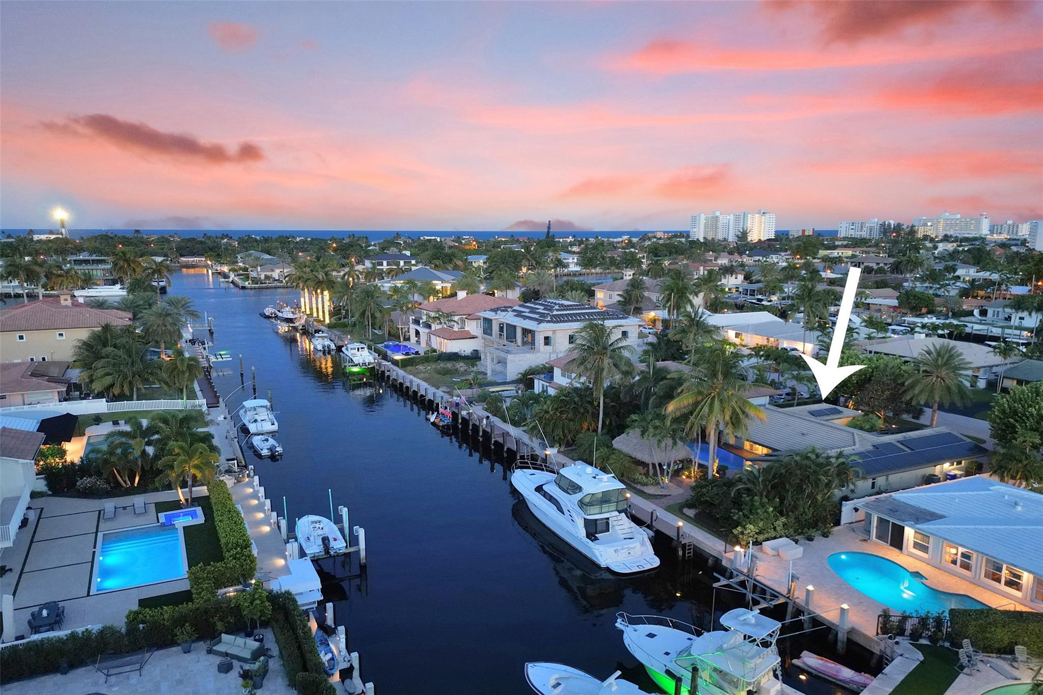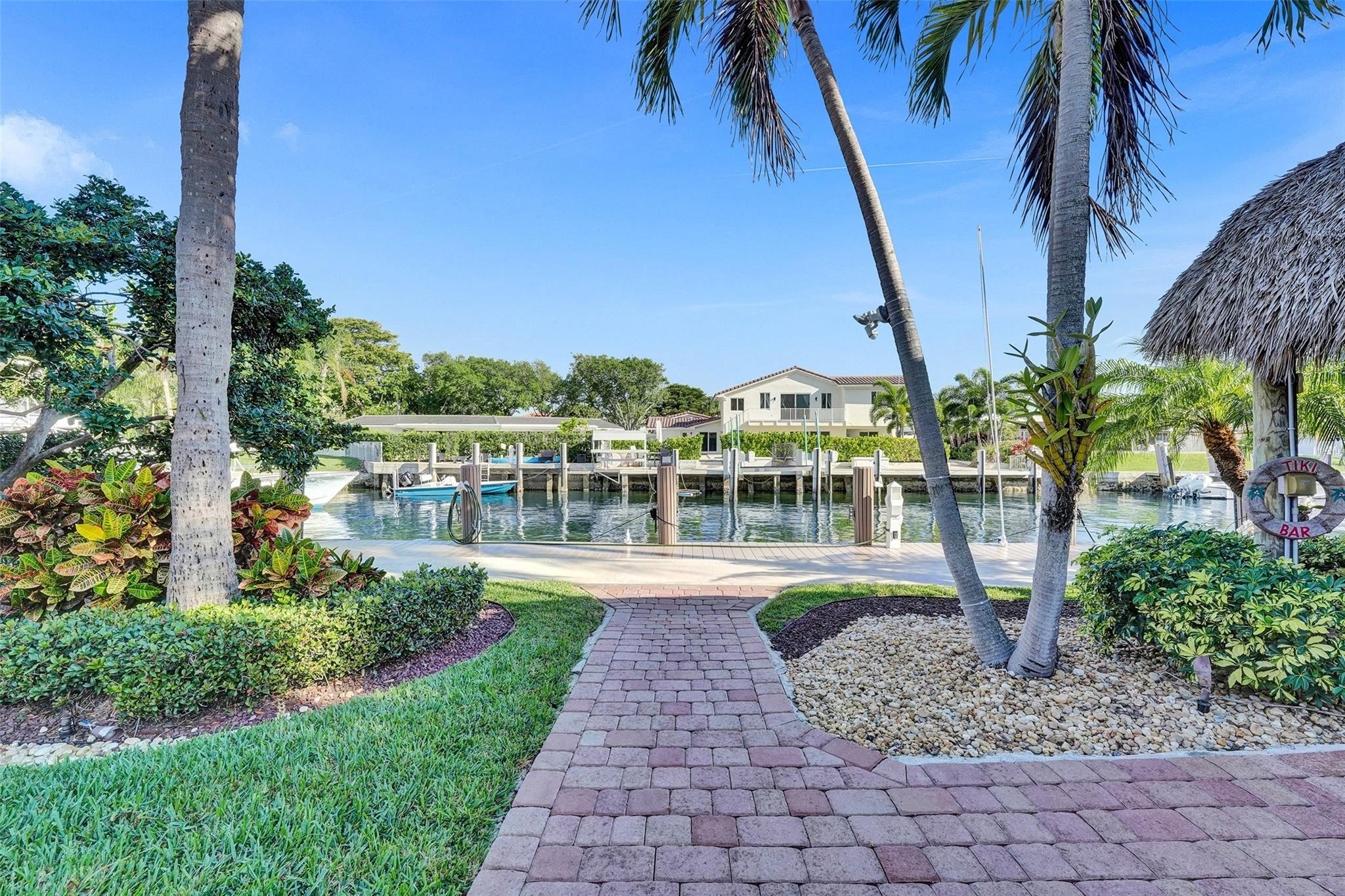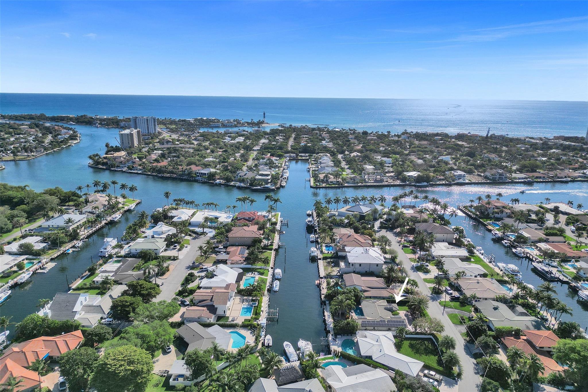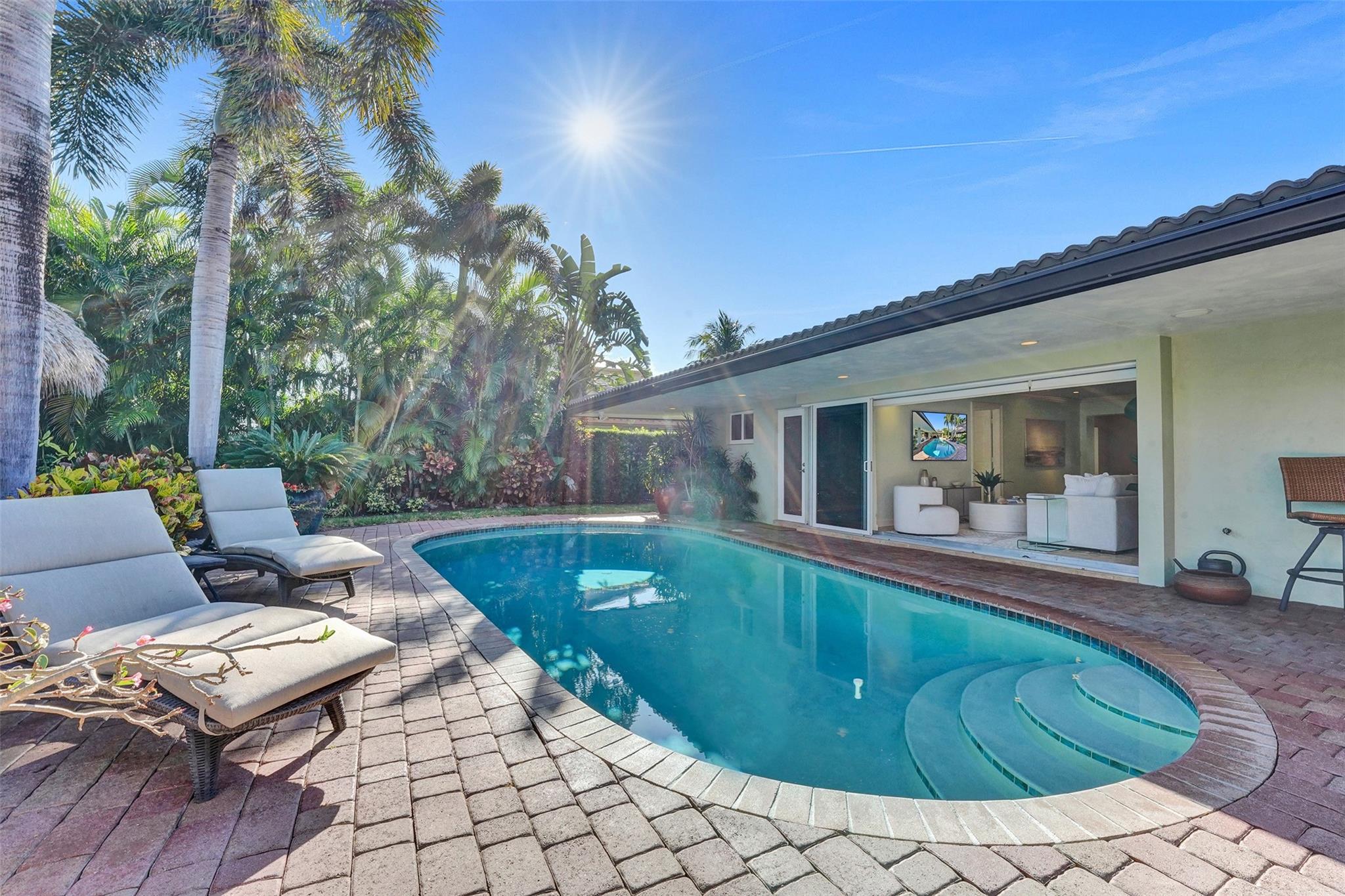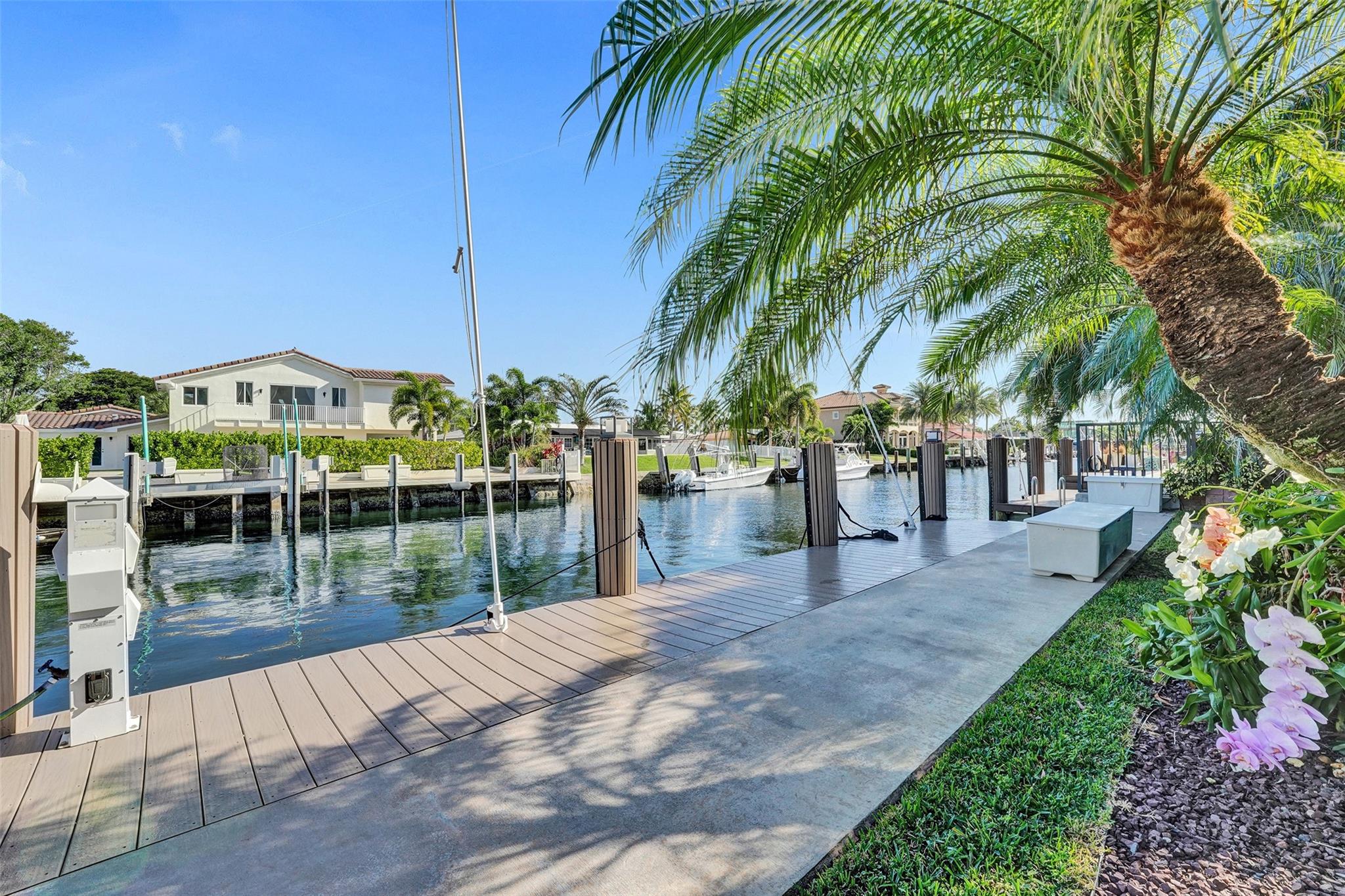 This stunning 2-bed 2-bath w/ office, fully rebuilt in 2008, home on a cul-de-sac offers 80 ft of waterfront & 60 ft of dock, no fixed bridges, & direct access to Intracoastal & ocean—just 6 houses in from the Intracoastal & minutes to the Hillsboro Inlet! Nestled on a spacious 9,600 sq ft lot, this home features a heated pool, an outdoor shower, & a tiki hut—perfect for evening entertaining. Enjoy the added benefits of solar panels & peace of mind w/hurricane impact windows & doors. The property includes a 2-car garage, w/plenty of storage & parking. Boating enthusiasts will appreciate the updated seawall/dock with view of the lighthouse! Income producing dock. A split floor plan provides privacy, & the kitchen boasts Bosch appliances w/ a gas range. Natural Travertine Floors thru out.