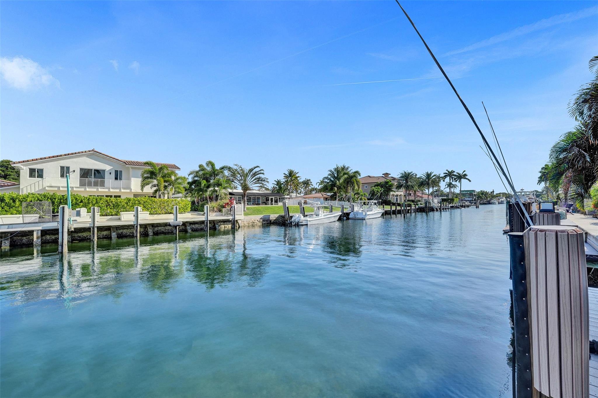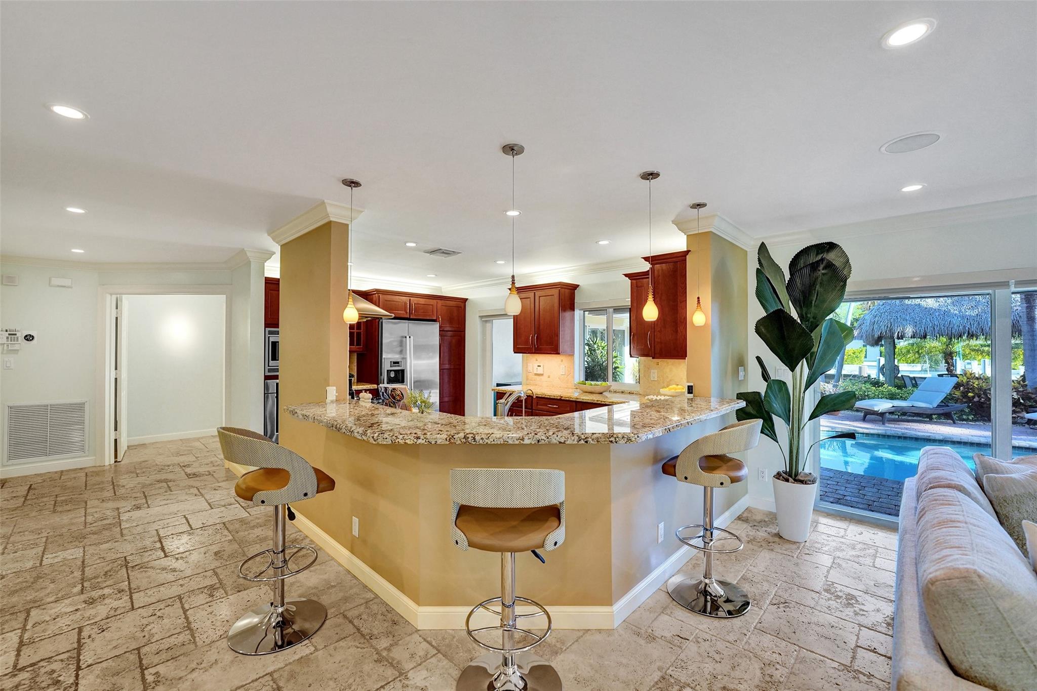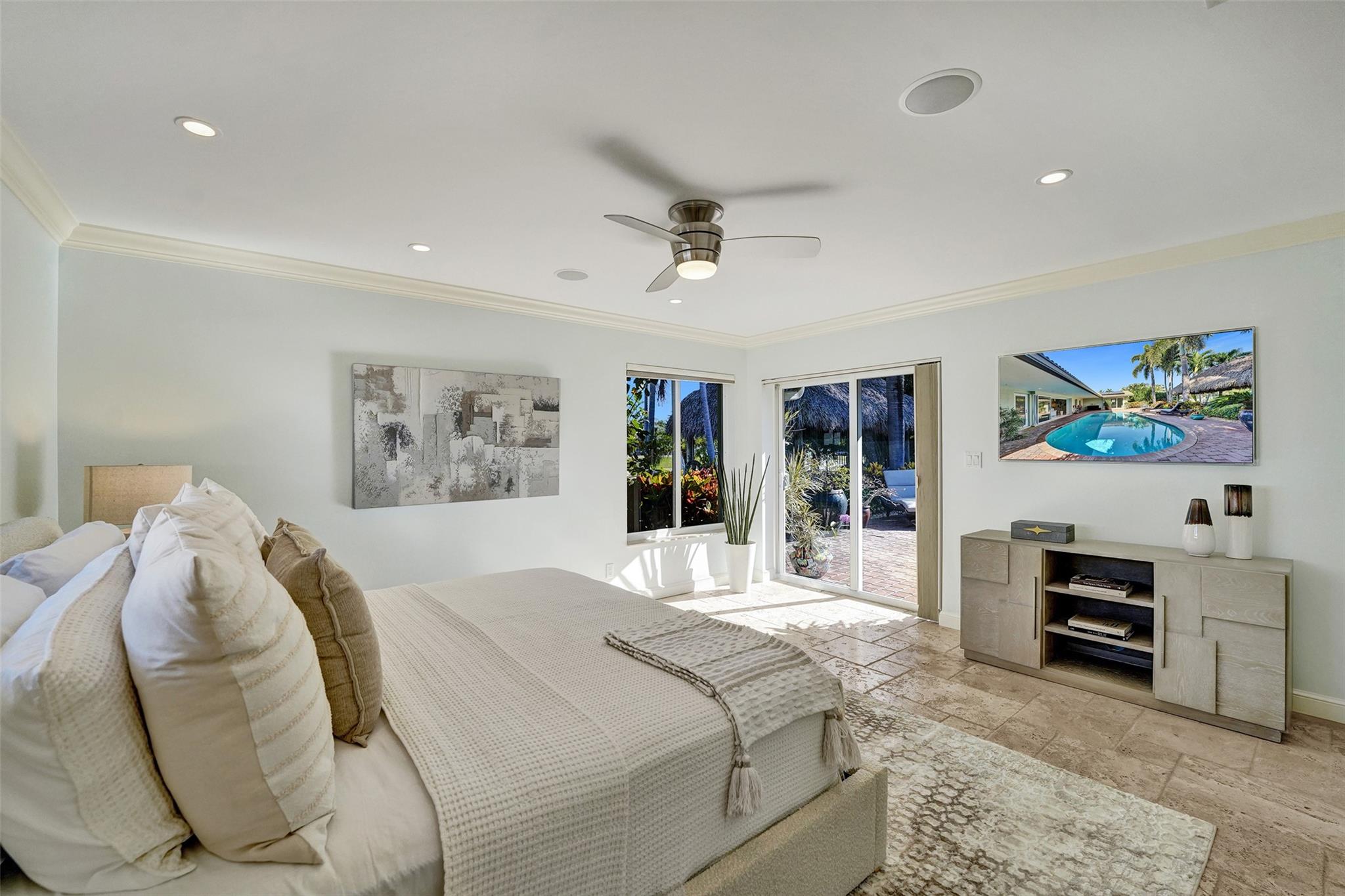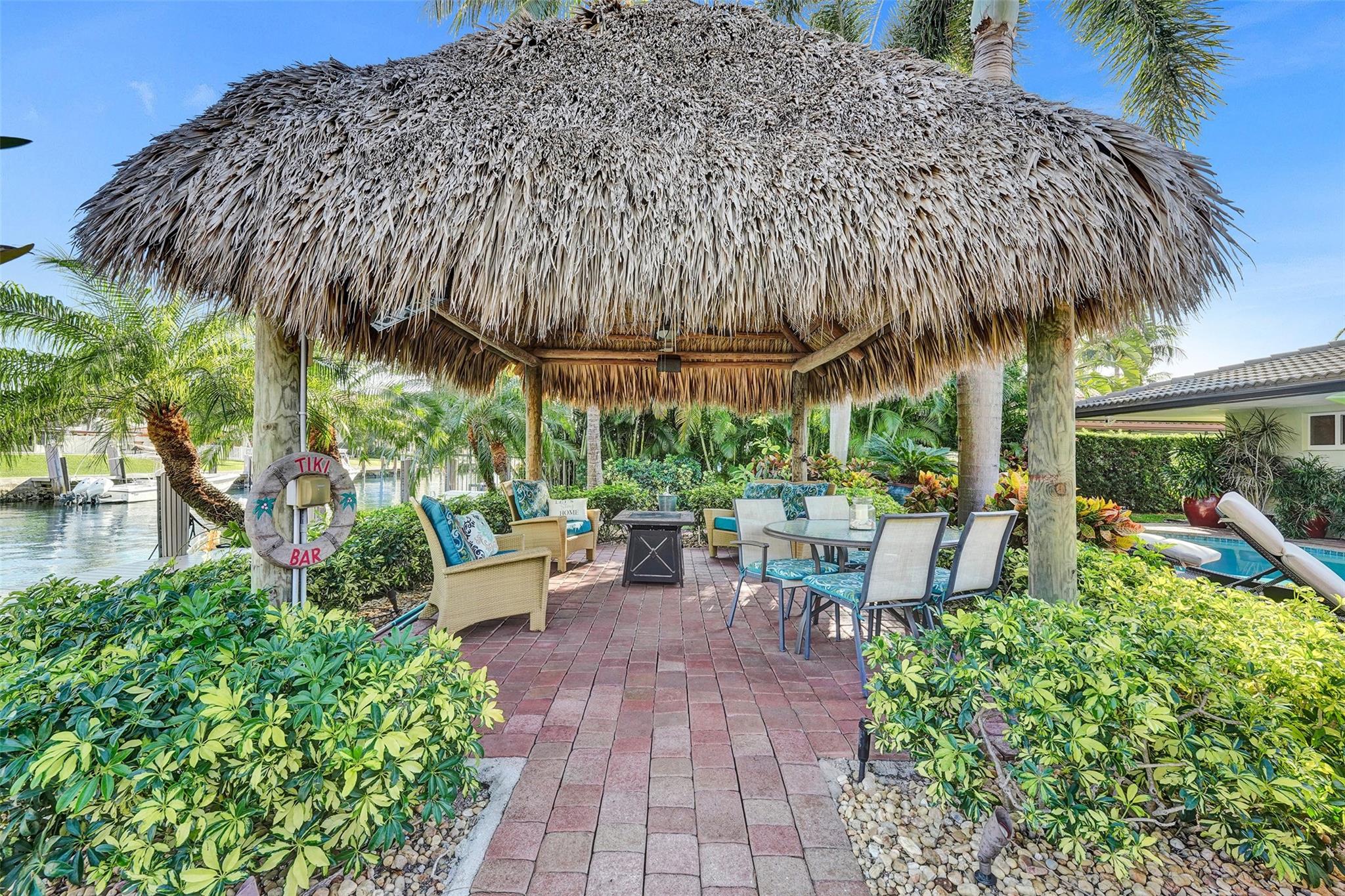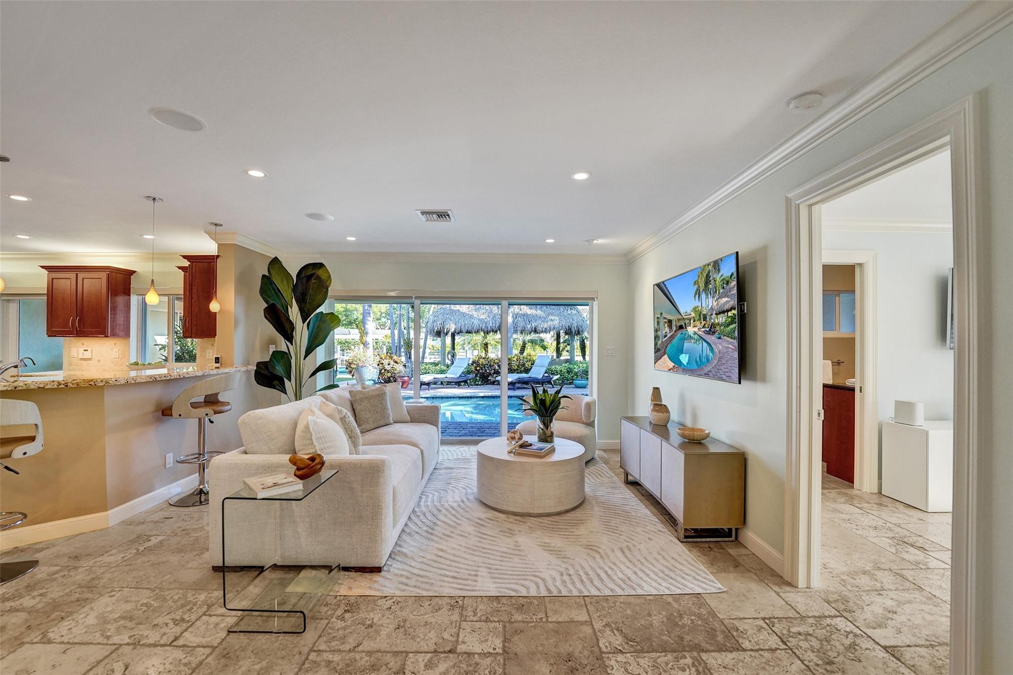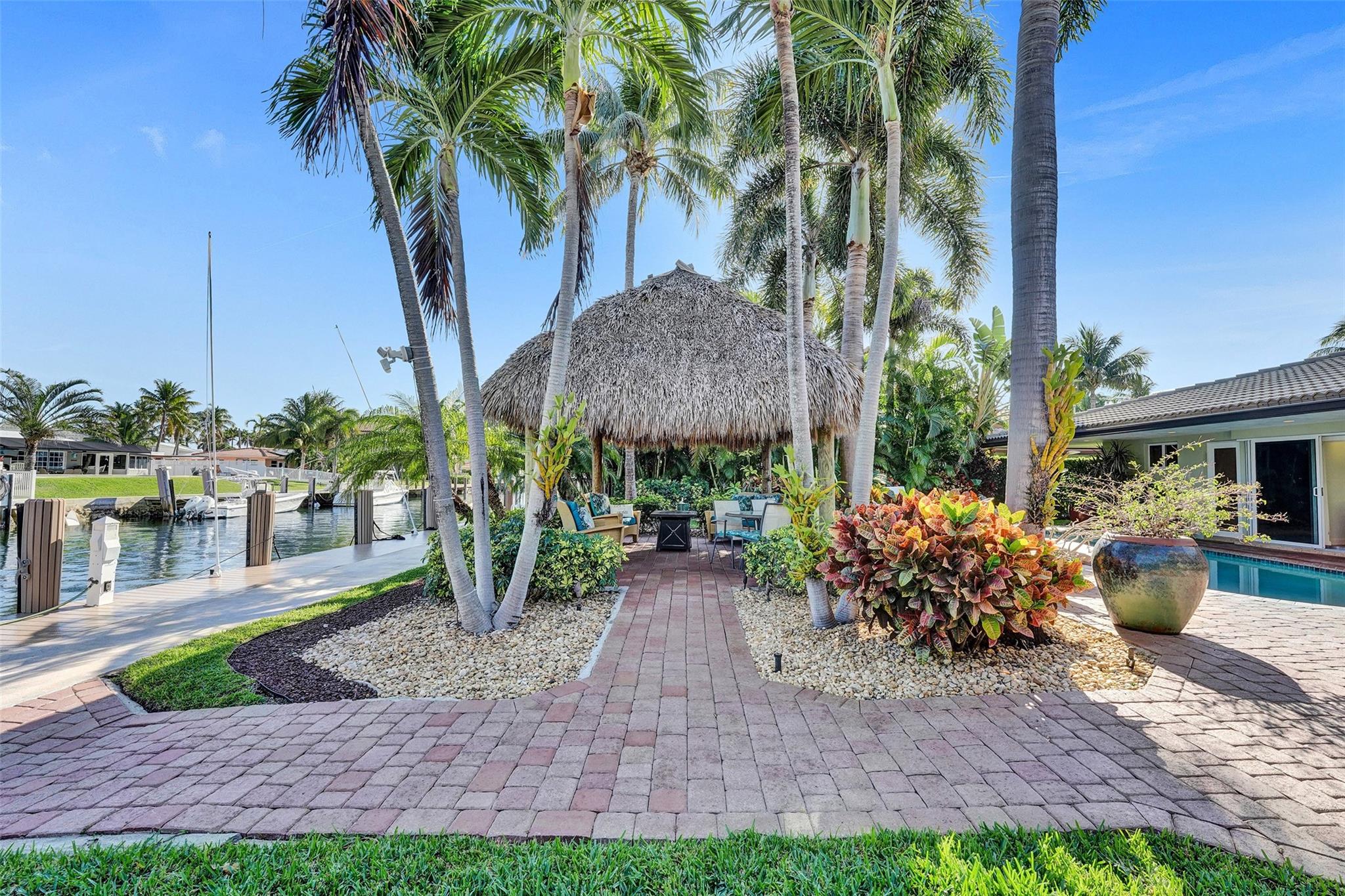 This stunning 2-bed 2-bath w/ office, fully rebuilt in 2008, home on a cul-de-sac offers 80 ft of waterfront & 60 ft of dock, no fixed bridges, & direct access to Intracoastal & ocean—just 6 houses in from the Intracoastal & minutes to the Hillsboro Inlet! Nestled on a spacious 9,600 sq ft lot, this home features a heated pool, an outdoor shower, & a tiki hut—perfect for evening entertaining. Enjoy the added benefits of solar panels & peace of mind w/hurricane impact windows & doors. The property includes a 2-car garage, w/plenty of storage & parking. Boating enthusiasts will appreciate the updated seawall/dock with view of the lighthouse! Income producing dock. A split floor plan provides privacy, & the kitchen boasts Bosch appliances w/ a gas range. Natural Travertine Floors thru out.