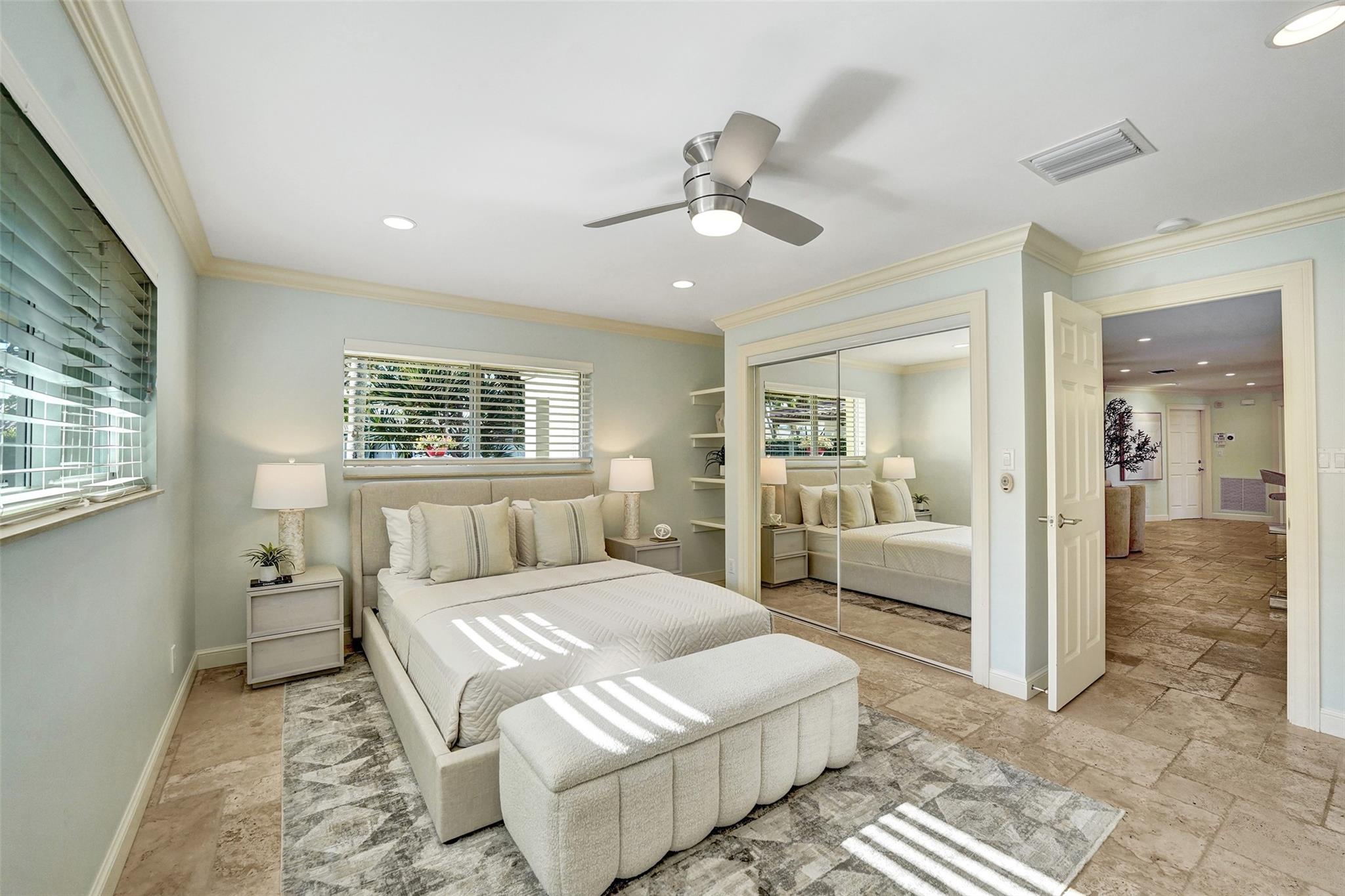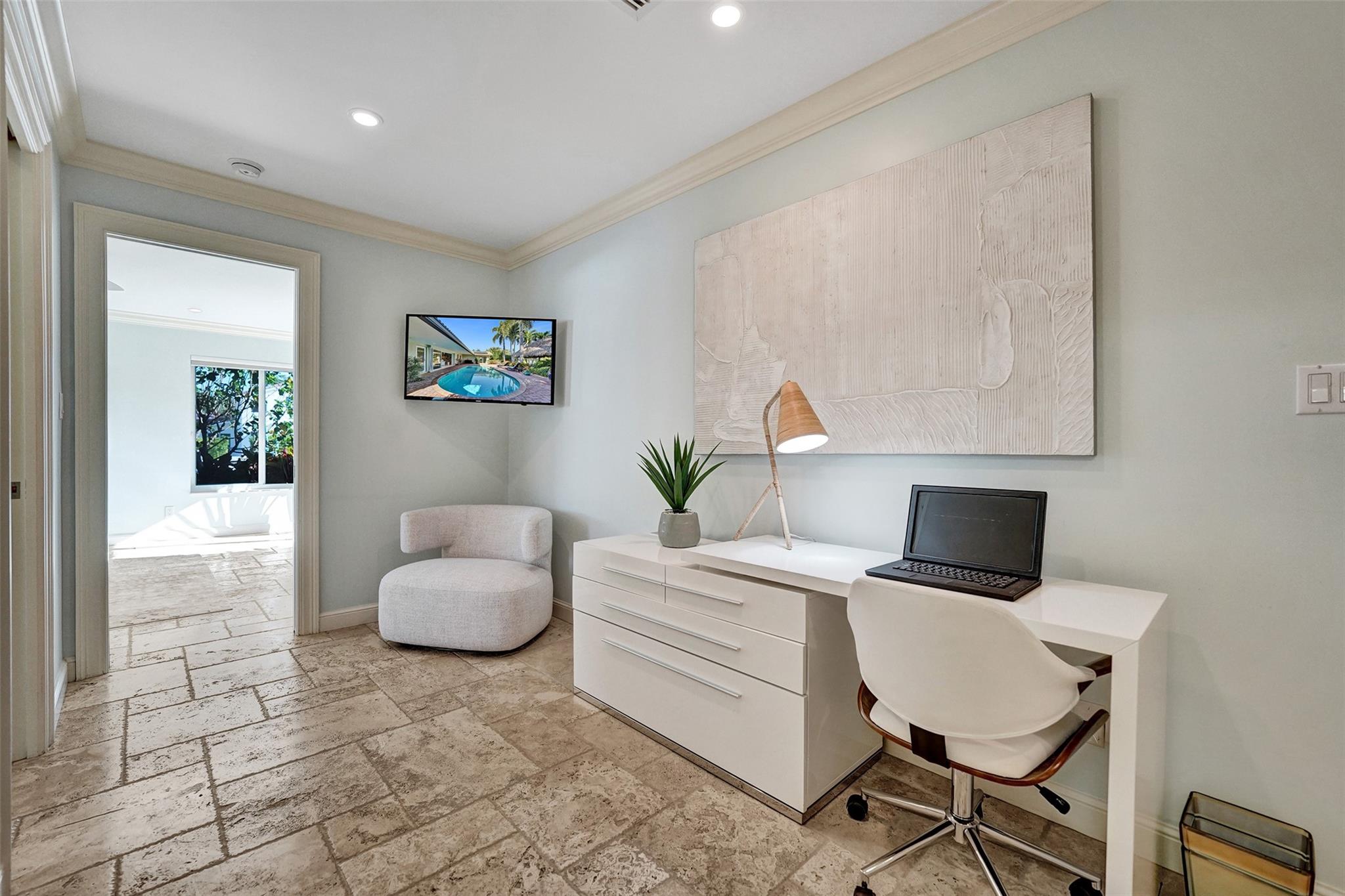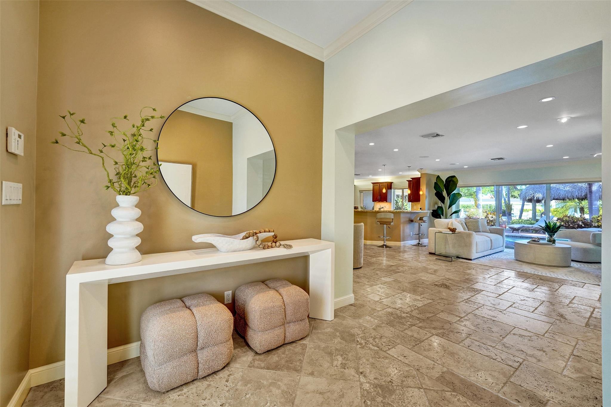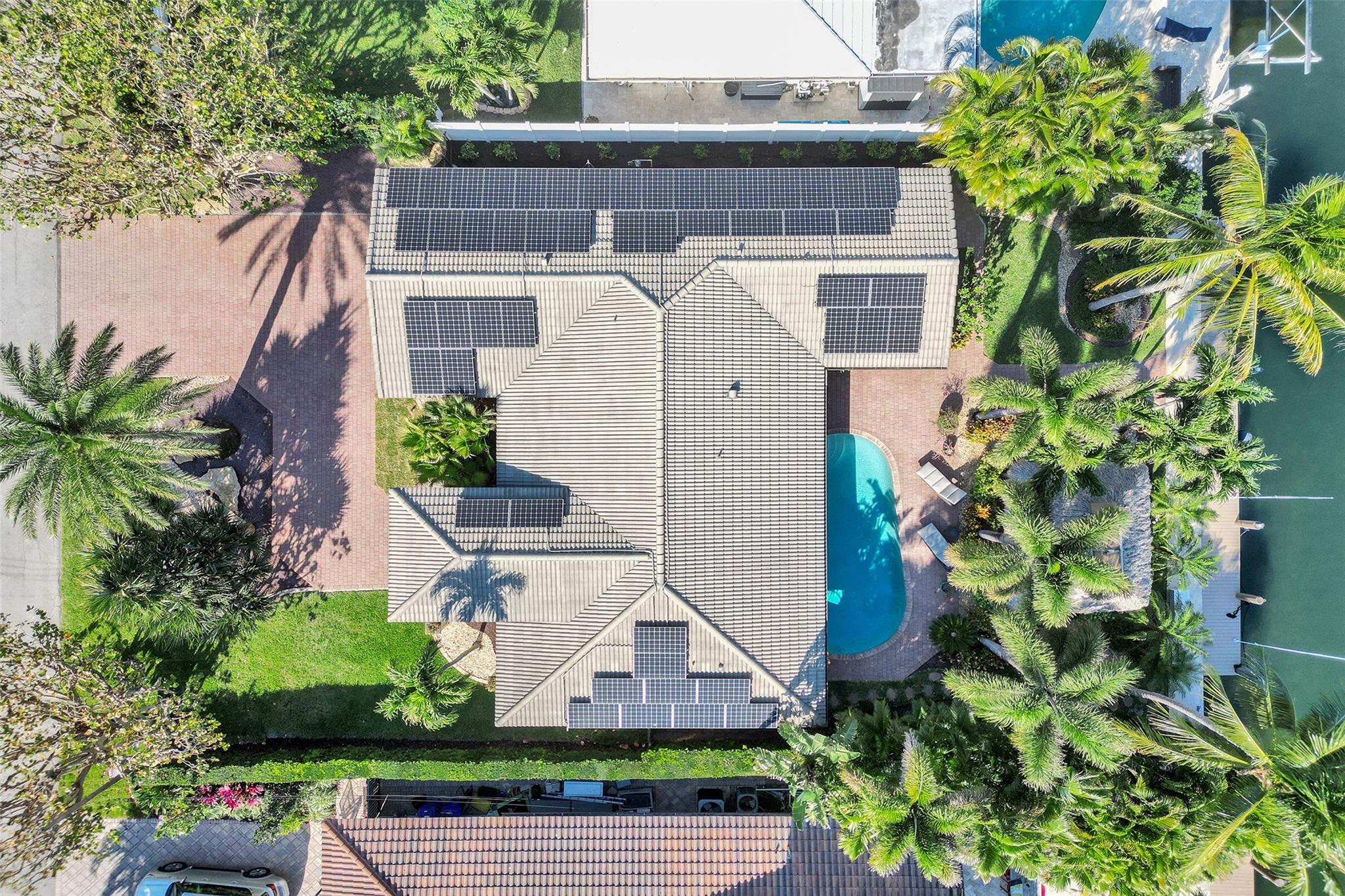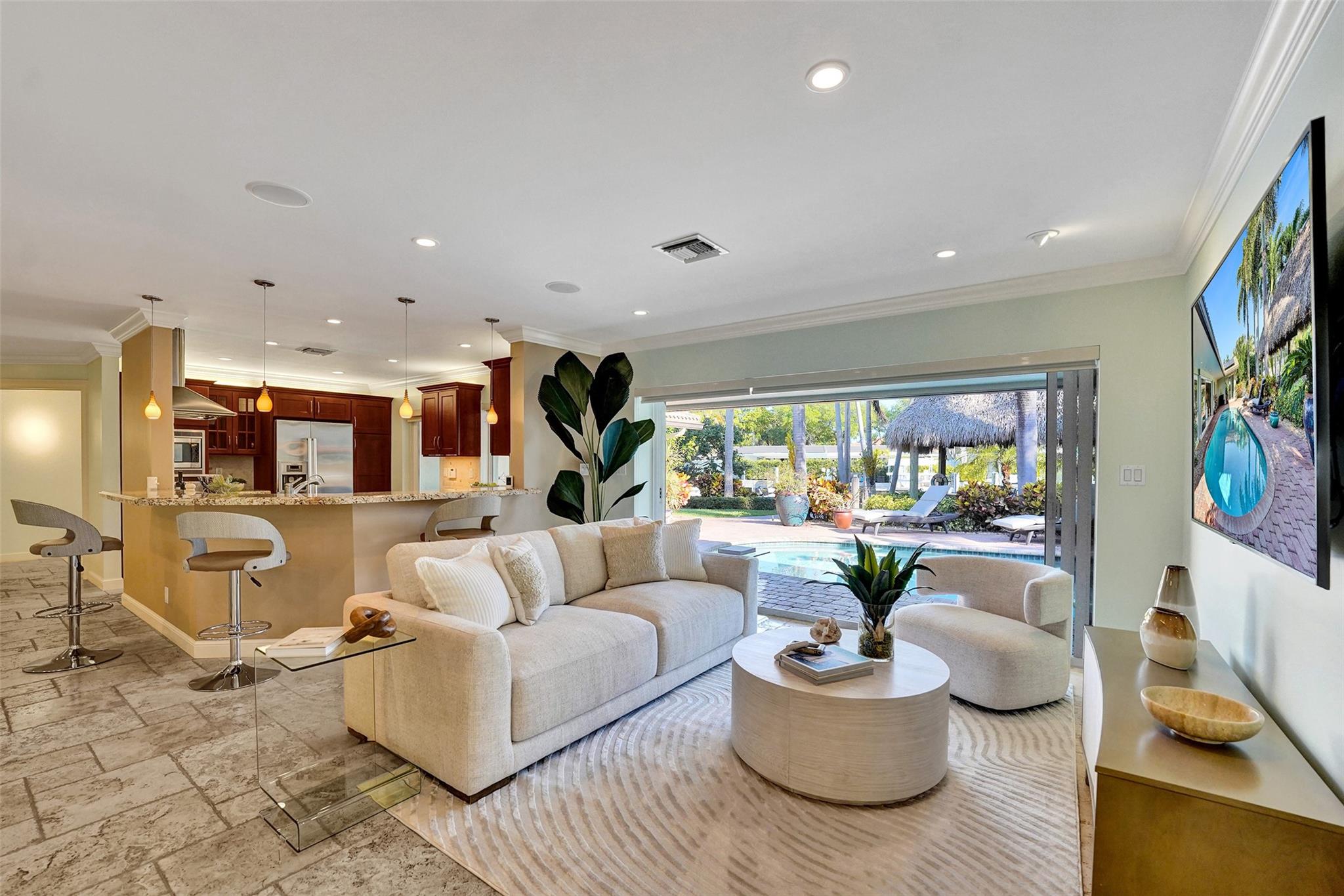 This stunning 2-bed 2-bath w/ office, fully rebuilt in 2008, home on a cul-de-sac offers 80 ft of waterfront & 60 ft of dock, no fixed bridges, & direct access to Intracoastal & ocean—just 6 houses in from the Intracoastal & minutes to the Hillsboro Inlet! Nestled on a spacious 9,600 sq ft lot, this home features a heated pool, an outdoor shower, & a tiki hut—perfect for evening entertaining. Enjoy the added benefits of solar panels & peace of mind w/hurricane impact windows & doors. The property includes a 2-car garage, w/plenty of storage & parking. Boating enthusiasts will appreciate the updated seawall/dock with view of the lighthouse! Income producing dock. A split floor plan provides privacy, & the kitchen boasts Bosch appliances w/ a gas range. Natural Travertine Floors thru out.
