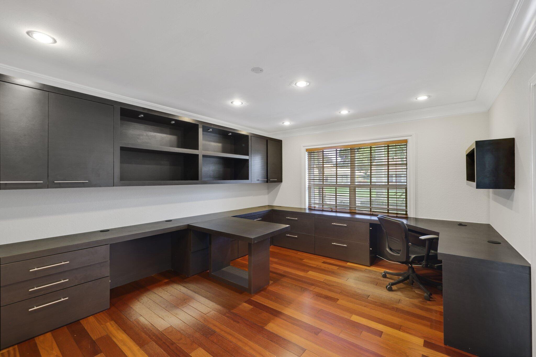 Remarkable park and lake frontage AND convenient location in Central Boca Raton. This four-bedroom, three-and-a-half-bathroom residence is situated on one-third of an acre, with open views of a spacious park and lake. Upon entering the great room, you are welcomed by a vaulted wood ceiling and an inviting fireplace, with stunning views of the backyard visible through the double sliding doors. The kitchen features an island, a breakfast area, and convenient access to both the dining room and the outdoor patio and pool. The four bedrooms are arranged along a single corridor. The large Primary Bedroom has exterior doors leading to the backyard, two spacious walk-in closets, and an oversized soaking tub. The second and third bedrooms are equipped with walk-in closets that include built-in