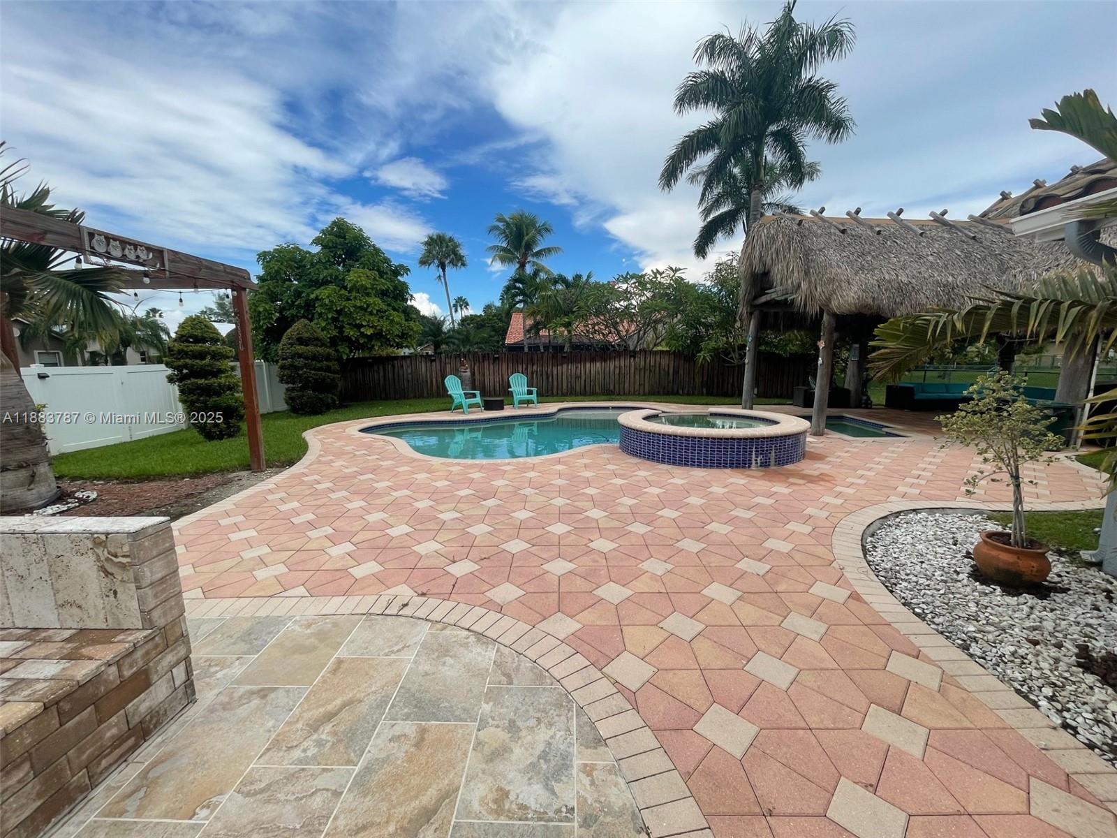 Beautifully maintained 4br/2.5 bth split floor plan on a very large and desirable corner lot. Home features huge front and back yard with a pool, tiki hut and fire pit area. Large tile through, open and remodeled kitchen with quartz counter tops, remodeled bathrooms, recently purchased appliances and washer and dryer in a separated room, vaulted ceilings and customs cabinetry. Great location to raise a family with excellent schools and easy highway access. 5 minutes away from Sawgrass Mills and plenty of restaurants in the area.