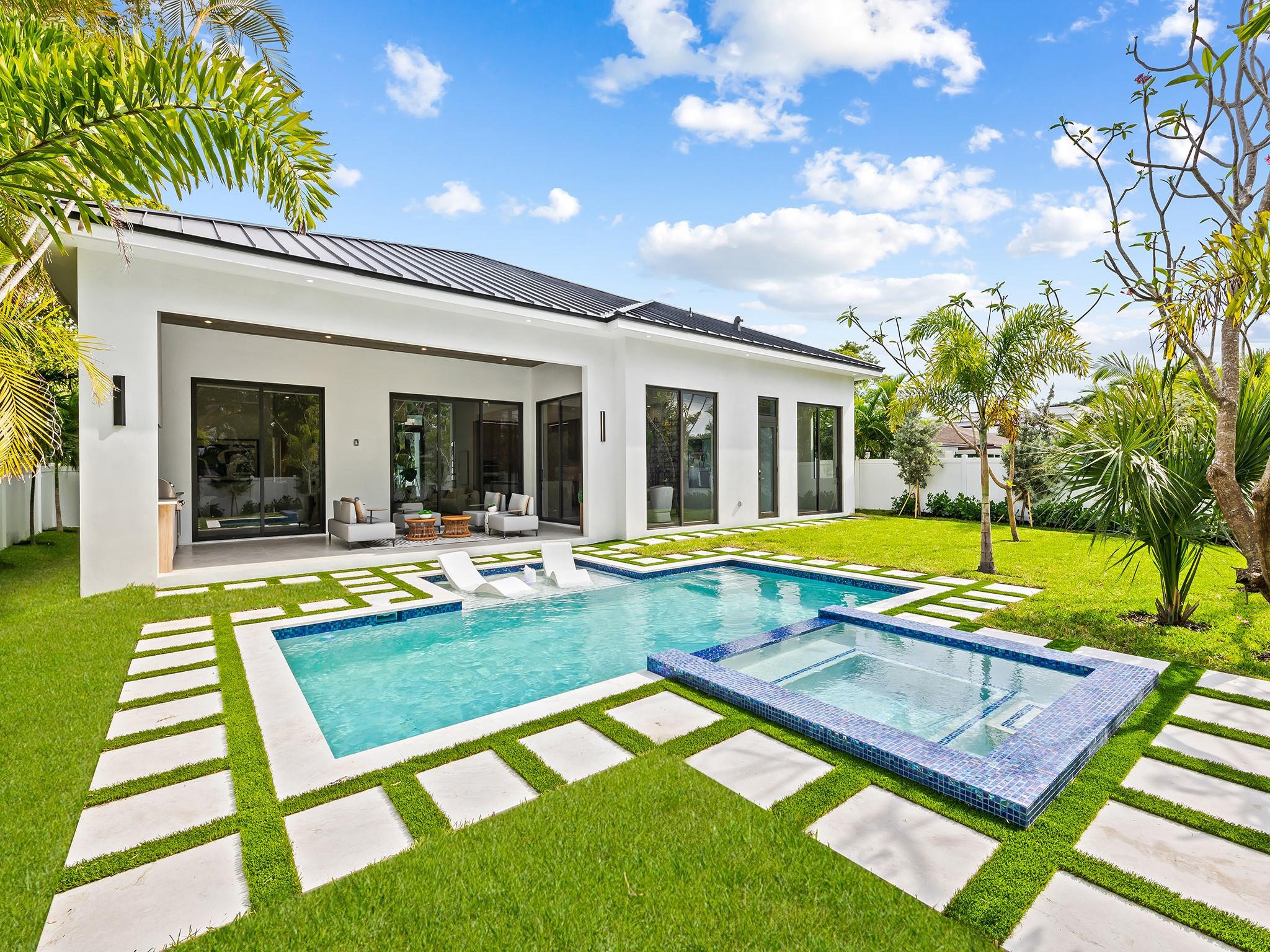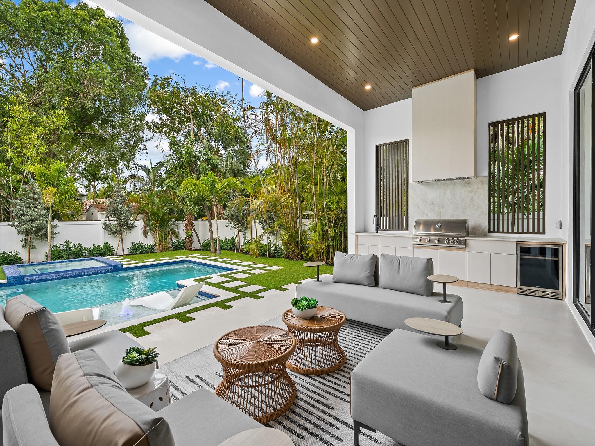 NEW CONSTRUCTION BY MSK HOMES | Designed by SILVANA BORGES | The Pinnacle of Poinsettia Heights | Coveted Street | 10,000+ Sq ft Lot | 1 story, Soaring 13'-16’ ceilings thru out | 4,042 total sq ft. Luminous open concept & high end finishes. Culinary kitchen with 12'+ center island, premium appliances & hidden walk-in pantry. The primary suite offers a large custom WIC w/ glass island & spa inspired bathrm outfitted with Kohler Anthem fixtures. 10' glass walls open to a covered lanai & summer kitchen with marine-grade cabinetry facing the pool, spa & waterfall framed in tropical landscaping. LED tray ceilings, Italian porcelain flooring, integrated speaker system, smart home features & elevated garage door for car lifts. Delivery April 2026. Customization available. Sq ft per Architect.
