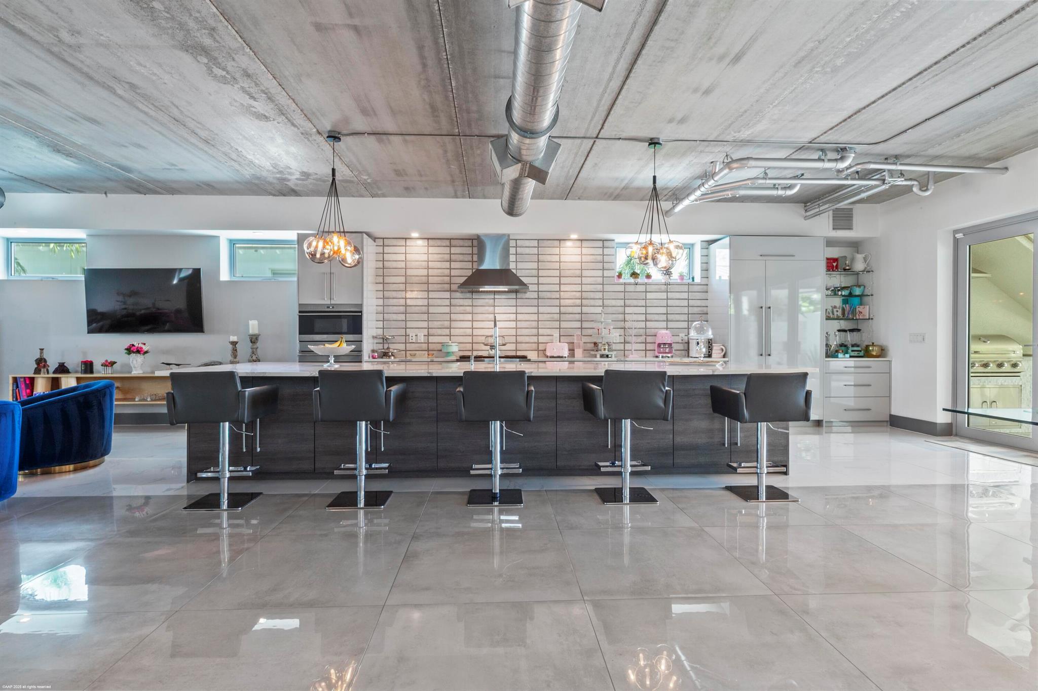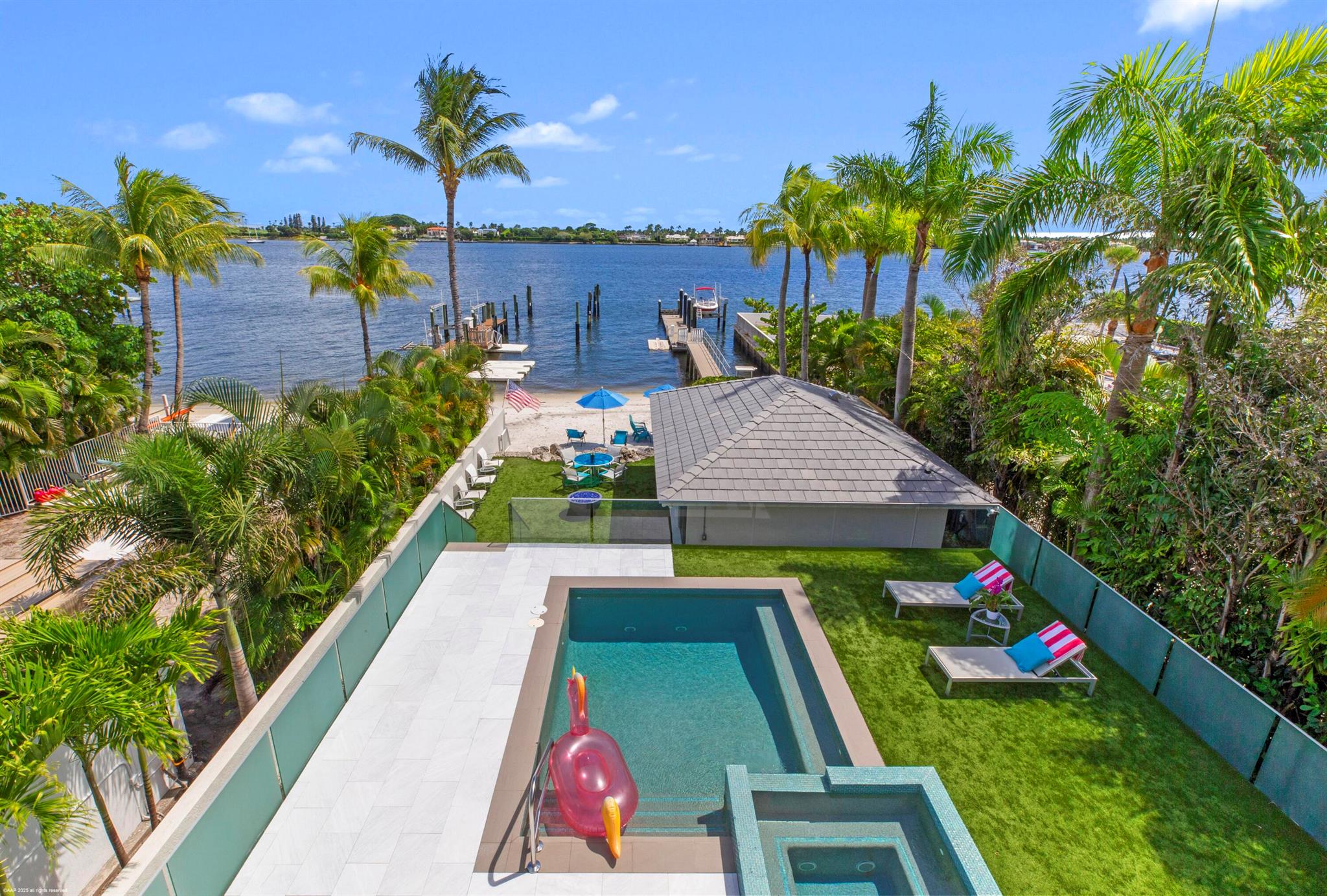 This stunning new direct Intracoastal Oasis was inspired by the incredibly talented minimalist architect Ludwig Mies who was the pioneer of modern architecture. The home's main level has the gourmet kitchen, the living, family and dining rooms all in one open space boasting beautiful views of the wide Intracoastal waterway and Palm Beach. Take the elevator to the third floor where the primary suite has a large deck overlooking the resort style back yard/pool/spa and beachfront. This third level has two additional bedrooms with en-suite baths and great closets. The VIP bedroom and club room are located on the ground floor and live like a separate home. Down at the beach sits a lovely private cabana giving guests the best seat in the house! Behind the entry gates, the air conditioned garage
