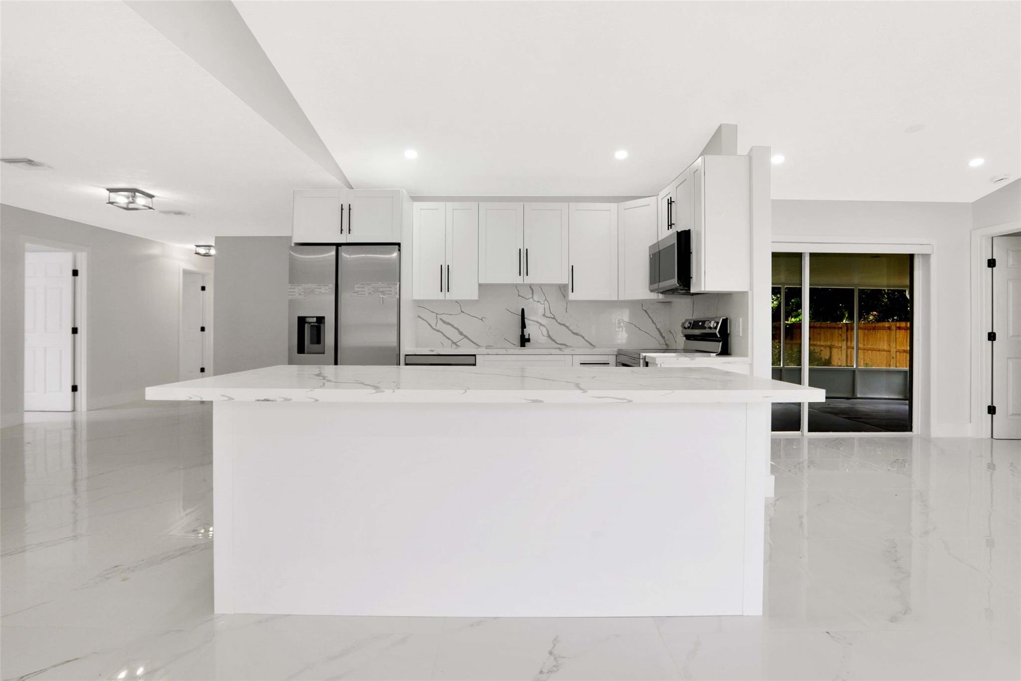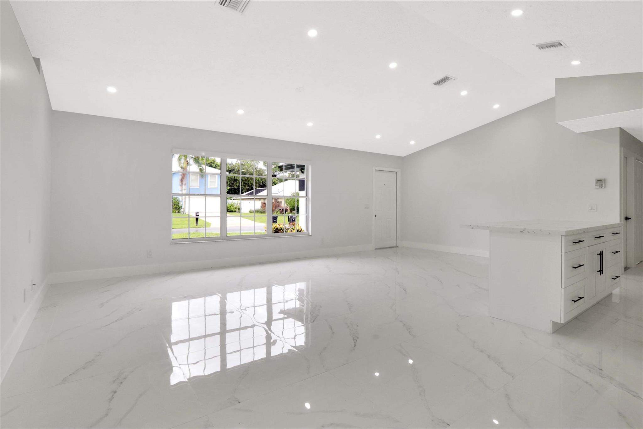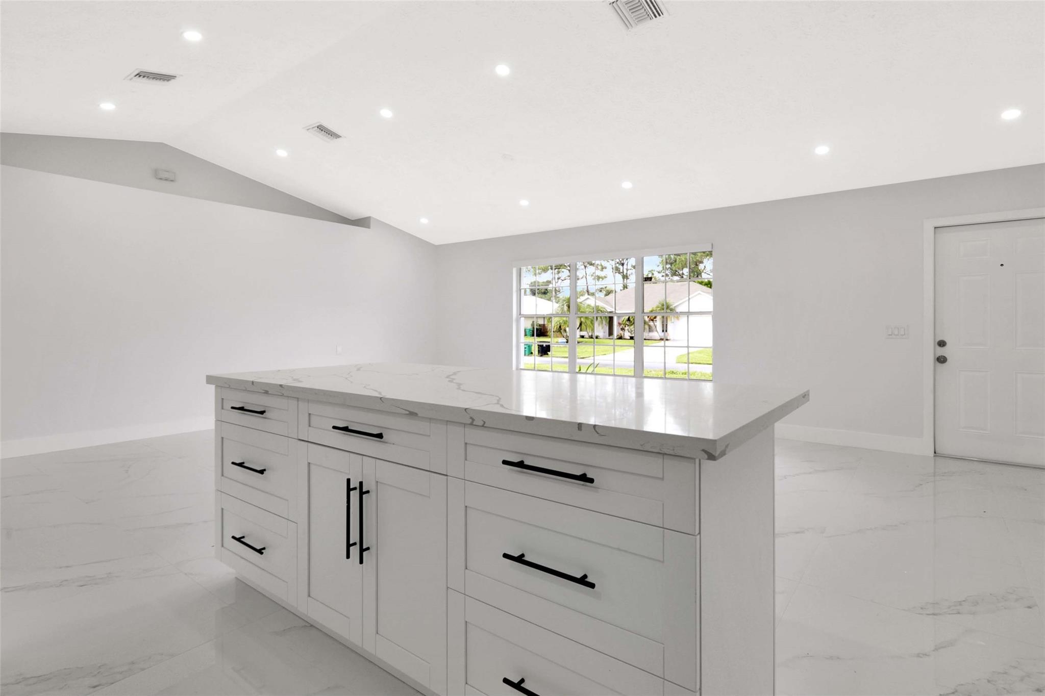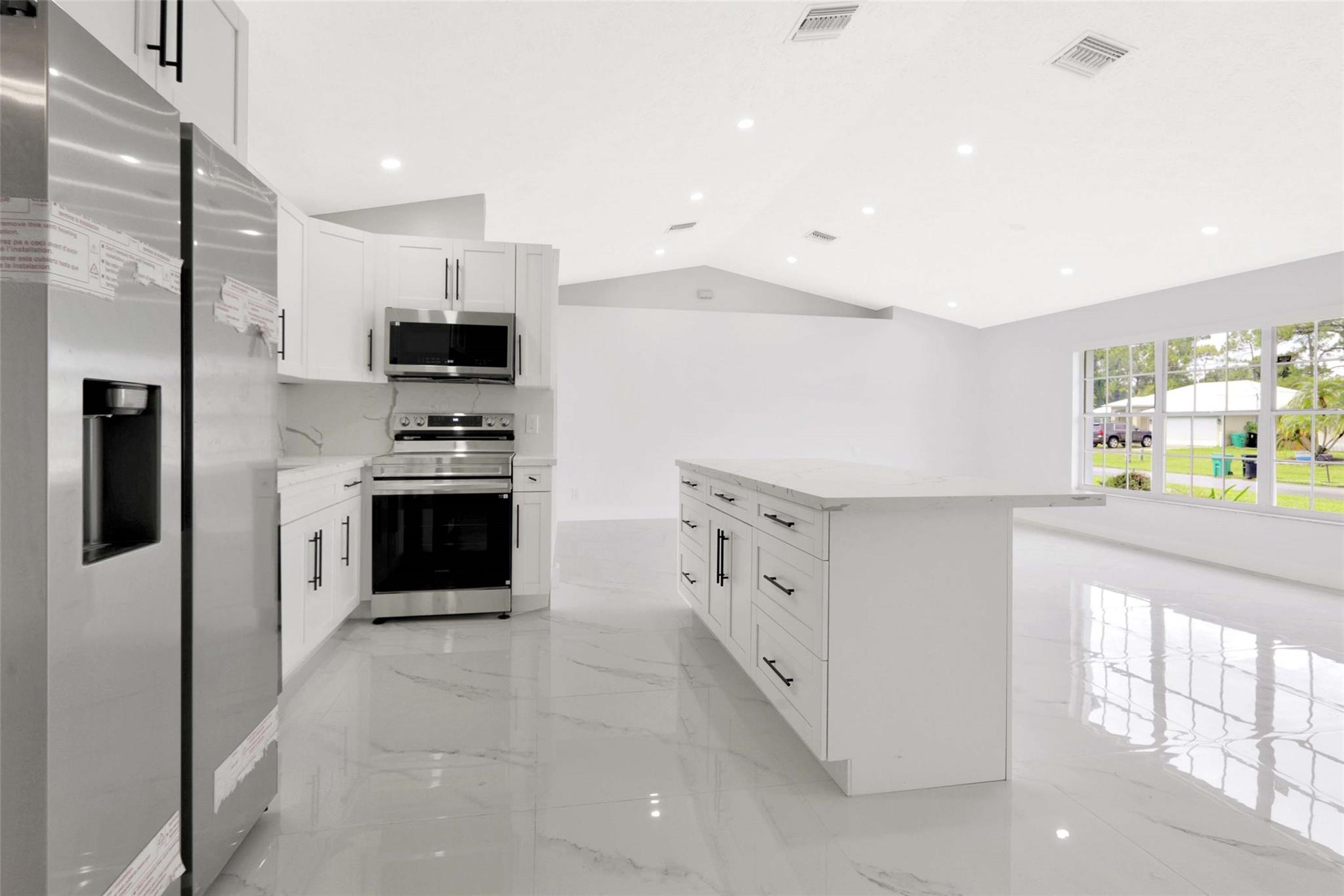 No HOA! unique styled non-cookie-cutter home! Step into modern Florida living with this beautifully renovated 3BR/2BA Port Saint Lucie home featuring a split-bedroom layout and 2-car garage. Recent upgrades include a new roof (2024) and central A/C (2025). The kitchen boasts 36" shaker cabinets, Calacatta quartz countertops with full backsplash, and stainless-steel appliances (2025). Sleek 32x32 porcelain tile runs throughout, with both bathrooms fully updated in 24x48 porcelain tile and contemporary finishes. Added features: LED recessed lighting, zebra blinds, matte black fixtures, and fresh interior/exterior paint (2025). Move-in ready, turnkey, and ideally located near shopping, dining, schools, and highways. Easy to show via Showing Time or LA.
