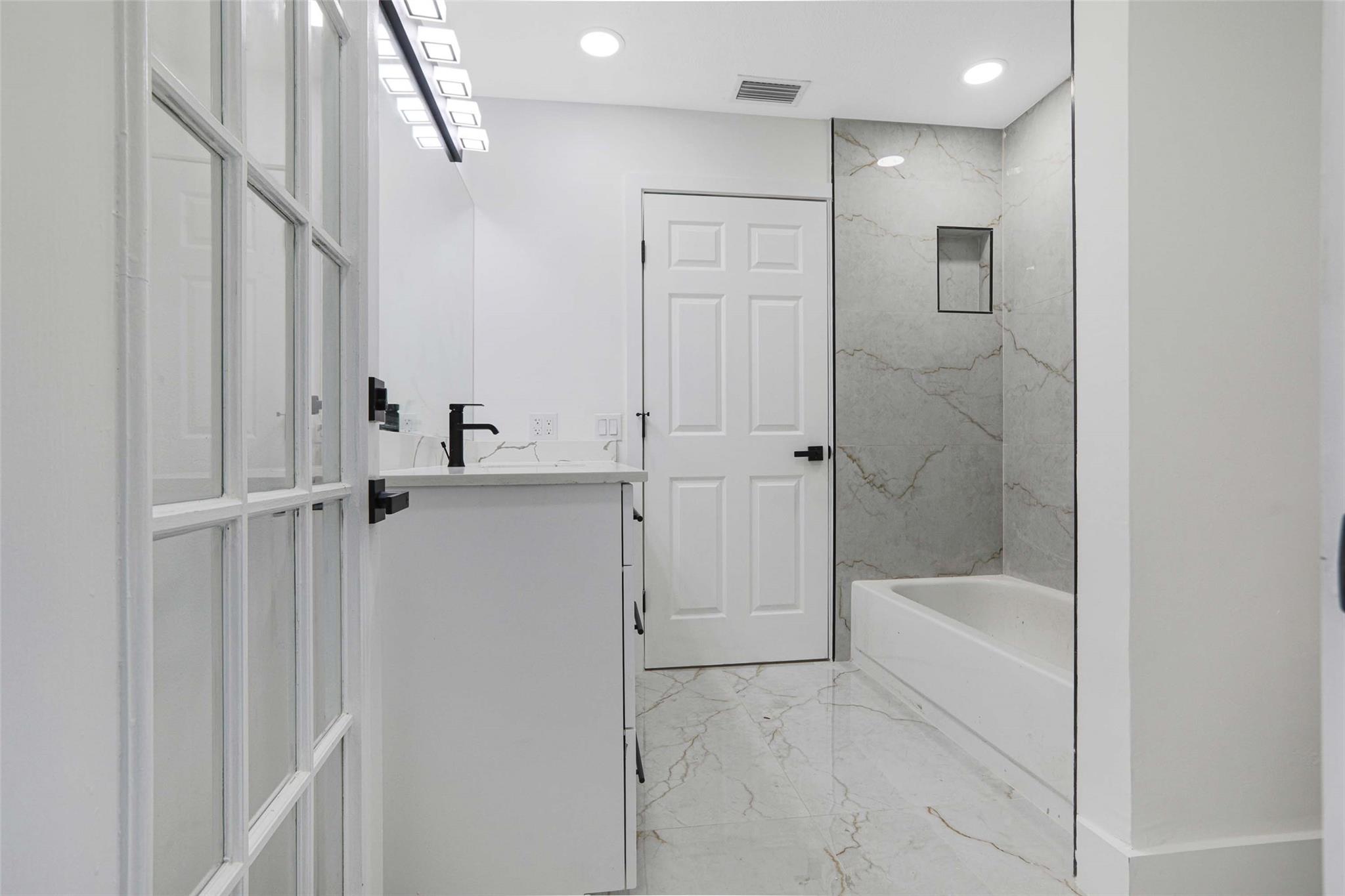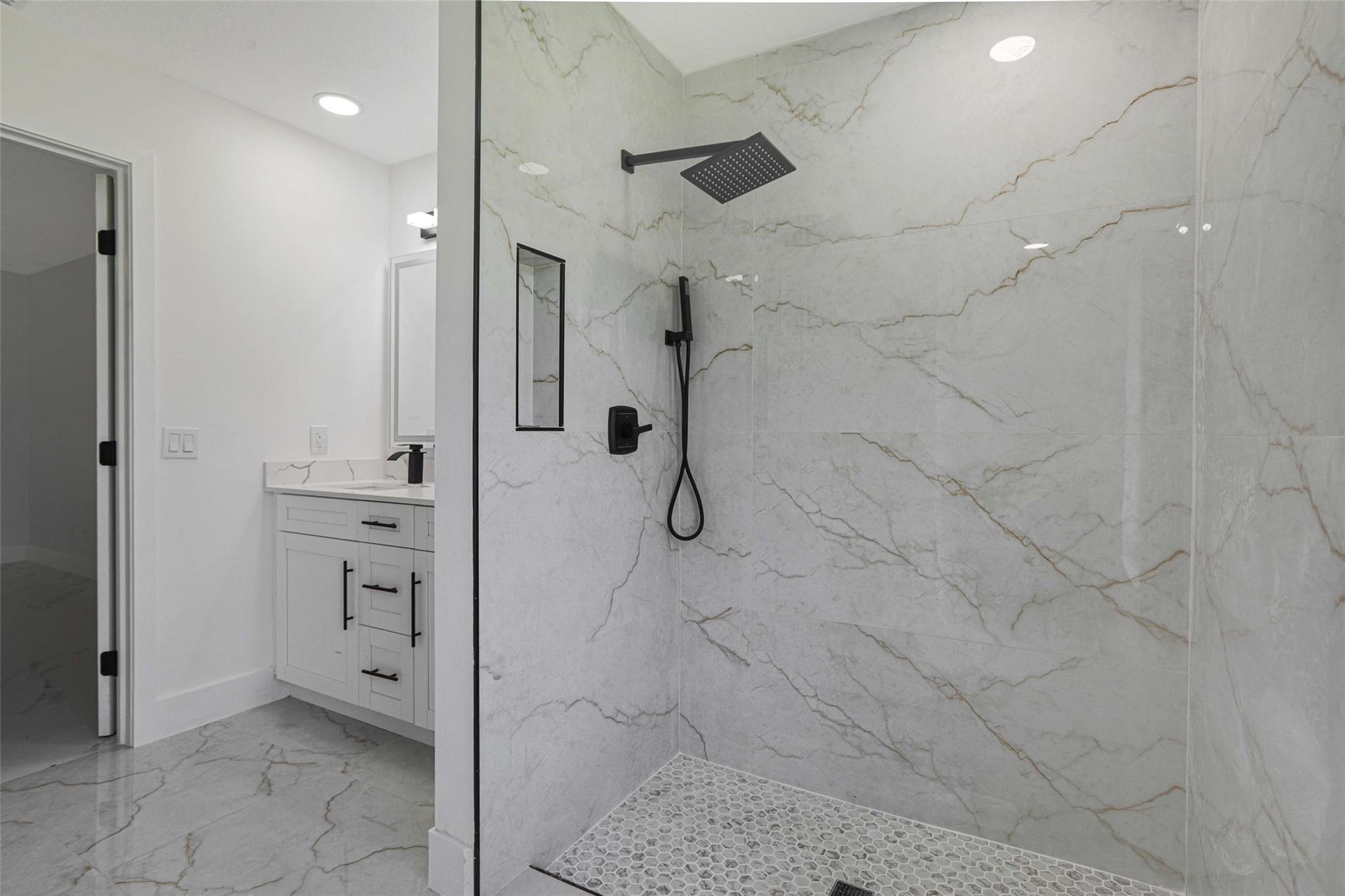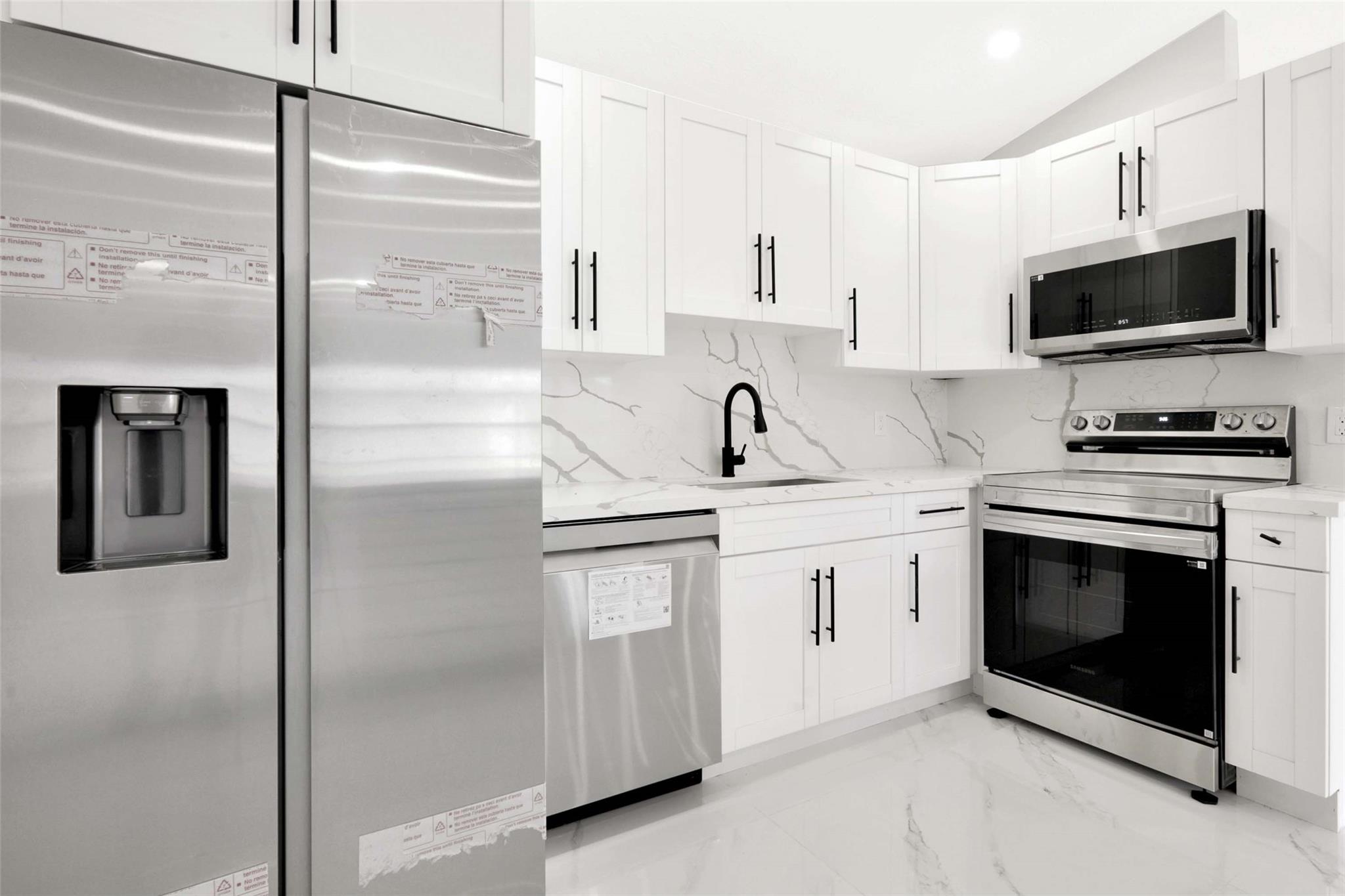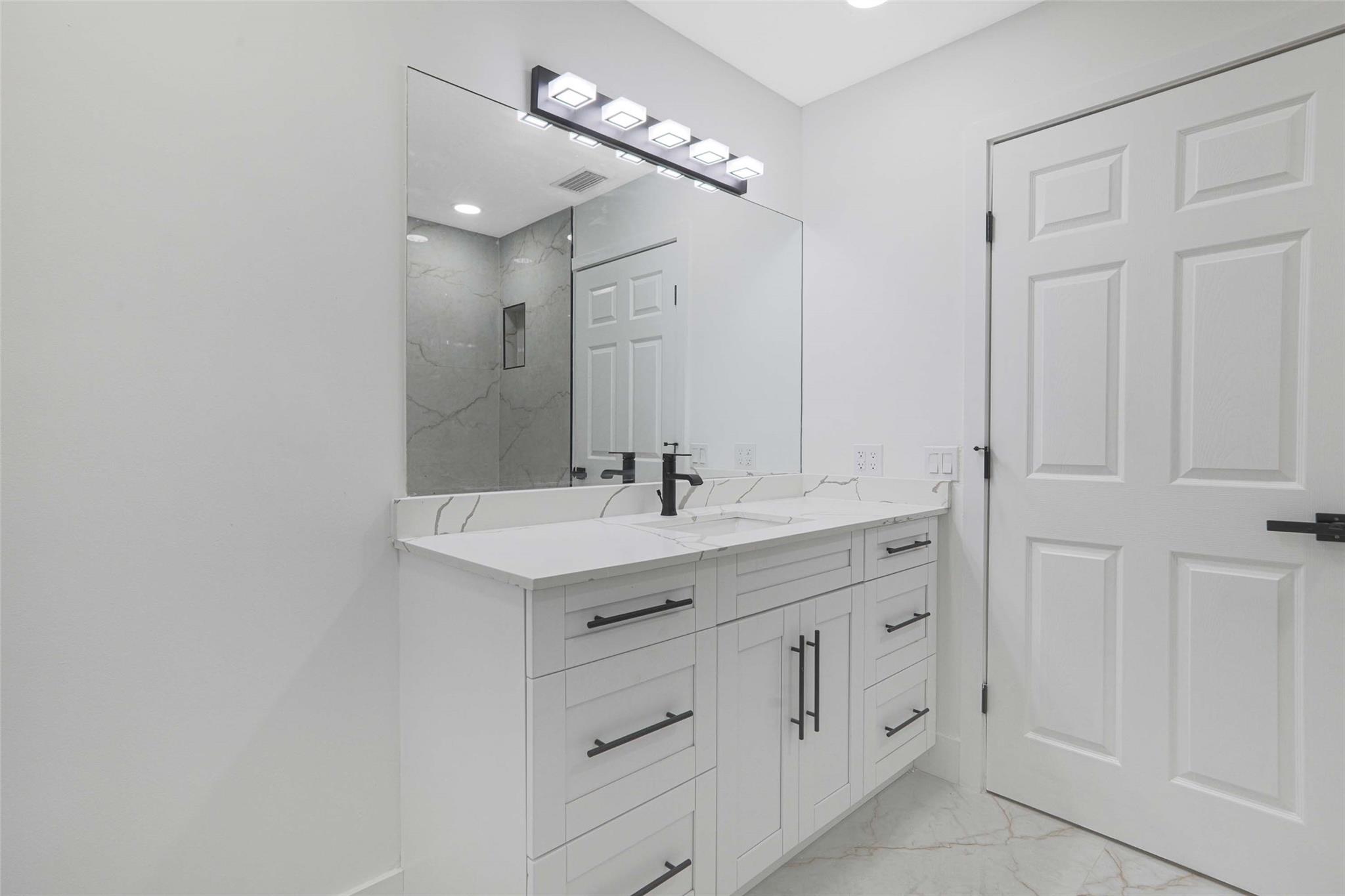 No HOA! unique styled non-cookie-cutter home! Step into modern Florida living with this beautifully renovated 3BR/2BA Port Saint Lucie home featuring a split-bedroom layout and 2-car garage. Recent upgrades include a new roof (2024) and central A/C (2025). The kitchen boasts 36" shaker cabinets, Calacatta quartz countertops with full backsplash, and stainless-steel appliances (2025). Sleek 32x32 porcelain tile runs throughout, with both bathrooms fully updated in 24x48 porcelain tile and contemporary finishes. Added features: LED recessed lighting, zebra blinds, matte black fixtures, and fresh interior/exterior paint (2025). Move-in ready, turnkey, and ideally located near shopping, dining, schools, and highways. Easy to show via Showing Time or LA.