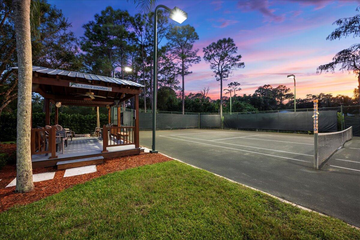Private Tennis Court! Is tennis your dream? Then this is your dream come true--the ball is in your court! Set at the end of a quiet, paved cul-de-sac is a beautifully landscaped 1.04 acre lot with landscape lighting and a cobblestone driveway. This distinctive 3-bedroom plus den, 3-bath residence is a private paradise for tennis lovers and outdoor enthusiasts. Play every day on your private, regulation-size, Har-Tru (clay) tennis court with eight professional 1,000-watt metal-halide lights (newer ballasts and bulbs) for evening matches and a 10-foot fence on 3 sides for optimal play. An automatic above-ground sprinkler, fed by well water, keeps the court in peak condition. Between sets, relax in the stunning 10' x 20' cedar gazebo with Trex flooring, ceiling fan, power, lighting