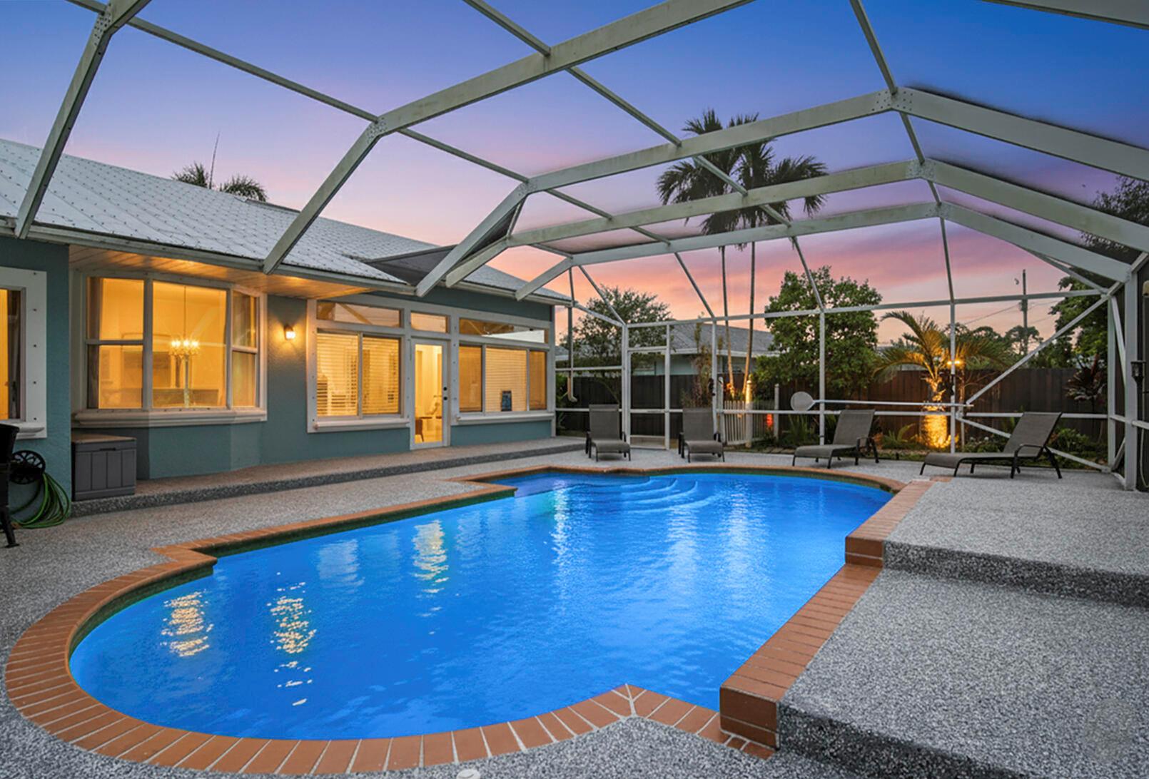 Welcome to your tropical retreat in Port St. Lucie -- a beautifully maintained CBS pool home that looks and feels like a model! This inviting 3-bedroom, 2-bath, 2-car garage residence offers 1,732 sq. ft. of living space plus a 200 sq. ft. enclosed four-season room, ideal for relaxing or entertaining year-round.Step inside to find a warm, open floor plan with tasteful updates and modern finishes throughout. The home features a 2022 metal roof and gutters, 2022 A/C system with UV light, and a hurricane-rated, Wi-Fi-enabled garage door. The kitchen shines with stainless steel appliances, quartz countertops, and stylish cabinetry--perfect for everyday living or hosting friends and family.Outdoors, discover your private tropical paradise: a screened pool with epoxy deck, tiki hut,