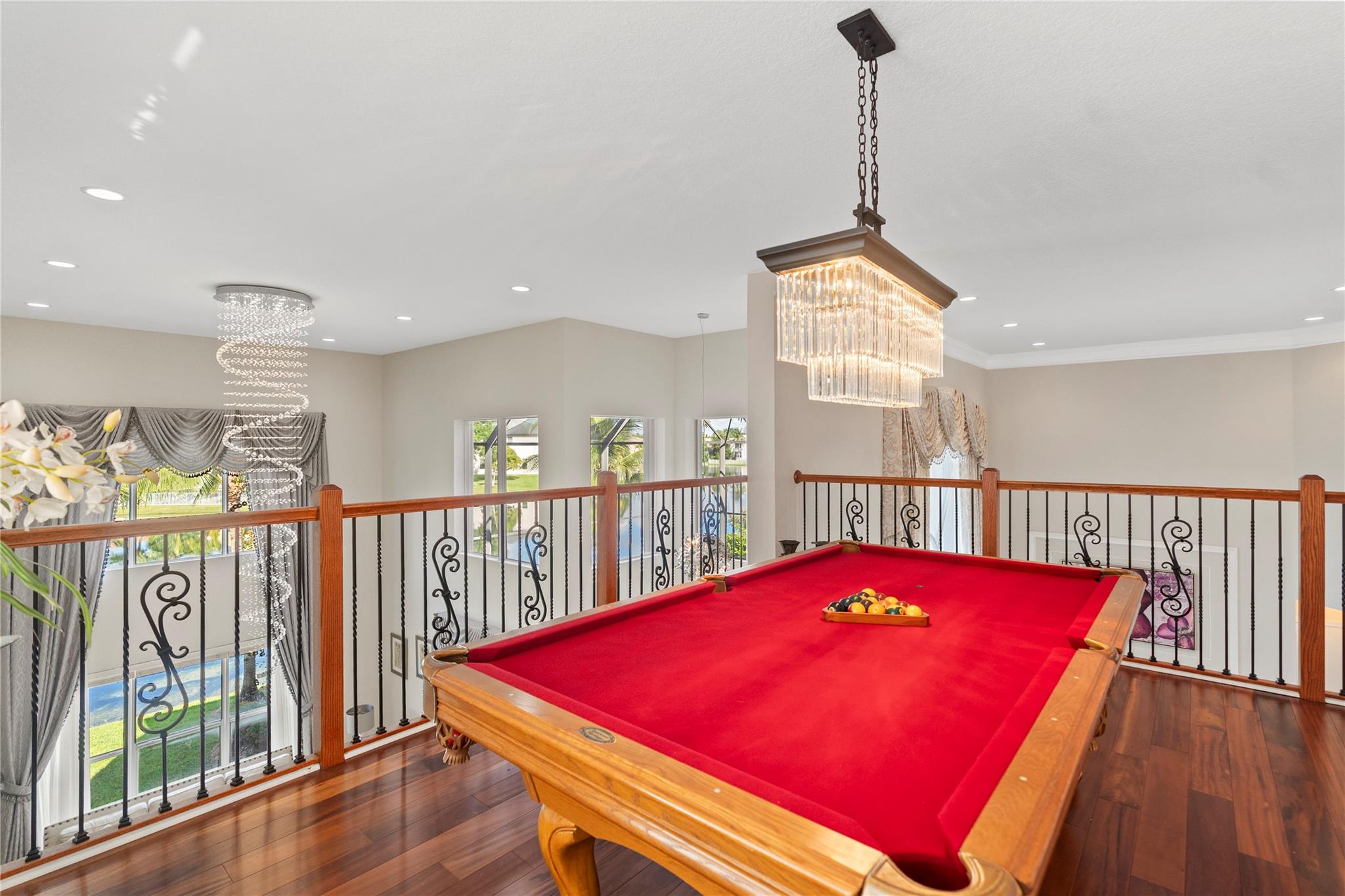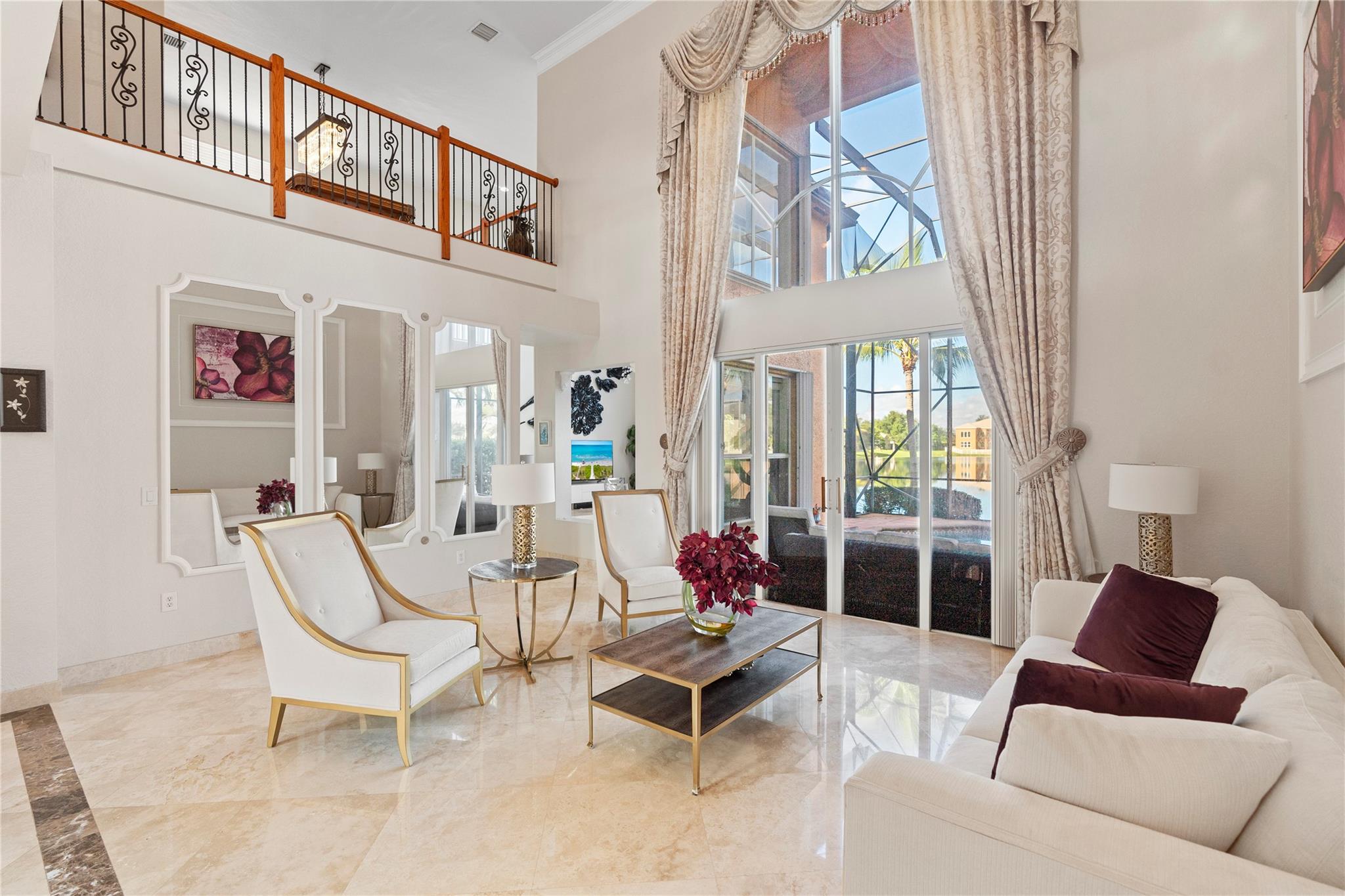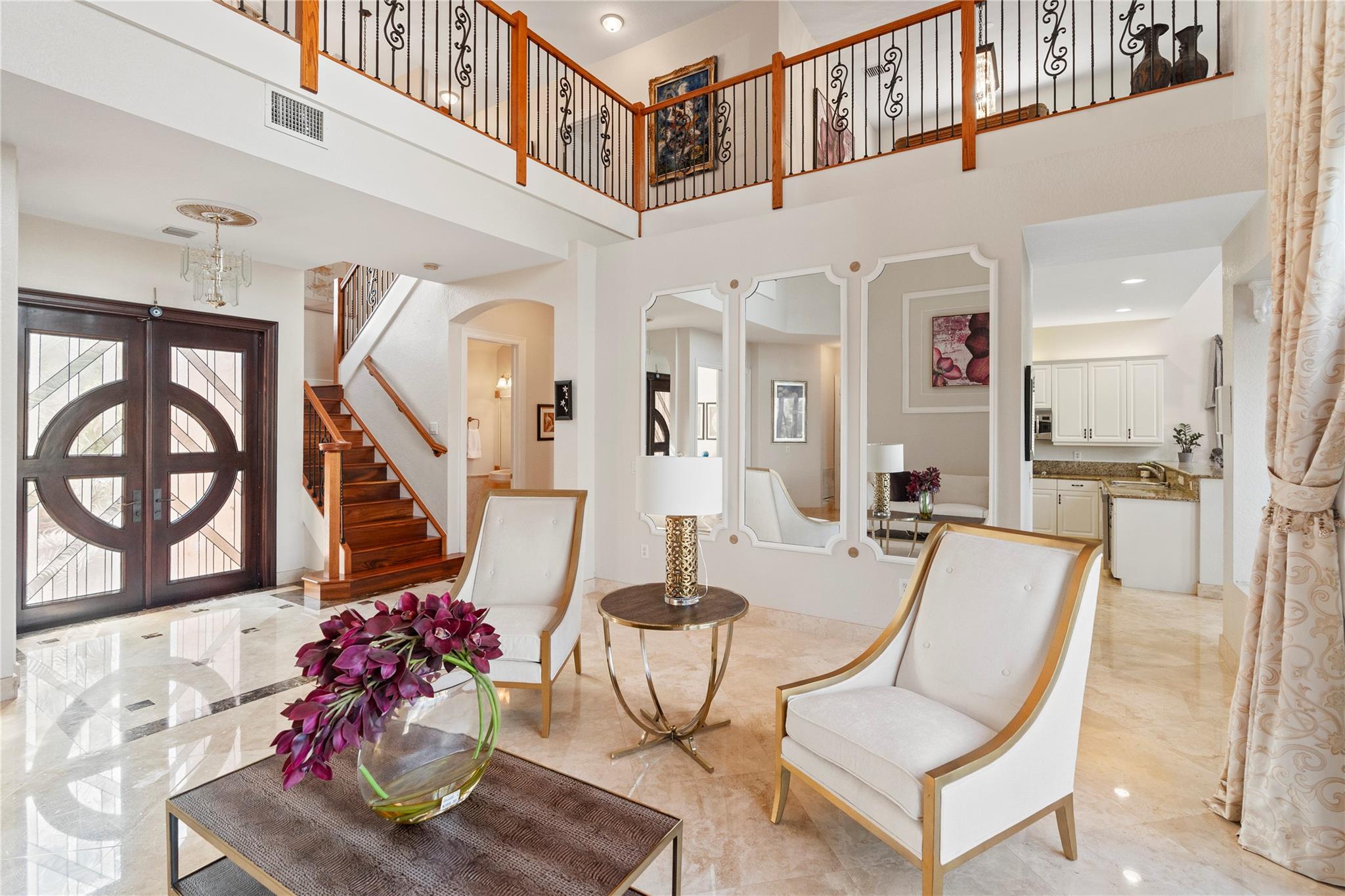 Elegant 4BR/office/big loft /3.5 BA home featuring marble floors on the main level, hardwood stairs & second floor, and a custom wrought-iron staircase. One bedroom downstairs with a private bathroom and office, spacious layout with gourmet kitchen, formal dining, and a luxurious primary suite. Enjoy outdoor living with a resort-style pool with jacuzzi, screened patio, and screened balcony. High ceilings, abundant natural light, and premium finishes throughout. Homeowners Association includes internet, alarm, cable and 5-star clubhouse