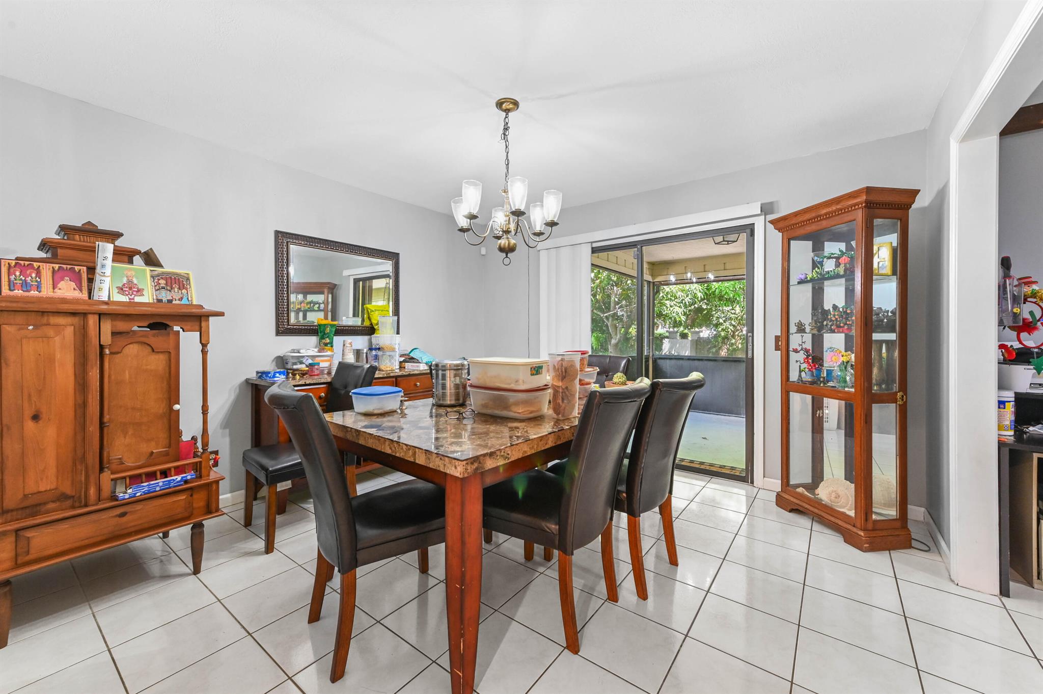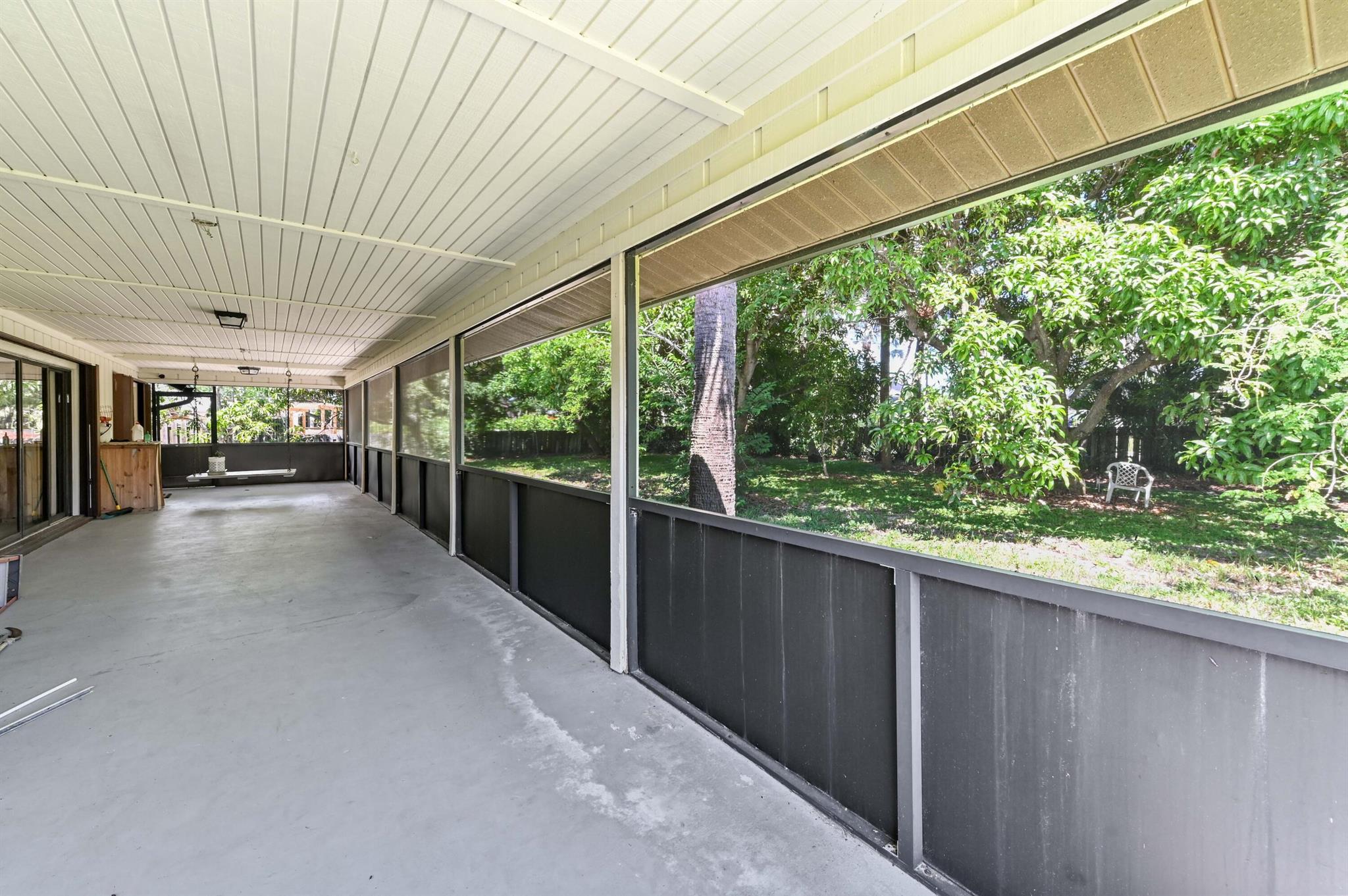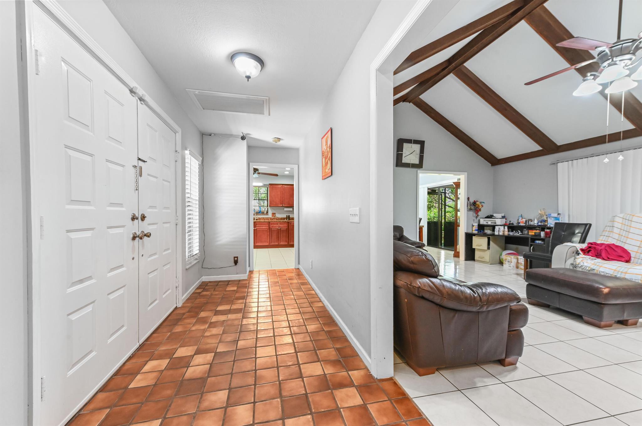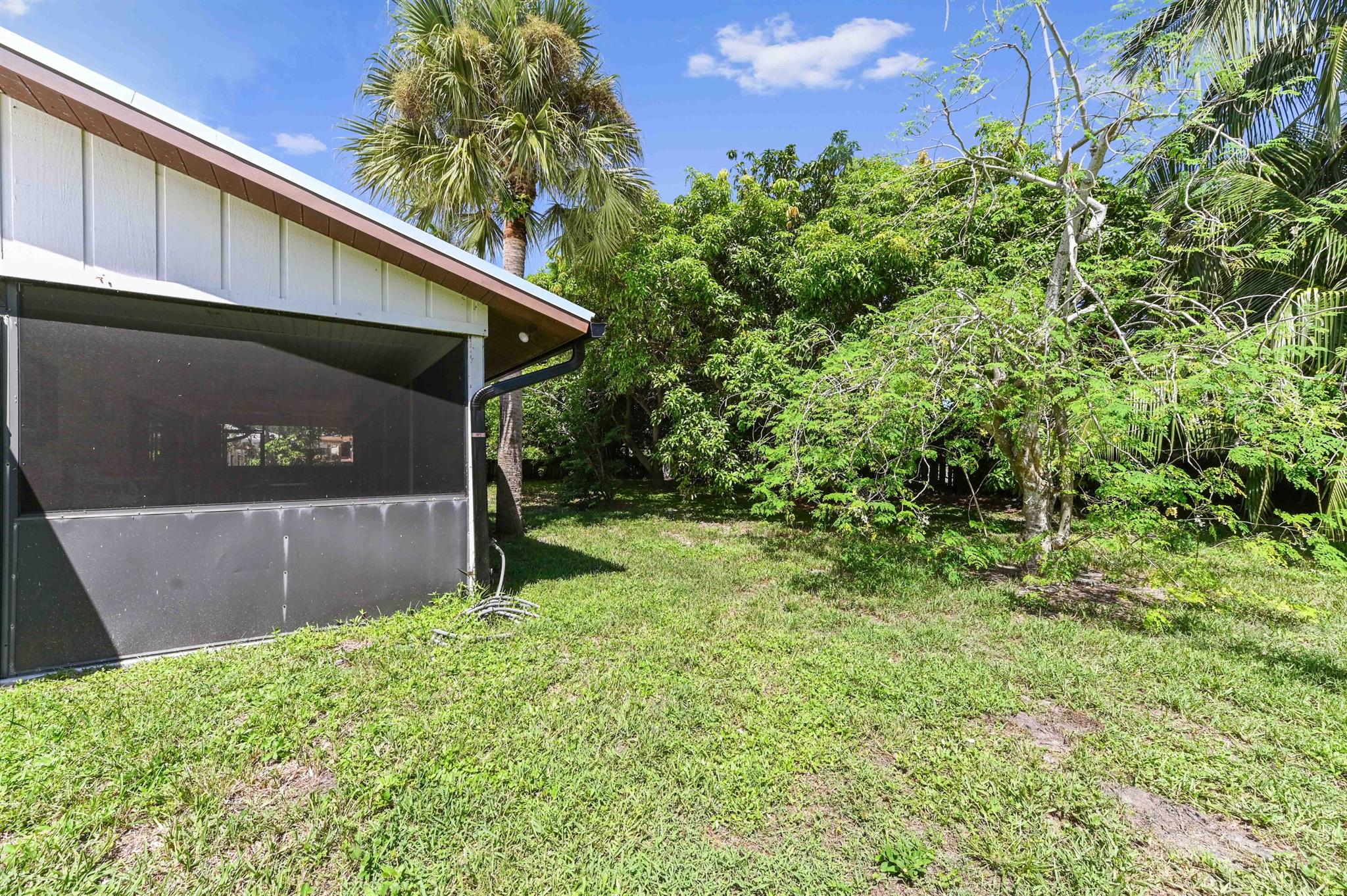 Welcome to this charming and beautiful 3 bedrooms and 2 bathrooms home, perfectly situated on a quiet desirable Hobe Sound community. The home offers immediate curb appeal, featuring a durable, modern NEW metal ROOF and a lush, tropical setting with mature shade trees and palms. Step through the handsome double entry doors into a welcoming interior defined by an open floor plan and bright tile flooring. The living room is a true centerpiece, boasting a dramatic, high vaulted ceiling with exposed wood beams and a cozy built-in area, creating a warm and expansive space for both relaxation and entertaining.