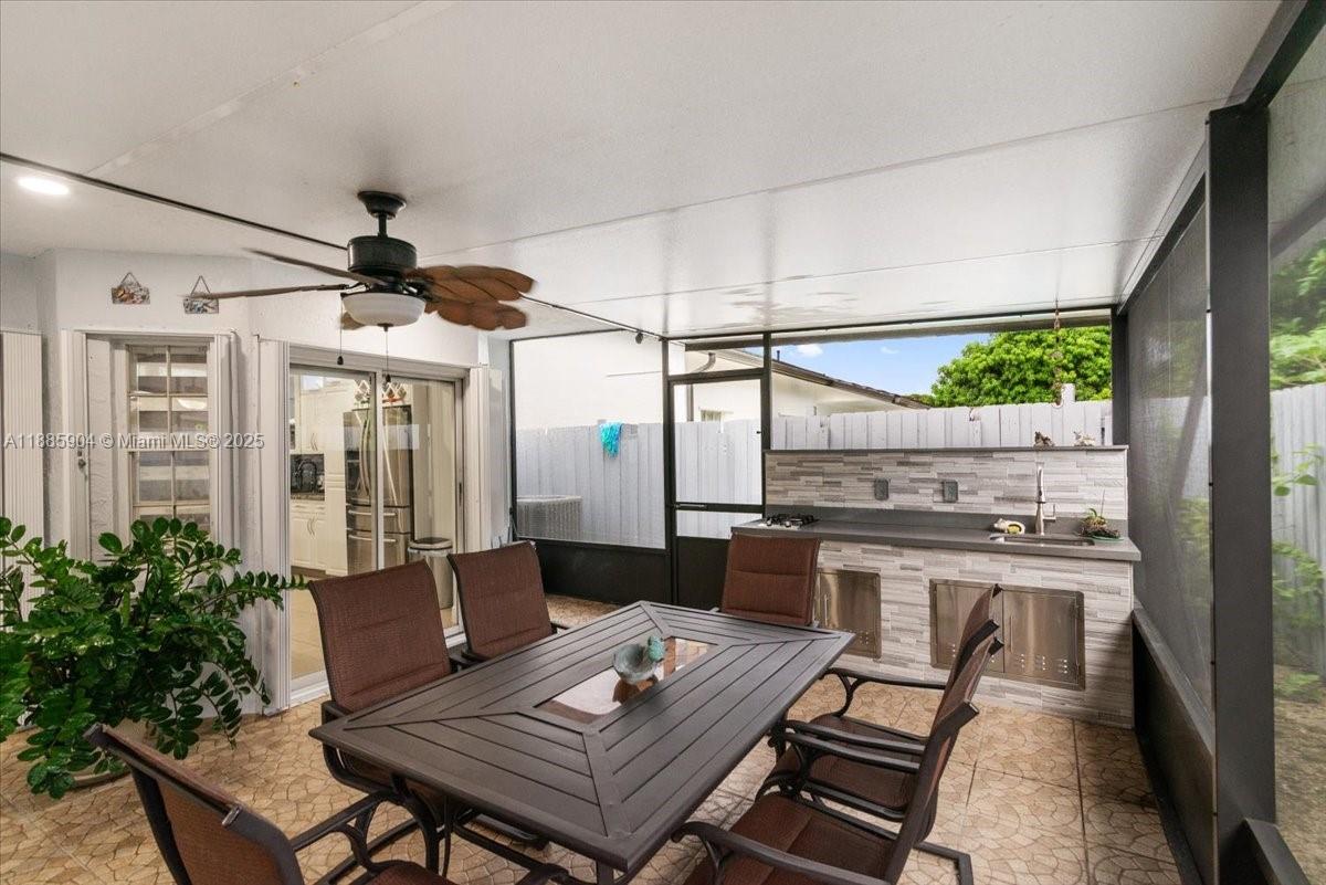 This 4-bedroom, 2-bathroom SW Miami-Dade residence offers the perfect balance of sophistication and comfort. A welcoming façade with stone columns and tropical palms leads into light-filled living spaces accented by crystal lighting and polished finishes. The gourmet kitchen features granite counters, custom cabinetry, and stainless steel appliances, flowing into dining and family areas designed for togetherness. Retreat to spacious bedrooms, spa-inspired baths, or the private office/utility room. Step outside to a screened terrace with summer kitchen and lounge. Boasting a NEW 2022 roof, gas water heater, and no HOA, this home is ideally located near medical, shopping, and entertainment like Miami Zoo with top-rated schools close by —blending modern elegance with family lifestyle appeal.