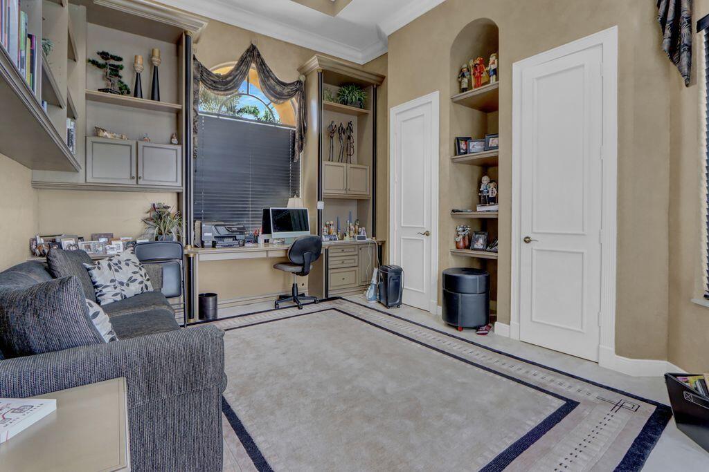 GOLF MEMBERSHIP AVAILABLE & CAN CLOSE BY OCT 31! Don't miss this opportunity for a GOLF MEMBERSHIP DAY 1 before the increase in initiation & transferability. This charming one-story courtyard of 3 bedrooms + office, 31/2 baths & 3-car garage is elegant & tastefully appointed featuring volume ceilings with crown moldings; Saturnia marble floors & neutral carpet; an inviting Living Room with an electric fireplace & wet bar; Family Room entertainment center; built-in office in Bedroom 4; solid core molded doors; custom window drapes & shades.The kitchen features maple cabinetry, granite counters,tumbled marble backsplash,butler's pantry and charming breakfast nook. Roof-2022; water heater-2023; pool resurfaced & tiles-2023; circular driveway;epoxy garage floor; accordion hurricane shutters.