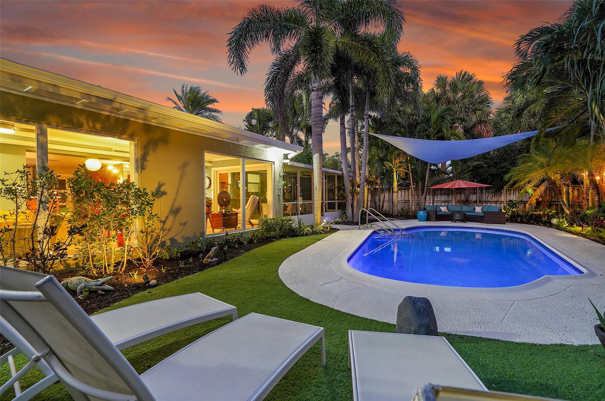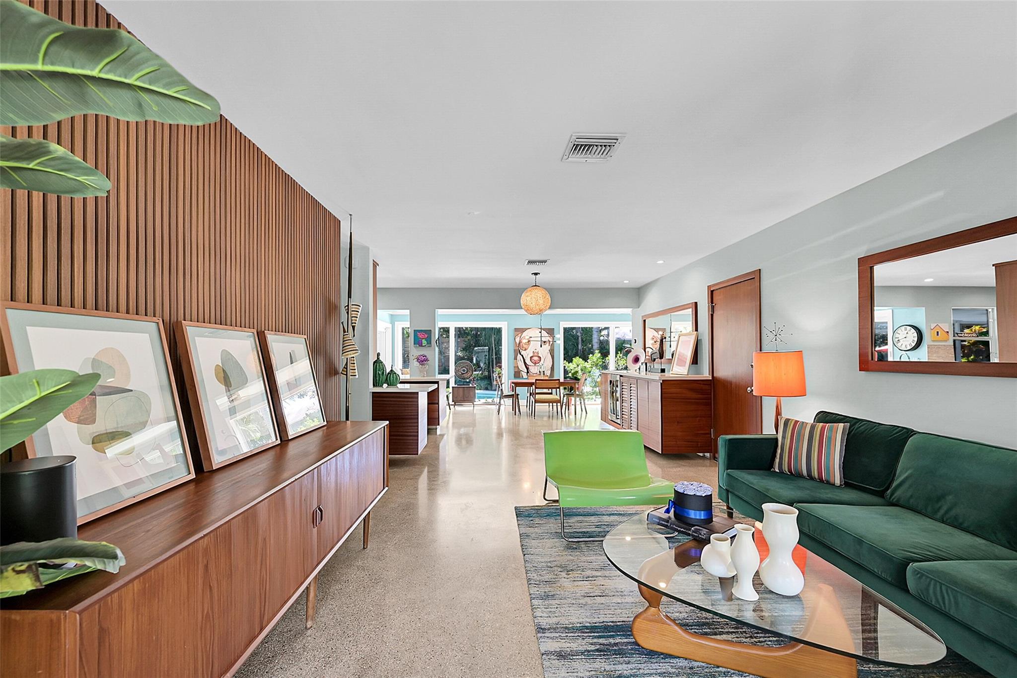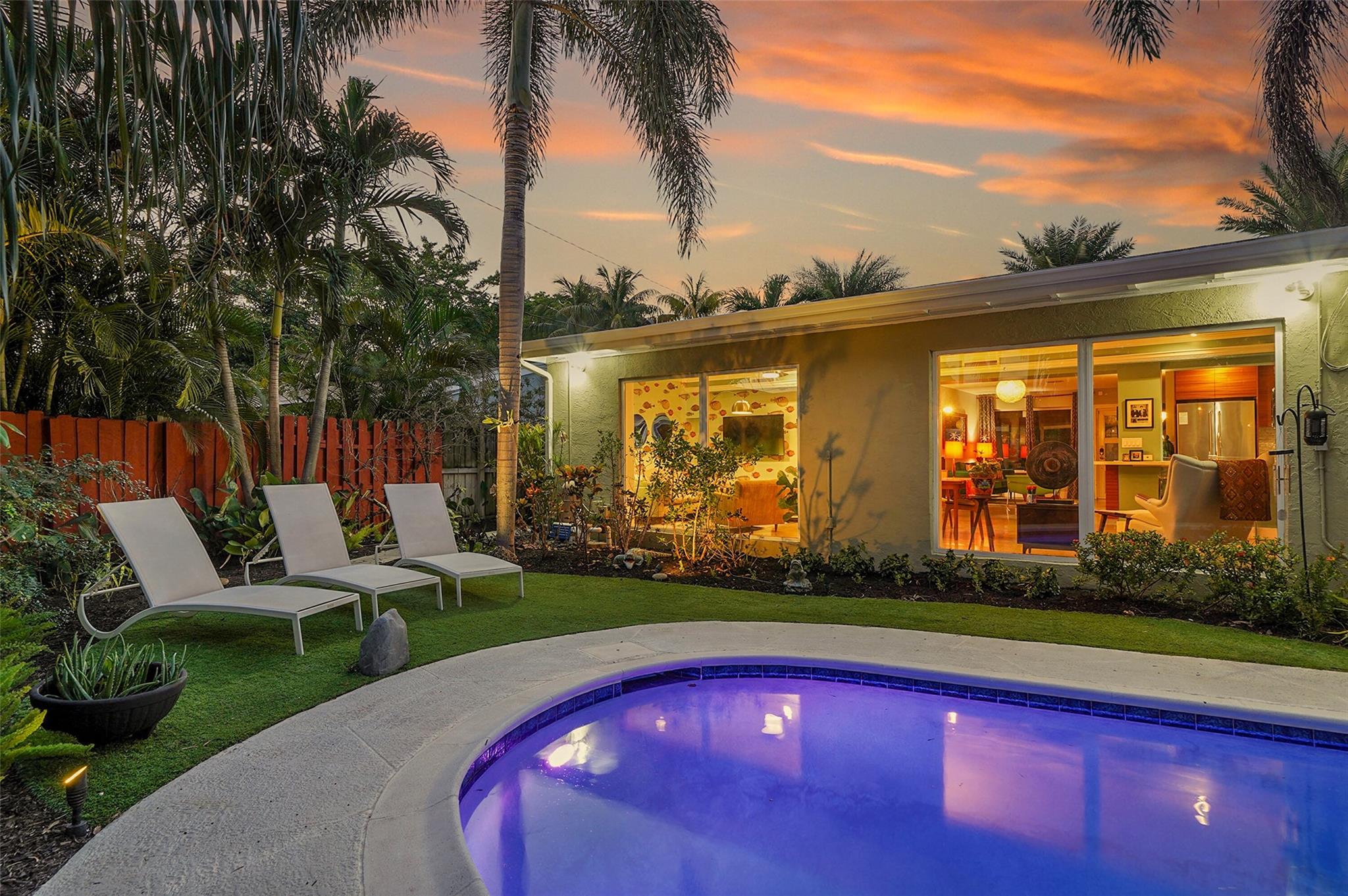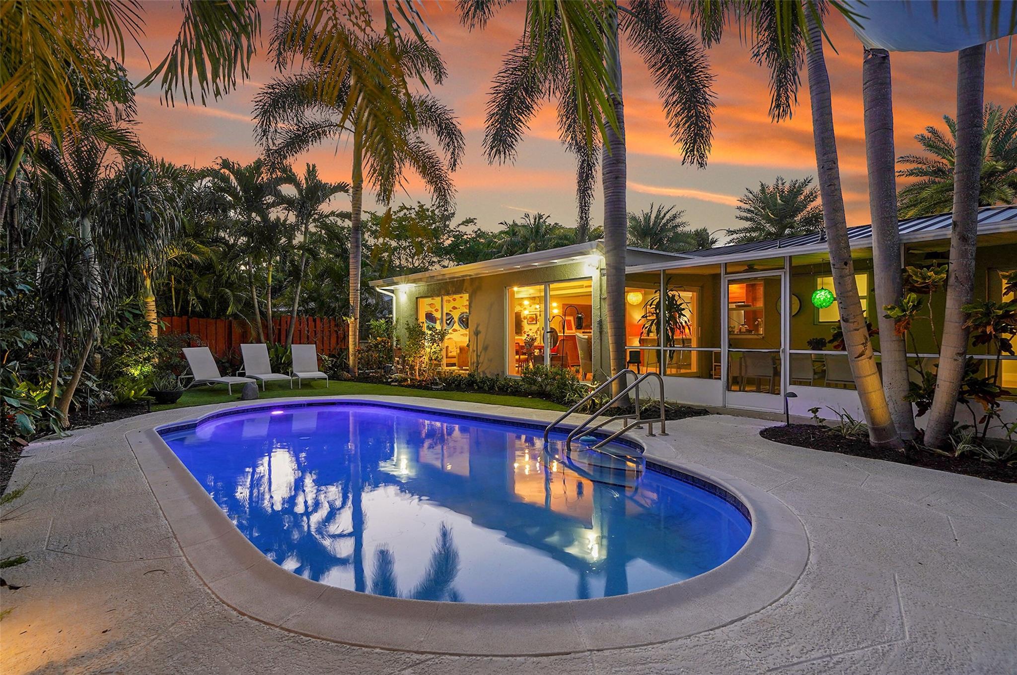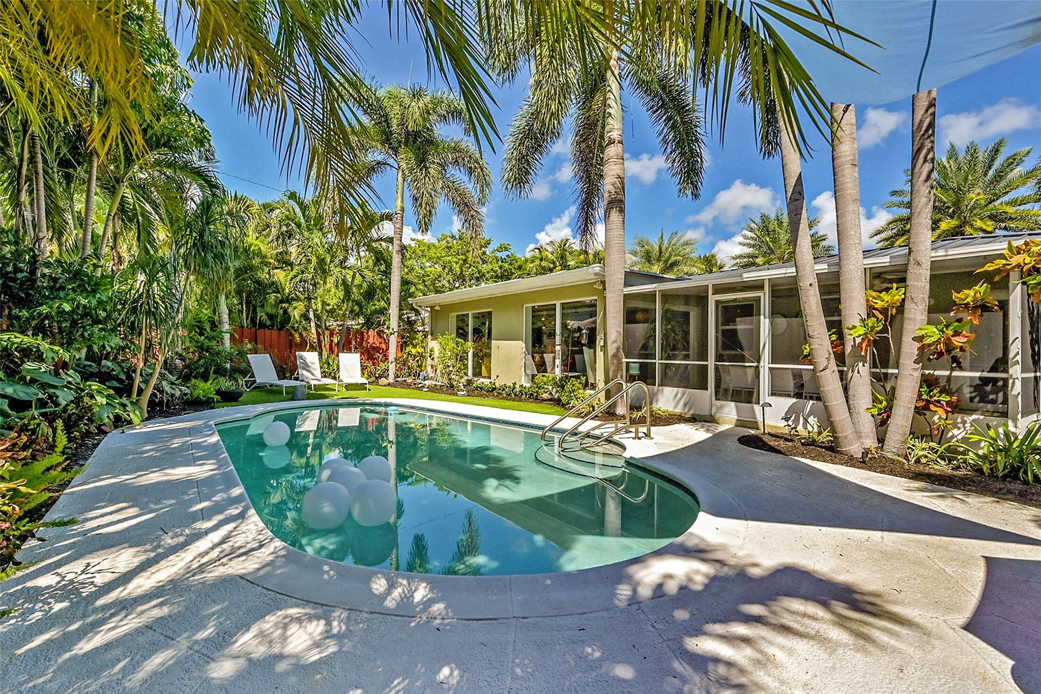 Experience the perfect fusion of mid-century modern design and today’s comforts in this 3BR/2BA Wilton Manors treasure. Ideally located minutes from Wilton Drive, shopping, dining, and the beaches. Light-filled open concept living showcases a stunning kitchen with stainless steel appliances, custom cabinetry, and terrazzo floors that flow throughout. Expansive impact doors and windows frame lush tropical views. Recent upgrades include a 2025 roof, renovated baths, and whole-house generator hook-up. The flexible 3rd bedroom doubles as a den or office. Relax on the screened porch overlooking landscaped gardens, dramatic lighting, and heated pool. A 1-car garage adds convenience to this private retreat making it a perfect blend of style, function, and location.