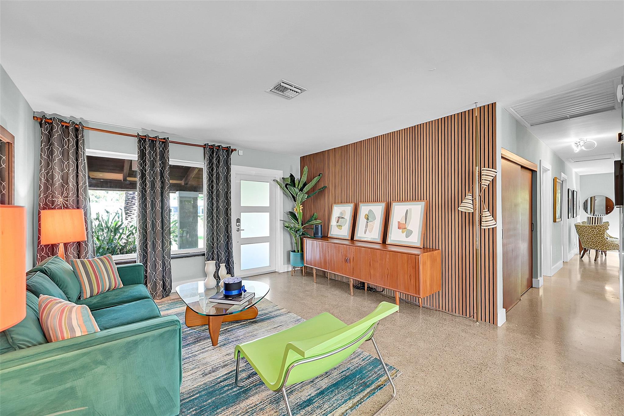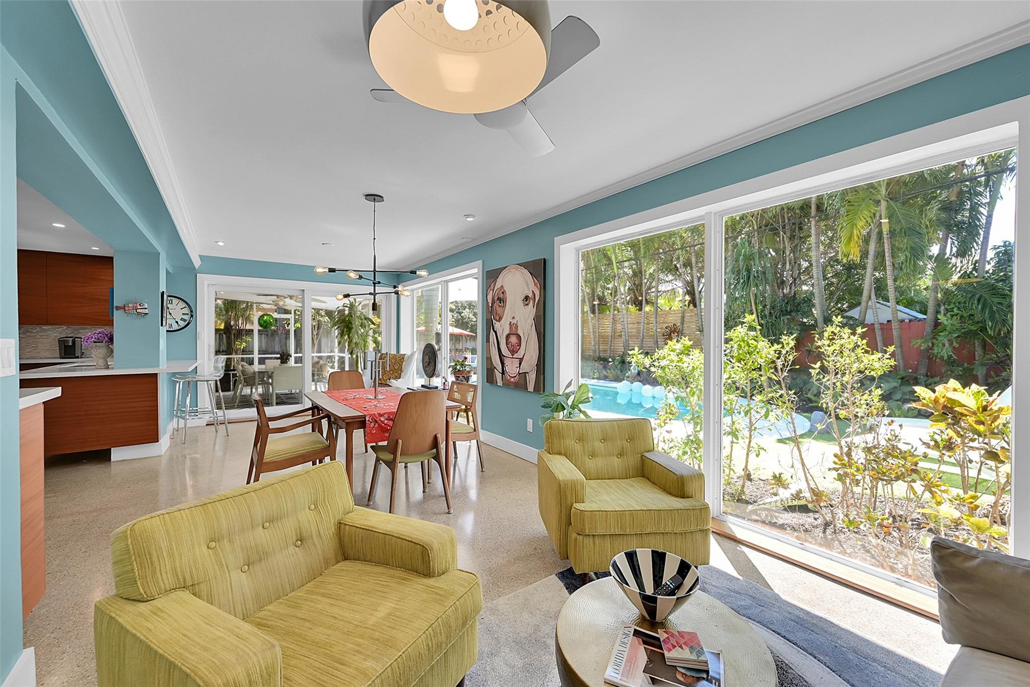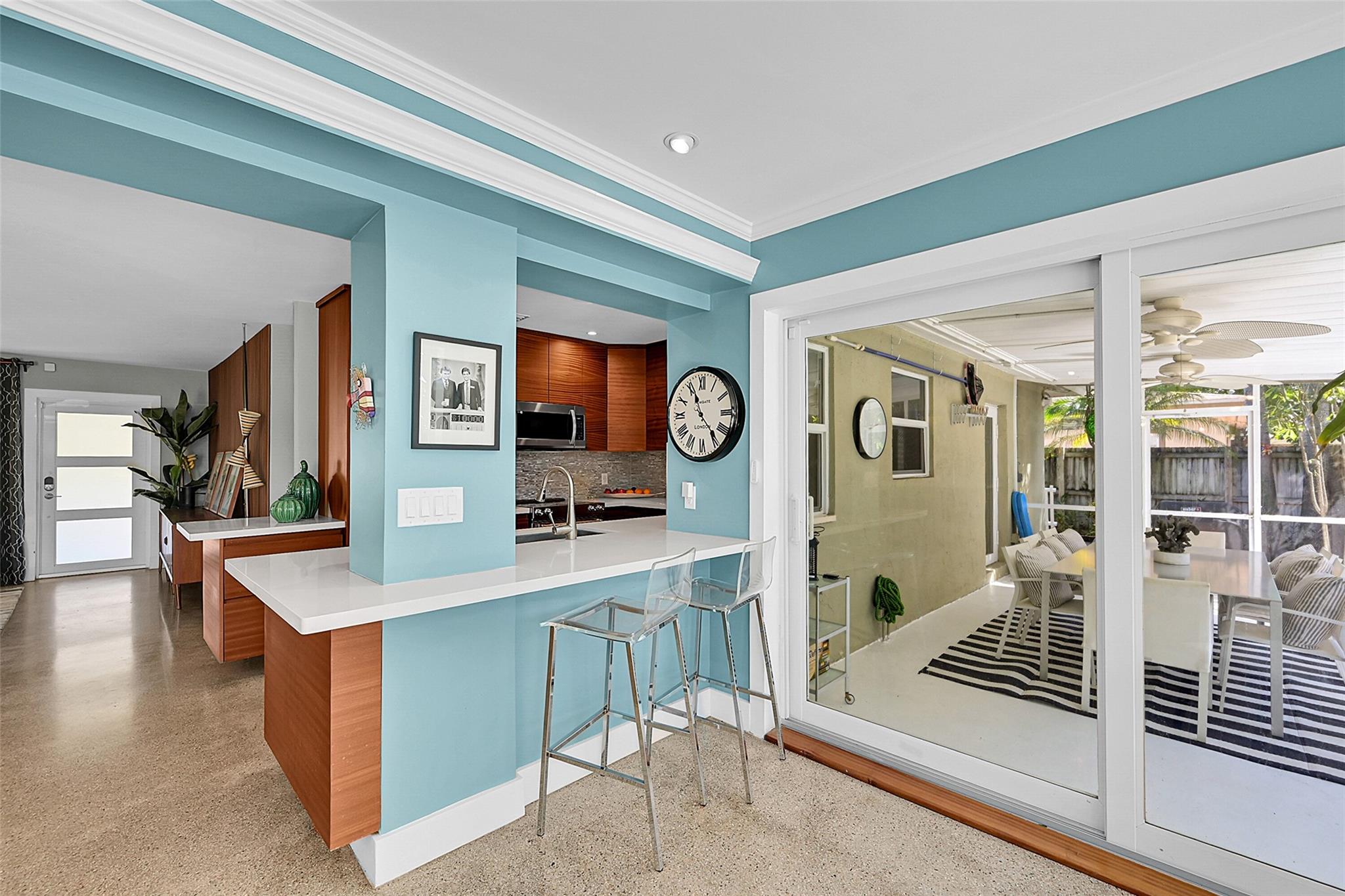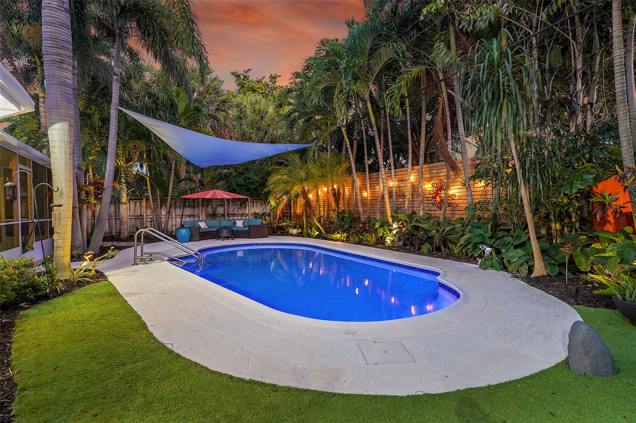 Experience the perfect fusion of mid-century modern design and today’s comforts in this 3BR/2BA Wilton Manors treasure. Ideally located minutes from Wilton Drive, shopping, dining, and the beaches. Light-filled open concept living showcases a stunning kitchen with stainless steel appliances, custom cabinetry, and terrazzo floors that flow throughout. Expansive impact doors and windows frame lush tropical views. Recent upgrades include a 2025 roof, renovated baths, and whole-house generator hook-up. The flexible 3rd bedroom doubles as a den or office. Relax on the screened porch overlooking landscaped gardens, dramatic lighting, and heated pool. A 1-car garage adds convenience to this private retreat making it a perfect blend of style, function, and location.