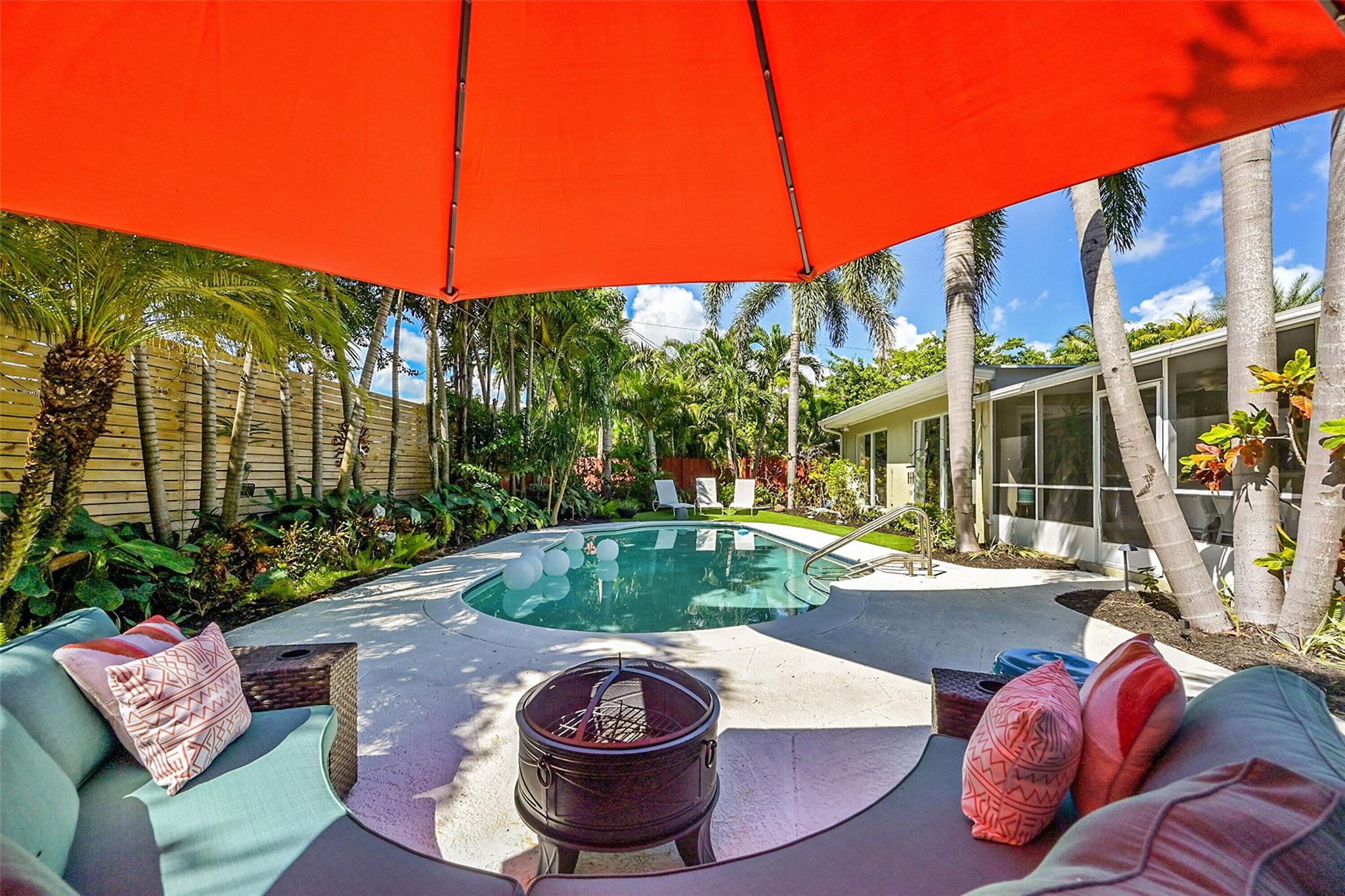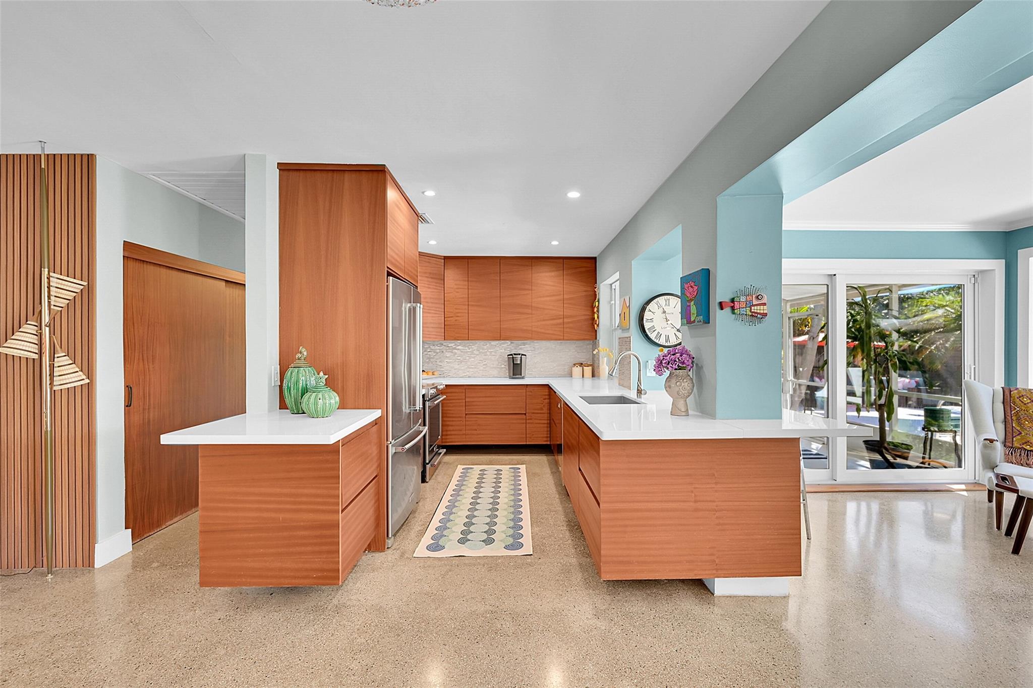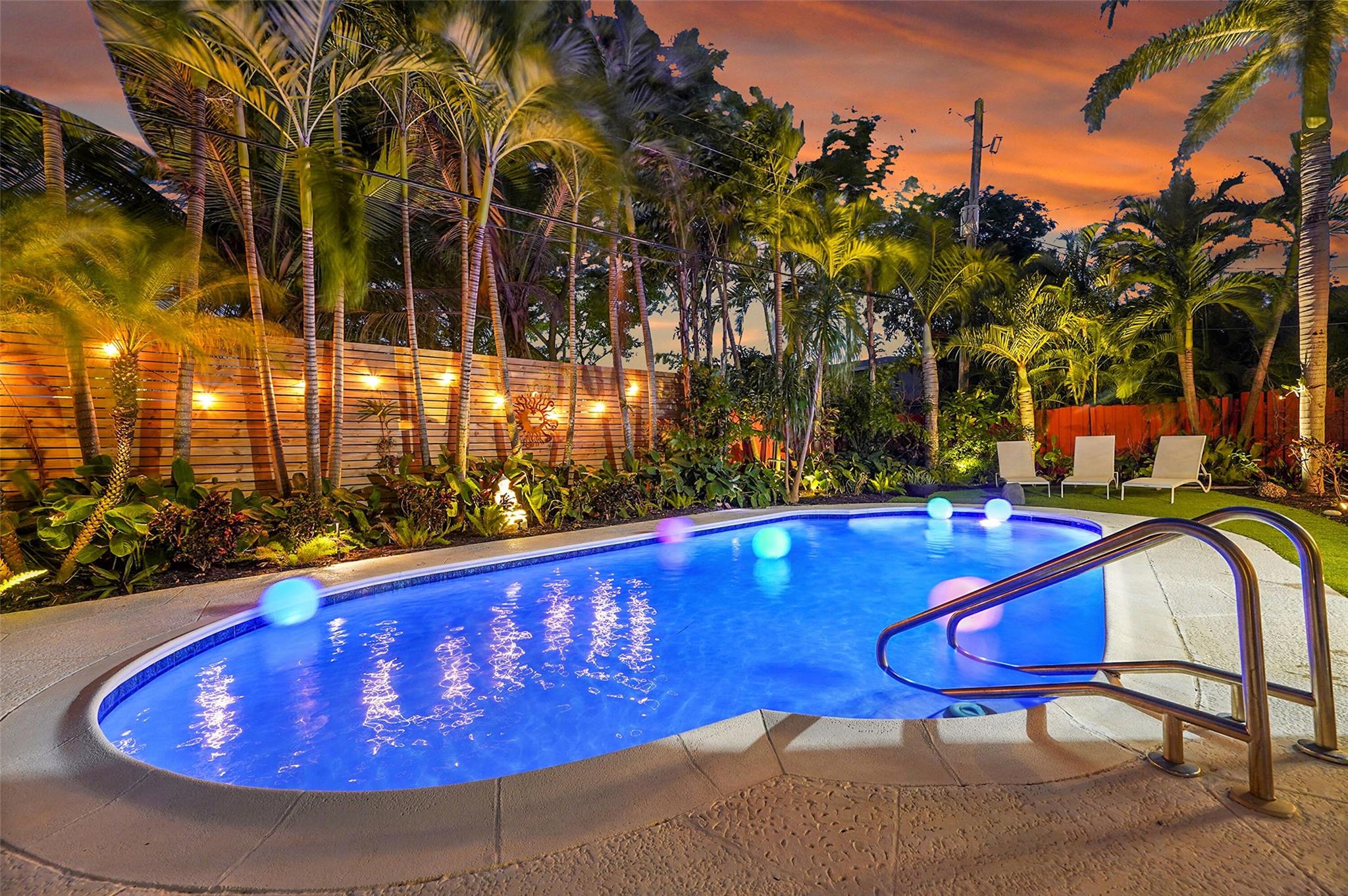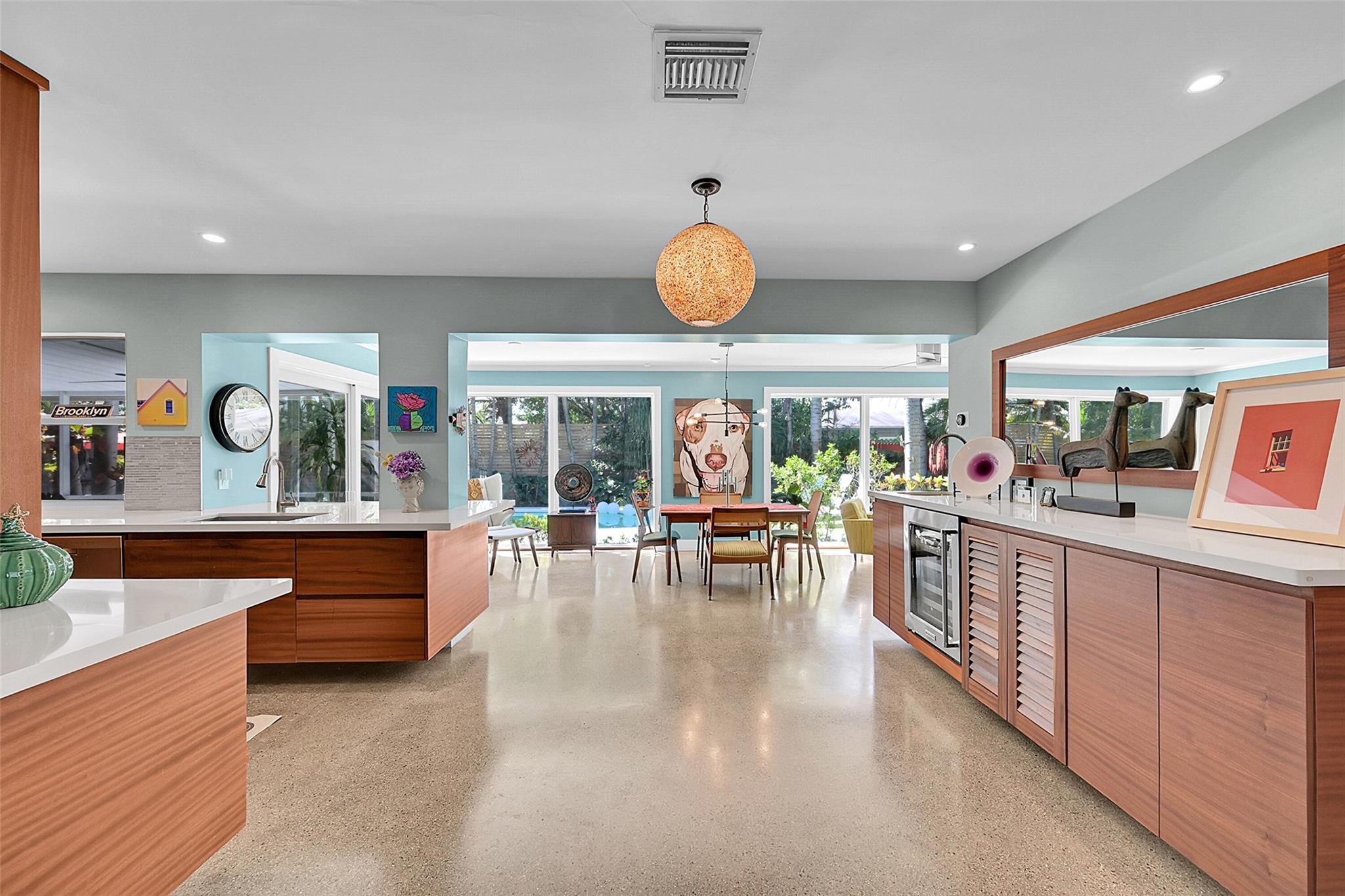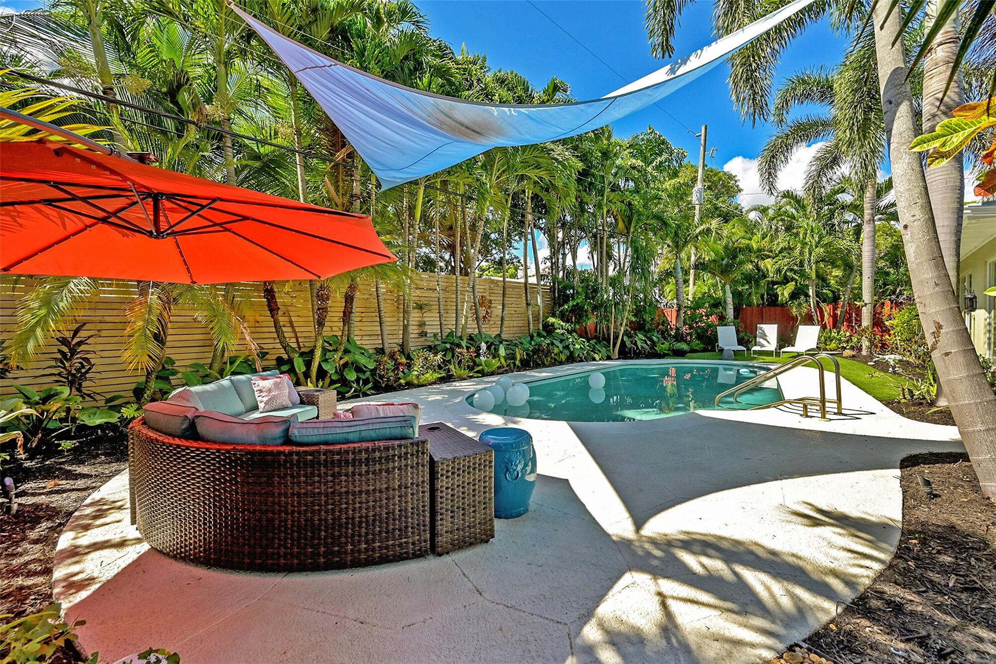 Experience the perfect fusion of mid-century modern design and today’s comforts in this 3BR/2BA Wilton Manors treasure. Ideally located minutes from Wilton Drive, shopping, dining, and the beaches. Light-filled open concept living showcases a stunning kitchen with stainless steel appliances, custom cabinetry, and terrazzo floors that flow throughout. Expansive impact doors and windows frame lush tropical views. Recent upgrades include a 2025 roof, renovated baths, and whole-house generator hook-up. The flexible 3rd bedroom doubles as a den or office. Relax on the screened porch overlooking landscaped gardens, dramatic lighting, and heated pool. A 1-car garage adds convenience to this private retreat making it a perfect blend of style, function, and location.