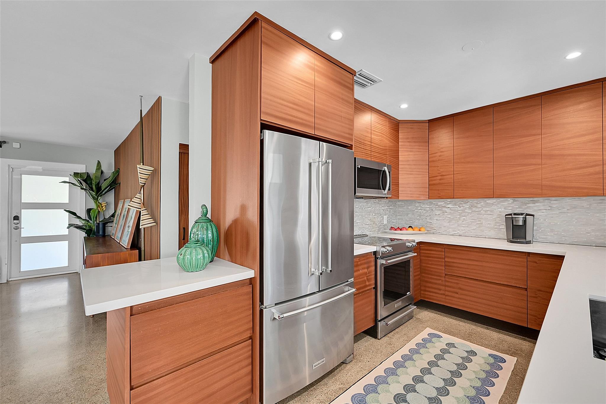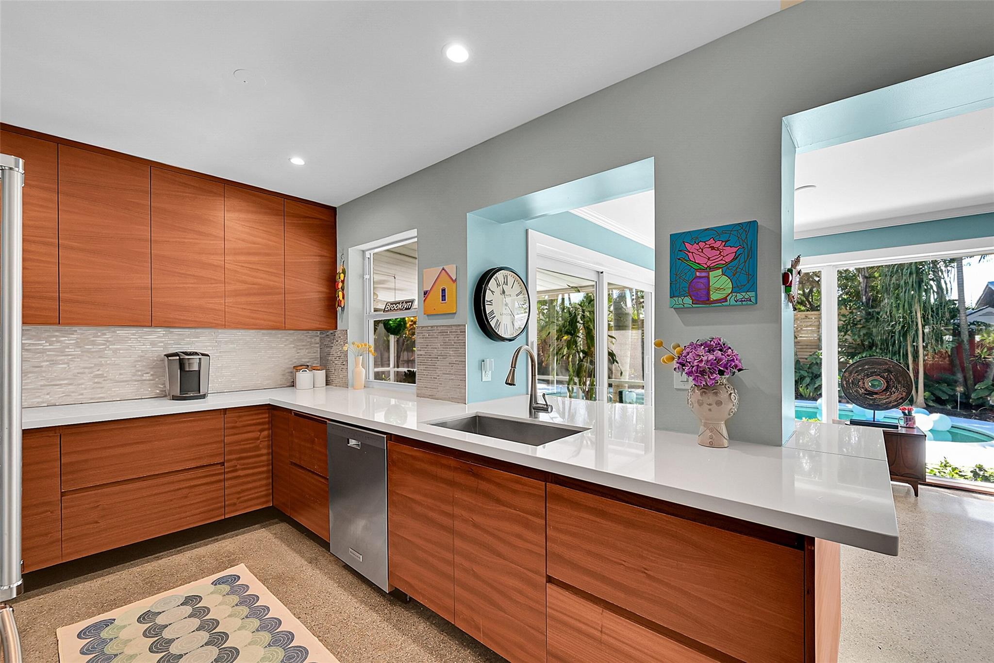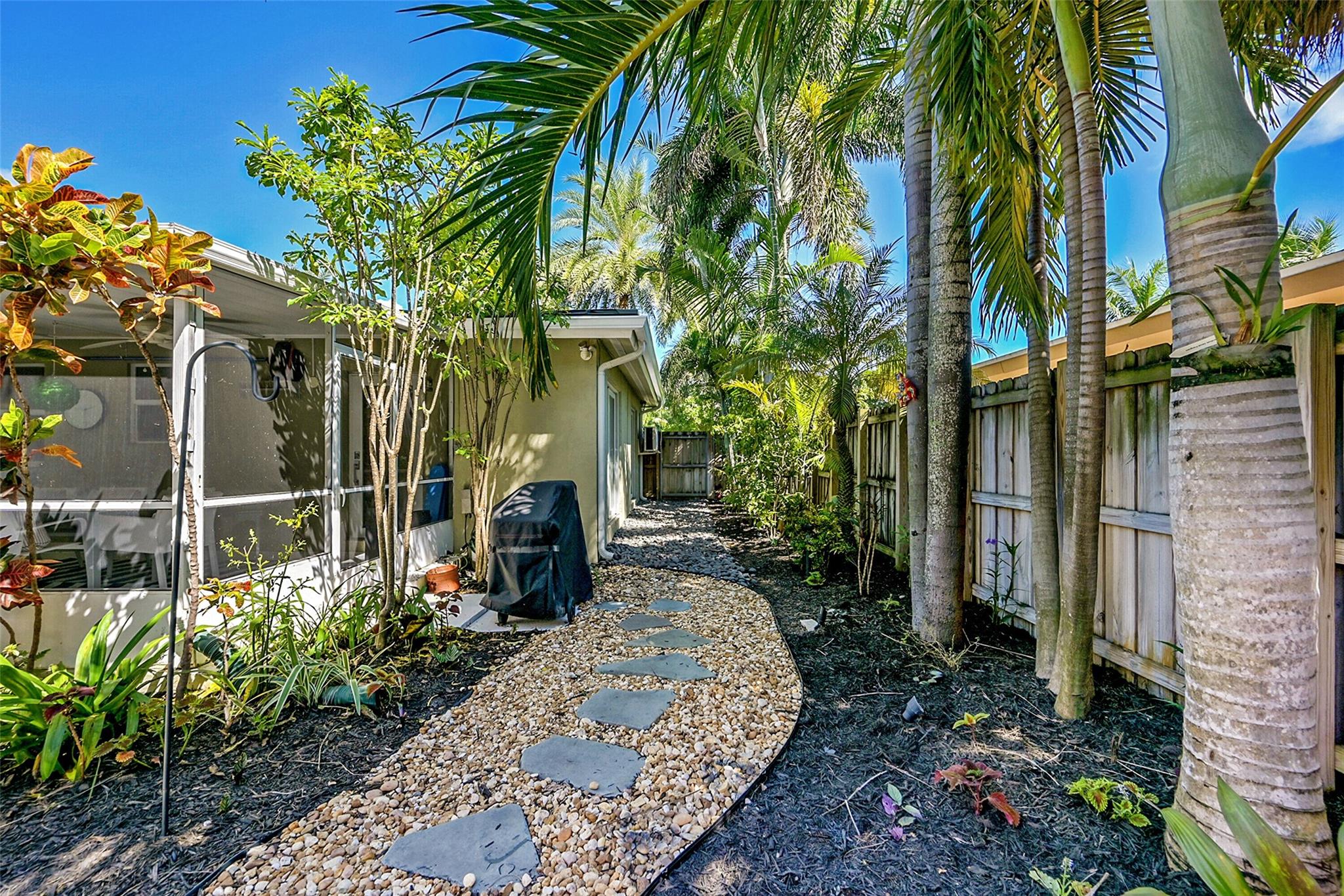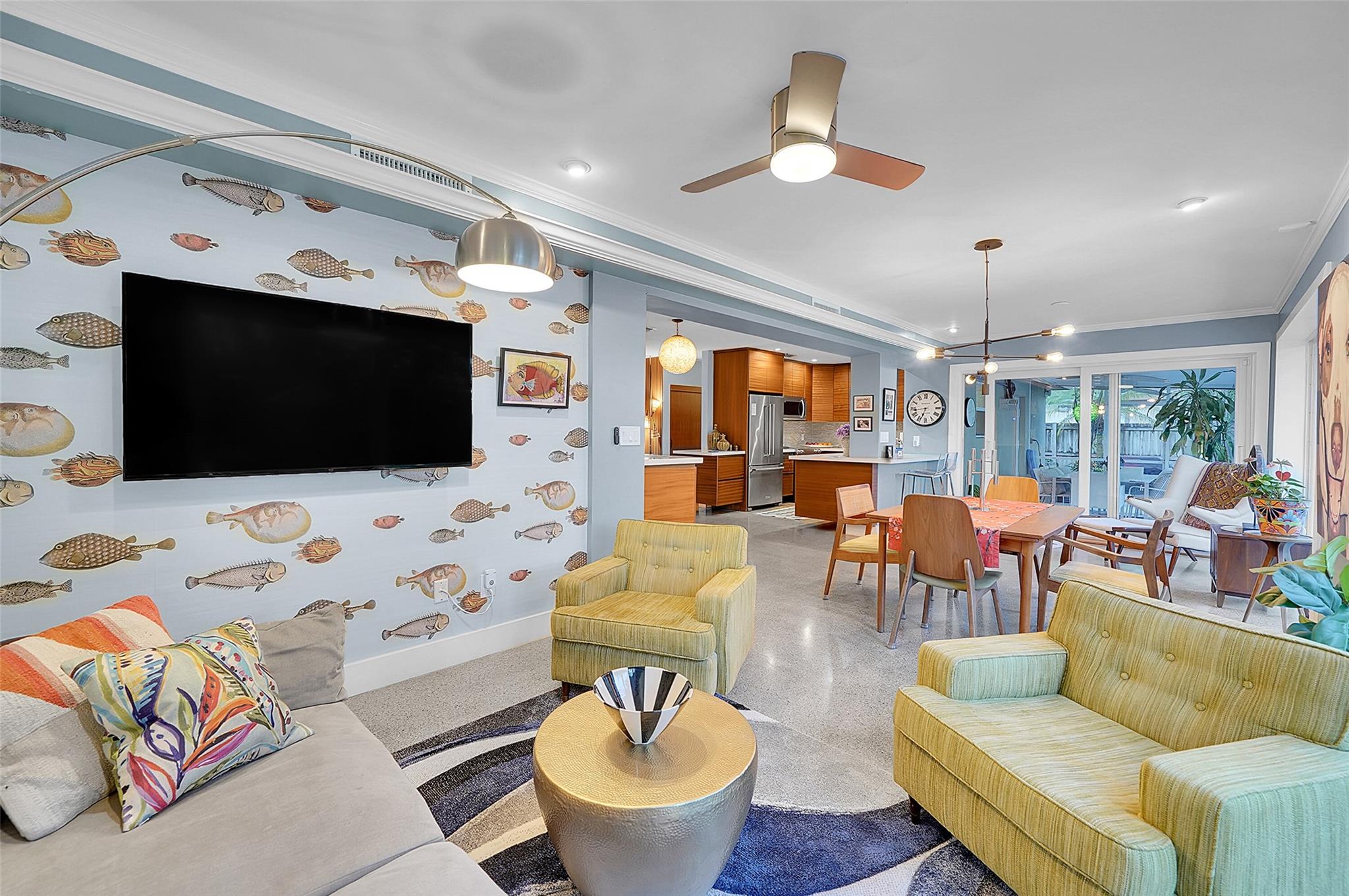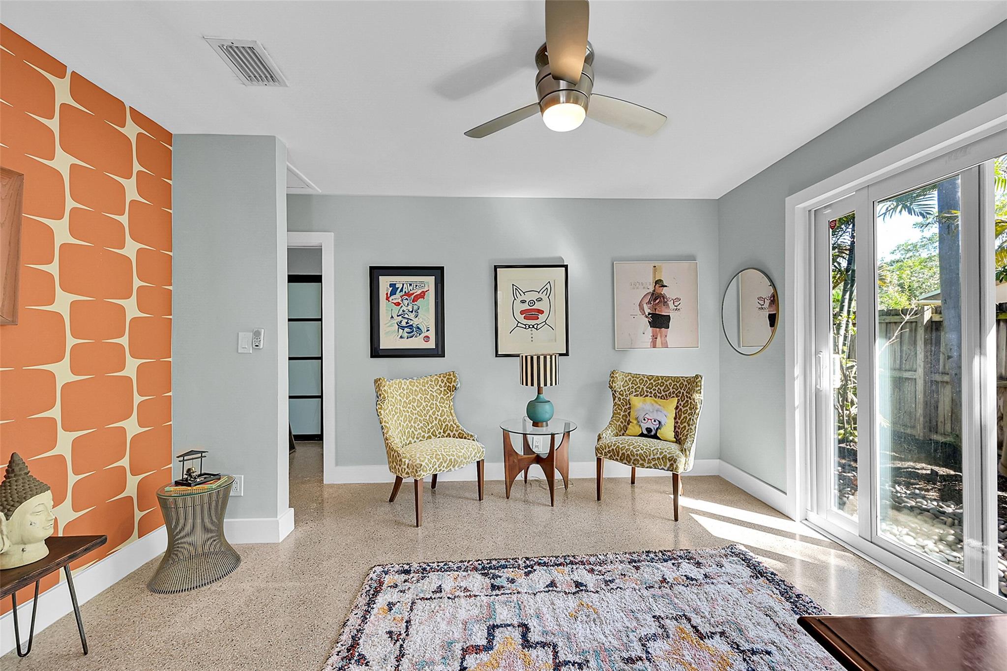 Experience the perfect fusion of mid-century modern design and today’s comforts in this 3BR/2BA Wilton Manors treasure. Ideally located minutes from Wilton Drive, shopping, dining, and the beaches. Light-filled open concept living showcases a stunning kitchen with stainless steel appliances, custom cabinetry, and terrazzo floors that flow throughout. Expansive impact doors and windows frame lush tropical views. Recent upgrades include a 2025 roof, renovated baths, and whole-house generator hook-up. The flexible 3rd bedroom doubles as a den or office. Relax on the screened porch overlooking landscaped gardens, dramatic lighting, and heated pool. A 1-car garage adds convenience to this private retreat making it a perfect blend of style, function, and location.