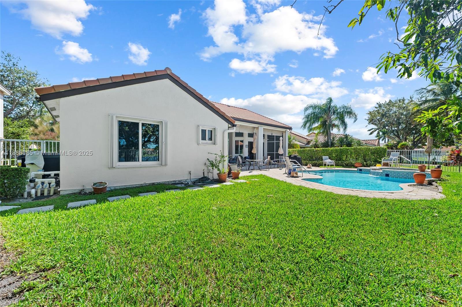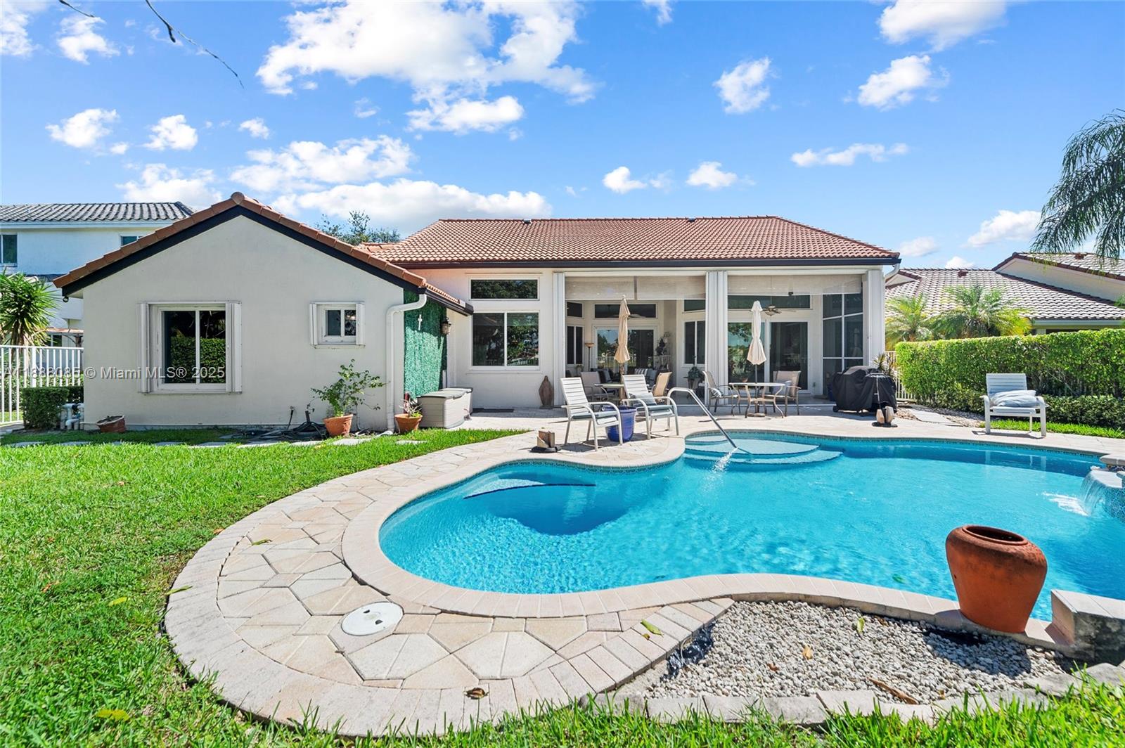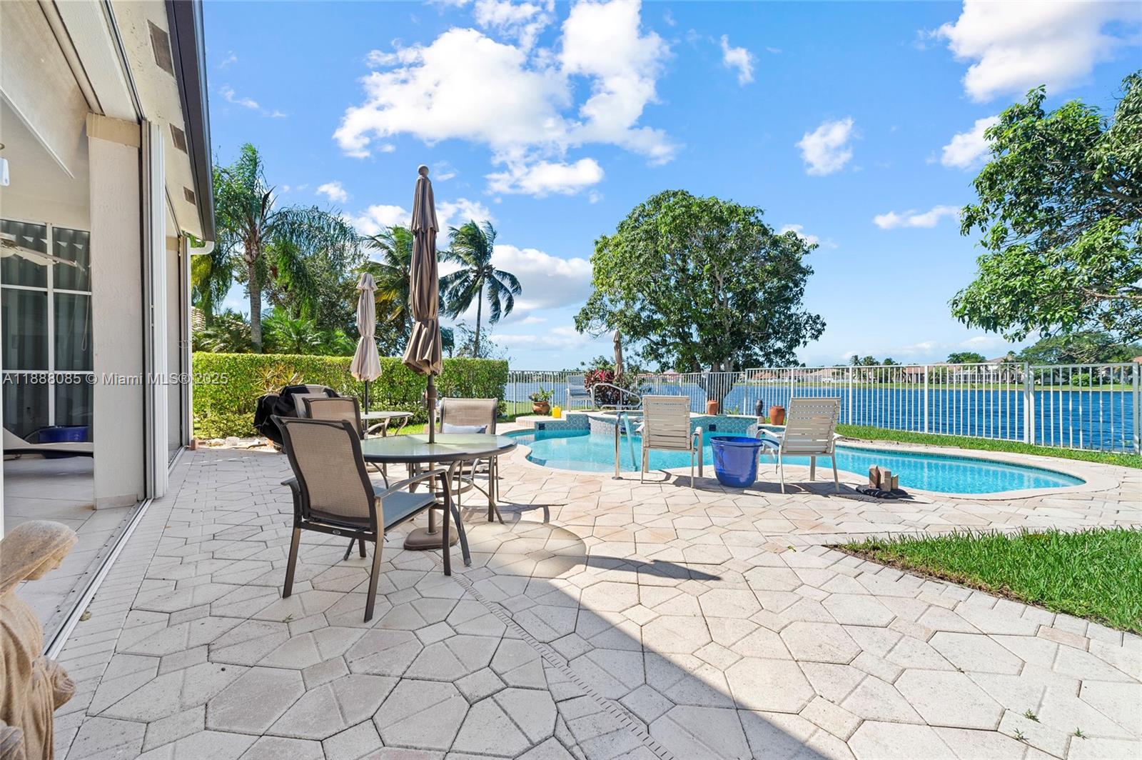 Set on one of Weston’s largest lakes at The Lakes. Standout home perfect for a large family and effortless indoor-outdoor entertaining. 4BR, 3.5BA with a 2008 barrel-tile roof, impact windows and garage door, and accordion shutters. Bright, open interiors with plenty of natural light. All-porcelain flooring and LED lighting. Kitchen remodeled (2018) with granite, LG refrigerator, Samsung range (2018), and GE Profile microwave (2019). Primary suite with two walk-in closets and a 2018 spa bath with marble floors, large shower, and separate soaking tub. Resurfaced pool & spa (2024) with new lighting/handrails and a new heater (2024), plus fenced yard. Tankless water heater (2023). Guard-gated, with pool, playground, and fields. Prime Weston location near A-rated schools, parks, and shopping.