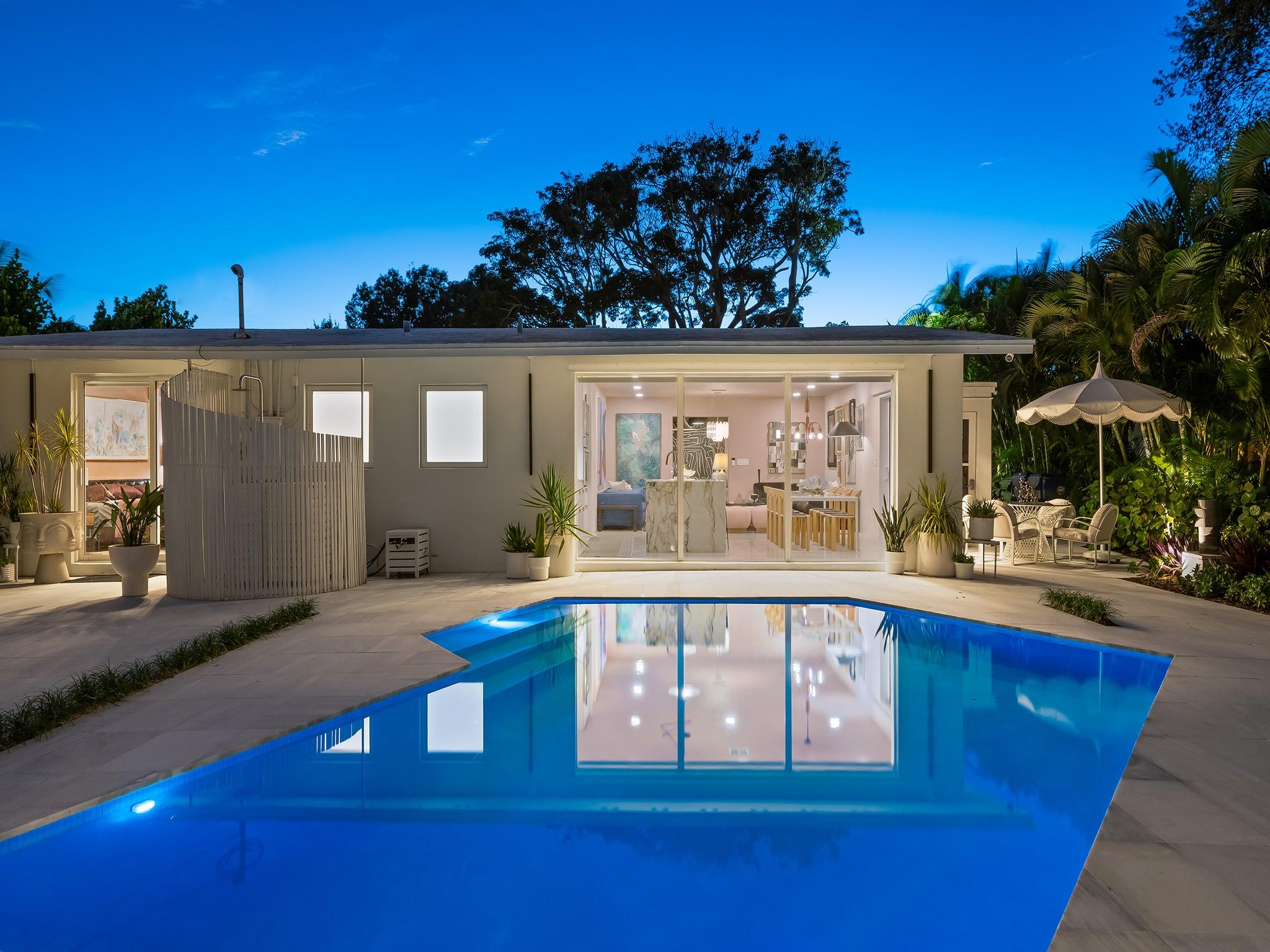 This designer-owned residence has been thoughtfully reimagined and meticulously renovated with both mid-century modern style and function in mind. The open concept living area has natural light from floor-to-ceiling windows with views of the expansive backyard and resort-style pool. You'll also find a bonus room for an office or den. Designer touches are everywhere, from terrazzo floors and porcelain-tiled baths to the kitchen featuring high-end appliances. Updates include all new electrical, PVC plumbing and hurricane protection. Set on a large lot, the private backyard is an entertainer's dream featuring a fully refurbished pool, honed Carrara marble pavers, an outdoor dining area, summer kitchen and dramatic evening lighting. Creative design, comfort and timeless appeal, it's all here.