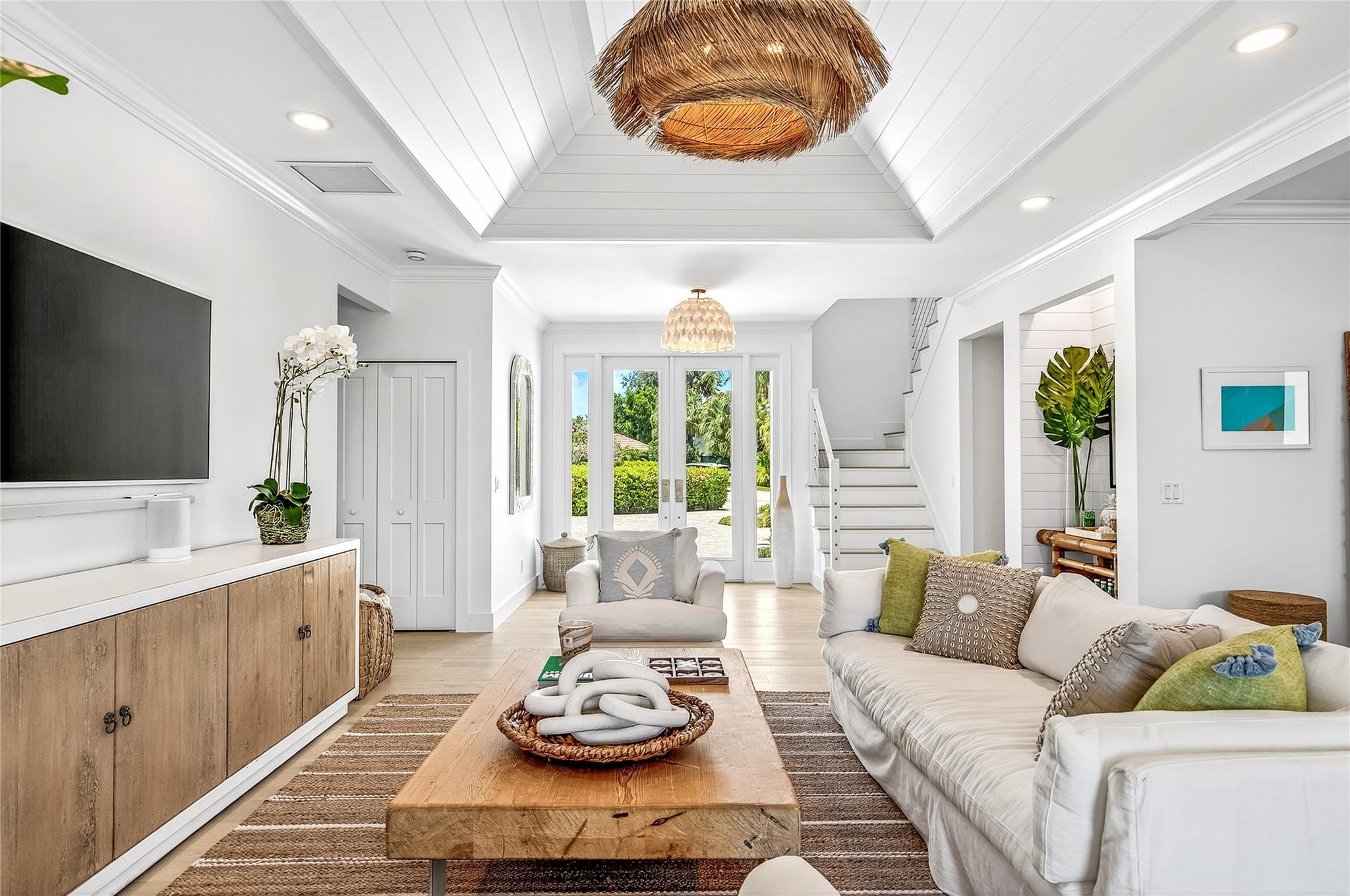 Stunning riverfront home completely reimagined with designer finishes. Relaxed coastal living with refined island-inspired style. Crisp white architectural lines, fresh coastal hues, open-concept light-filled interiors, natural textures, white oak flooring, custom lighting and millwork, elevated yet laid-back feel throughout every room. Multiple living spaces, large island kitchen, indoor/outdoor dining, 1st floor primary suite overlooking the pool, walk-in closets, option for 5th bedroom, all impact glass, new tropical landscaping, whole house water softening system, oversized 2car garage.