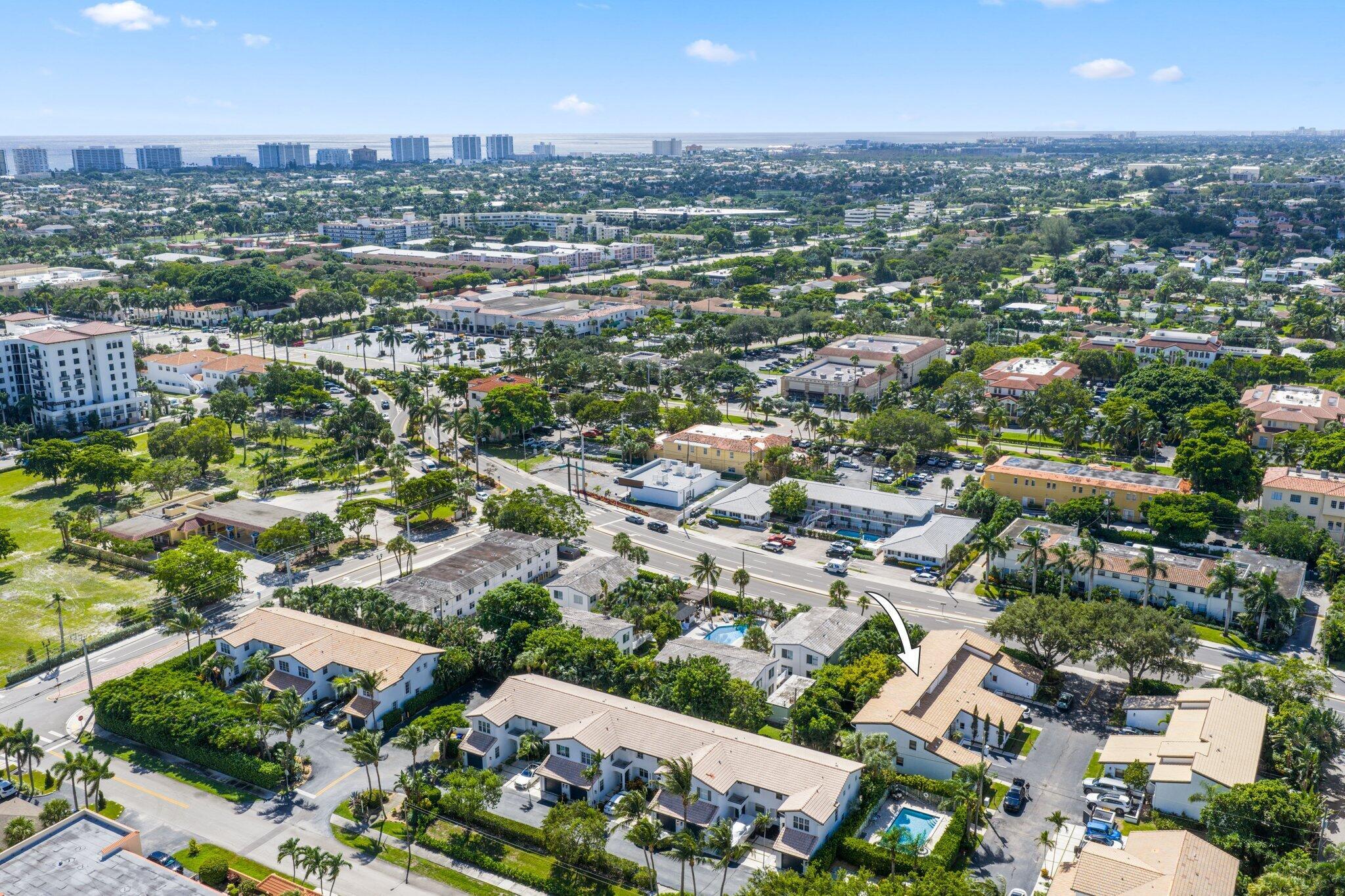 Experience the remarkable location of this updated townhome, offering 1,648 sf of living space. You are greeted indoors by travertine marble flooring and high ceilings that allow an abundance of natural light to flow through the numerous windows. The kitchen is equipped with granite countertops, wooden cabinets, and modern stainless steel appliances. The downstairs features a spacious bedroom, an updated full bath, ample closet space, and washer/dryer. The second floor is dedicated to the primary suite, including an ensuite bath with a soaking tub and a generous walk-in closet. Fenced-in private yard is complete with a deck and low-maintenance turf. The pool is located next to the unit and this boutique community is within walking distance of the beach, Mizner Park, shops and restaurants.